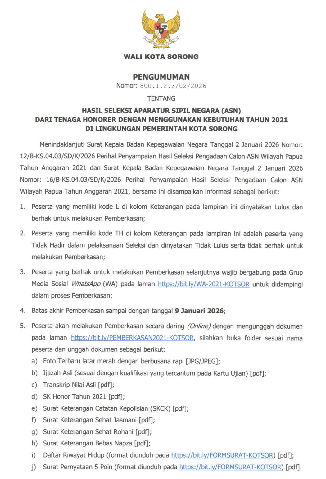 Selasa, 6 Januari 2026 16:08:03 HASIL SELEKSI APARATUR SIPIL NEGARA (ASN) DARI TENAGA HONORER DENGAN MENGGUNAKAN KEBUTUHAN TAHUN 2021 DI LINGKUNGAN PEMERINTAH KOTA SORONG