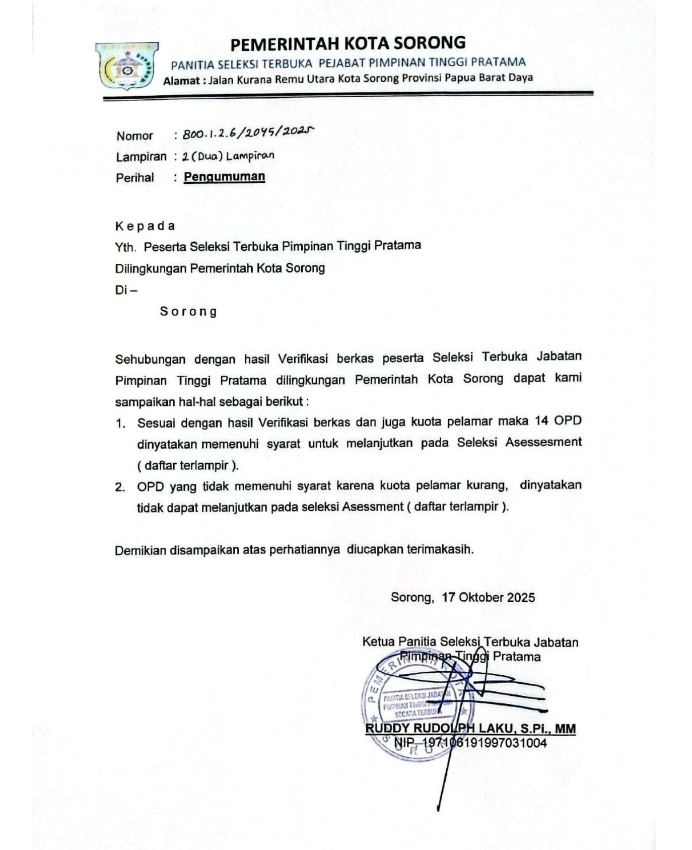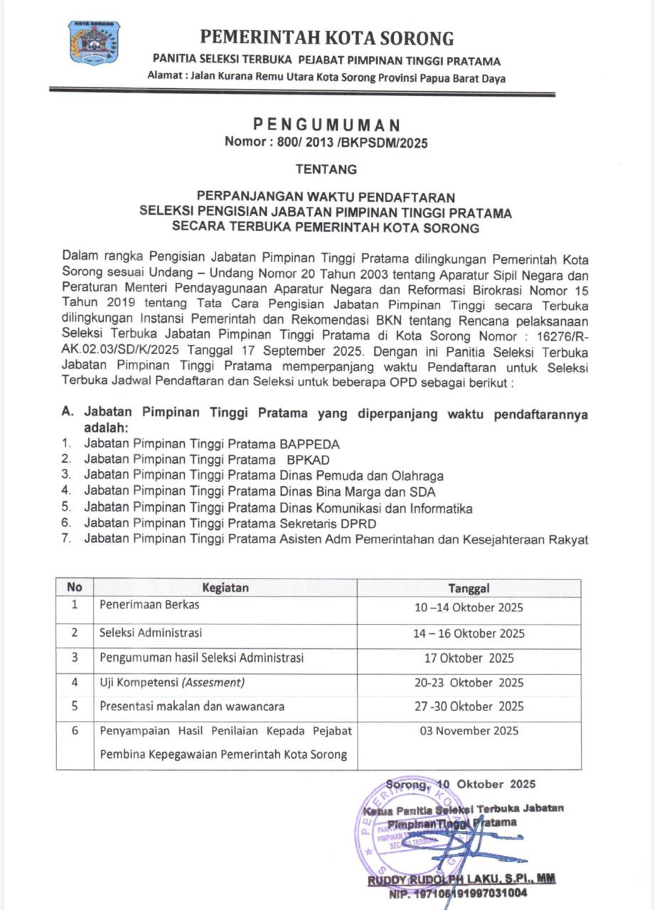 Perpanjangan Dalam rangka pengisian Jabatan Pimpinan Tinggi Pratama di Lingkungan Pemerintah Kota Sorong sesuai UU Nomor 20 Tahun 2023 tentang...