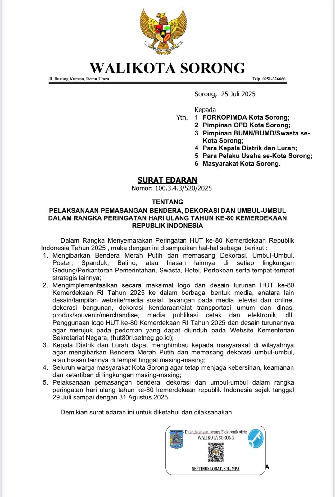 Edaran Pencanangan Bulan Natal Oikumene Pemerintah, bersama TNI/Polri, dan Masyarakat Kota Sorong