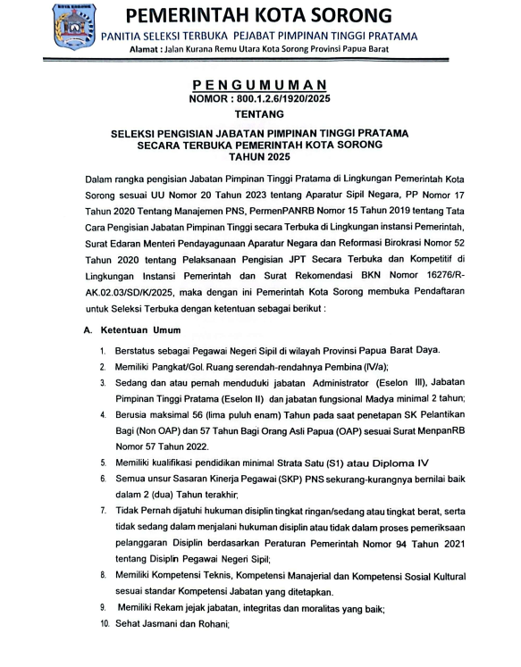 Dalam rangka pengisian Jabatan Pimpinan Tinggi Pratama di Lingkungan Pemerintah Kota Sorong sesuai UU Nomor 20 Tahun 2023 tentang...