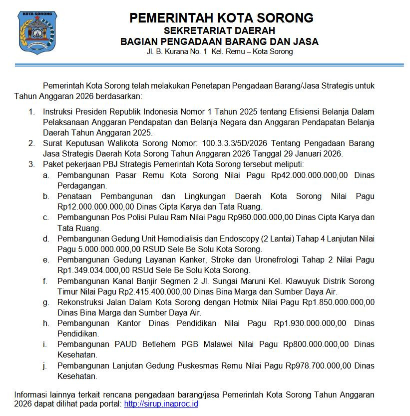 Informasi lainnya terkait rencana pengadaan barang/jasa Pemerintah Kota Sorong Tahun Anggaran 2026 dapat dilihat pada portal: http://sirup.inaproc.id