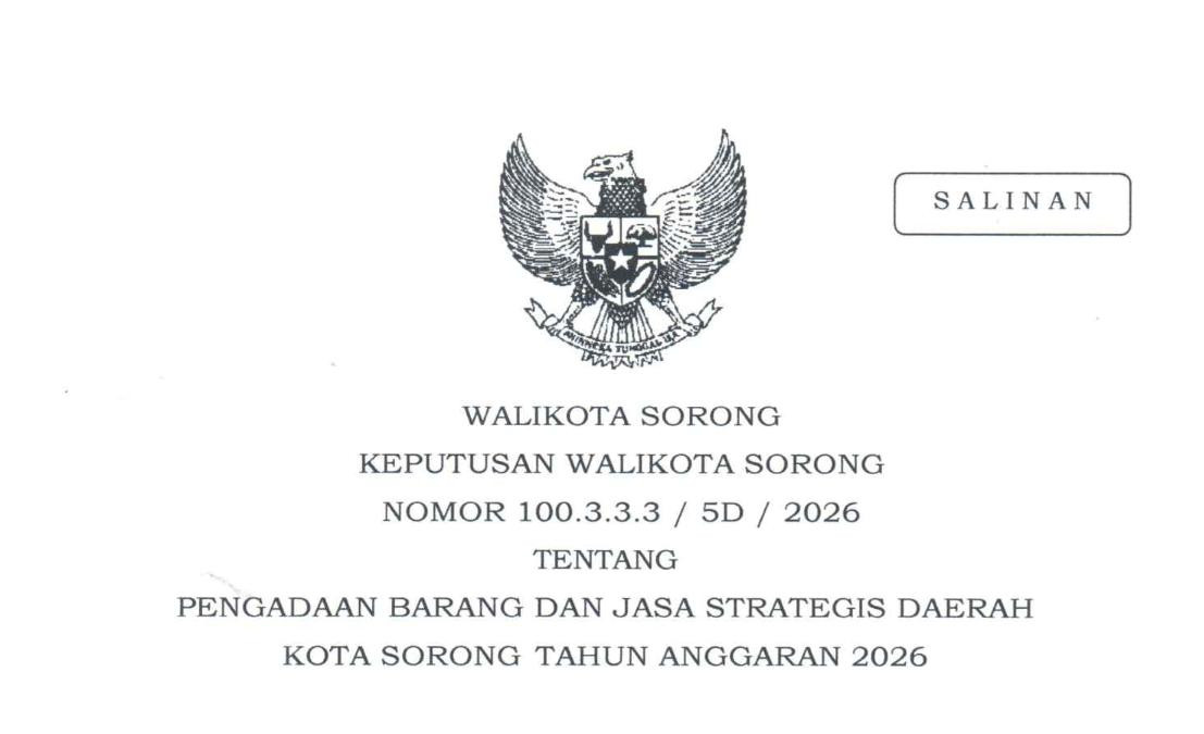 Surat Keputusan Walikota Sorong Nomor: 100.3.3.3/5D/2026 Tentang Pengadaan Barang Jasa Strategis Daerah Kota Sorong Tahun Anggaran 2026 Tanggal 29 Januari 2026.