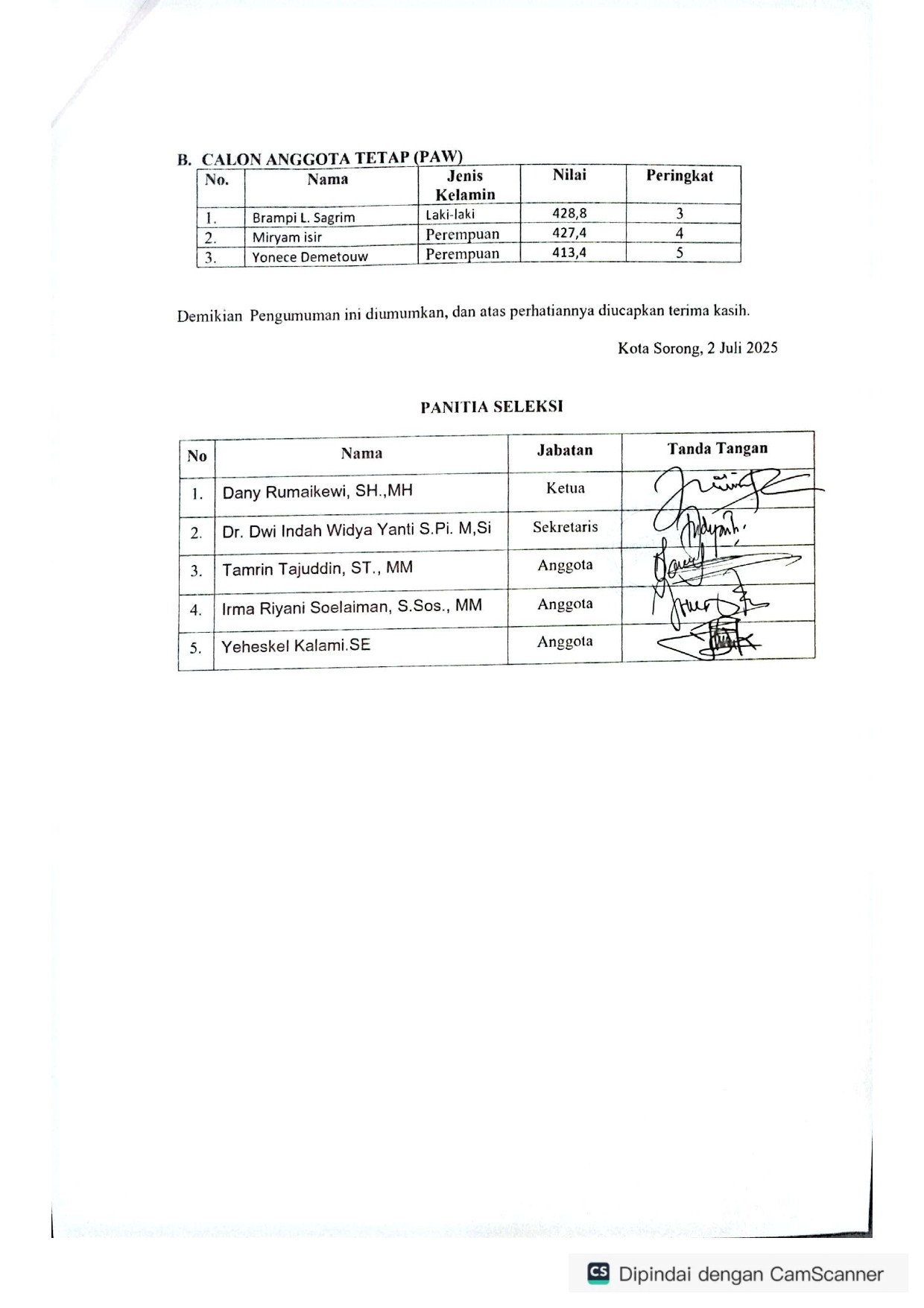 PENGUMUMAN NOMOR : 003-PENG/PANSEL/DPRK/KTS/VII/2025 PENGISIAN KEANGGOTAAN DEWAN PERWAKILAN RAKYAT KOTA SORONG MELALUI MEKANISME PENGANGKATAN