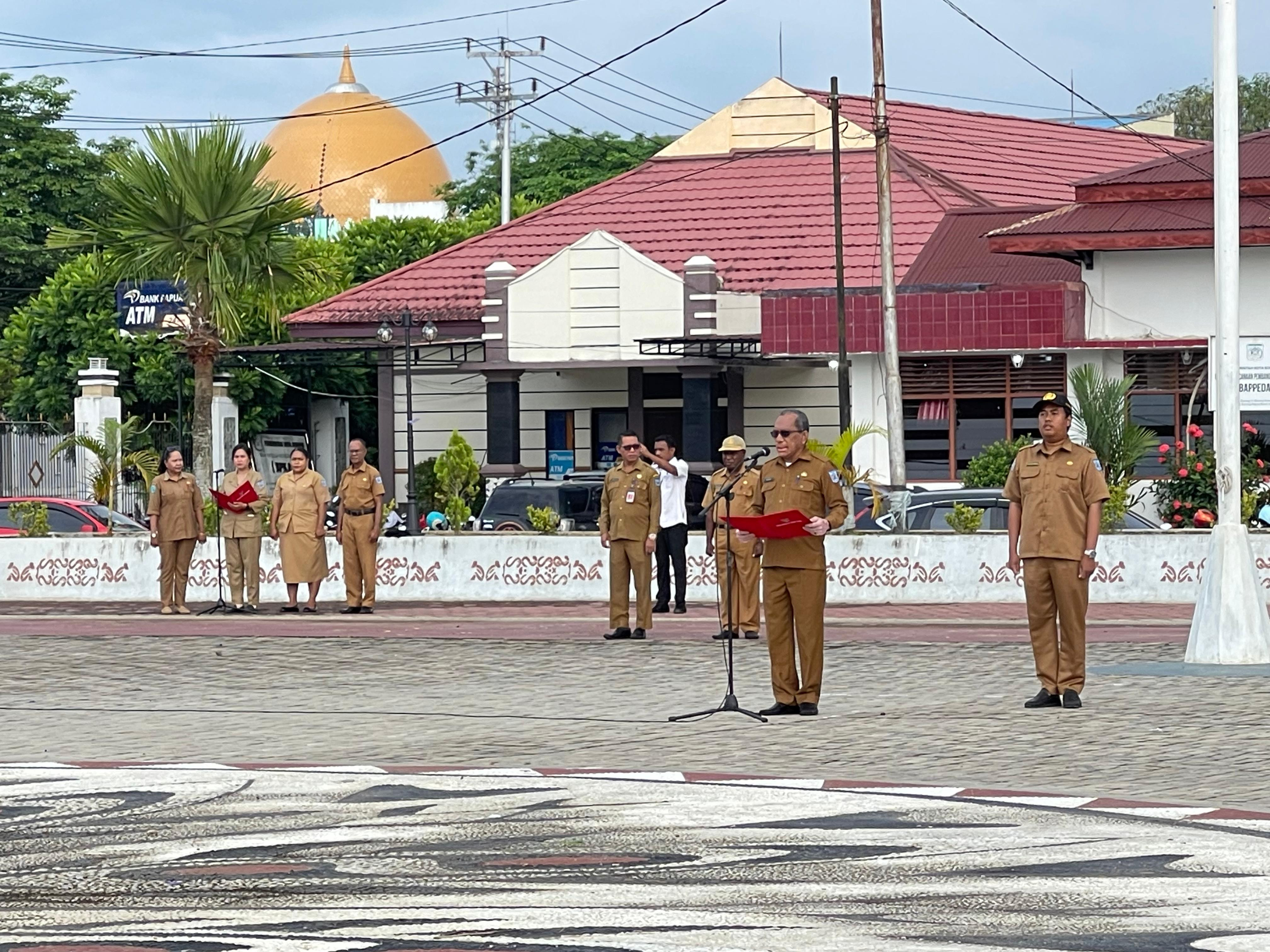 Apel pagi rutin yang di Pimpin oleh Asisten Bidang Administrasi Umum, Hanok J. Talla, S.Sos dan diikuti oleh Staf Ahli, Asisten, Pimpinan OPD, serta jajaran ASN di lingkungan Pemerintah Kota Sorong. Berlangsung di lapangan Landscape Kantor Wali Kota Sorong pada Senin pagi (26/5/2025).