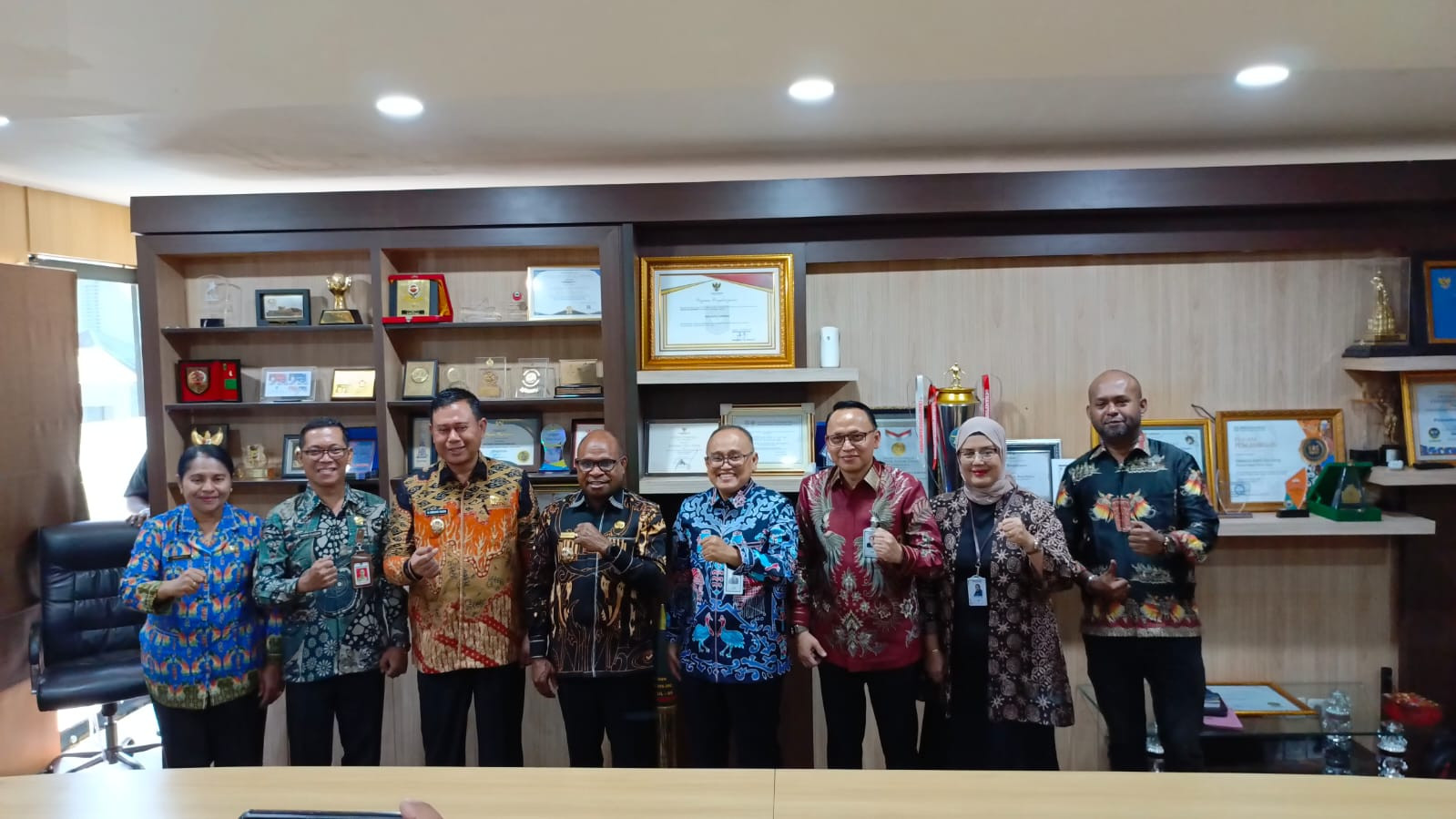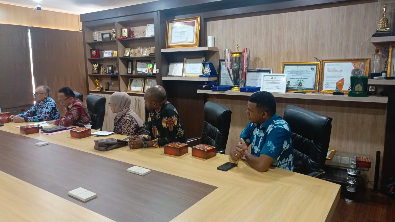 Wali Kota Sorong, Septinus Lobat, S.H., MPA, bersama Wakil Wali Kota, H. Anshar Karim, A.Md, didampingi Asisten II Setda, Tamrin Tajuddin, ST, MM, melakukan audiensi dengan Direksi Bank Papua Cabang Sorong. Pertemuan berlangsung di ruang rapat Wali Kota, membahas sinergi antara pemerintah daerah dan sektor perbankan untuk mendukung pembangunan di Kota Sorong. (24/4/2025).