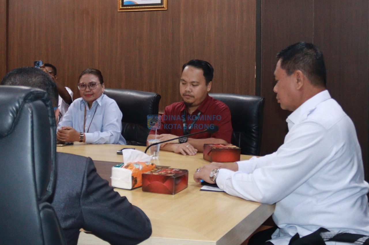 KOTA SORONG - Wakil Wali Kota Sorong, Anshar Karim, A.Md., didampingi Asisten Bidang Perekonomian dan Pembangunan Setda Kota Sorong, Thamrin Tajuddin, S.T., M.M, Kepala Dinas Sosial, Fauji Fattah, S.STP., M.Si, dan Kepala Bagian Perekonomian dan SDA Setda, Milan Latumeten,S.STP., menerima audiensi dari Executive Manager PT. Pos Indonesia (Persero) KC Sorong, Anggi Wardani, di Ruang Rapat Wali Kota, Rabu (16/7/2025).