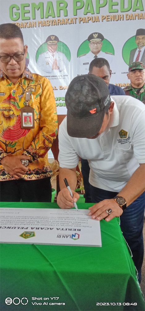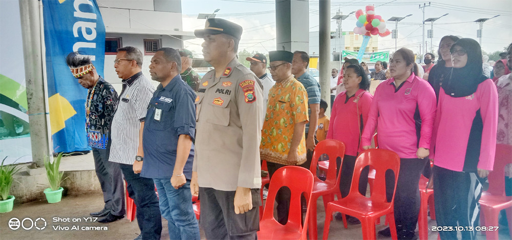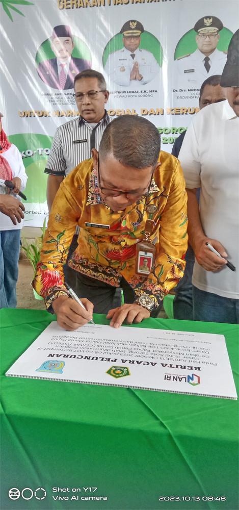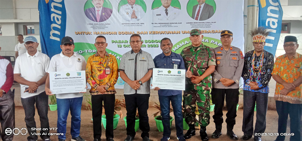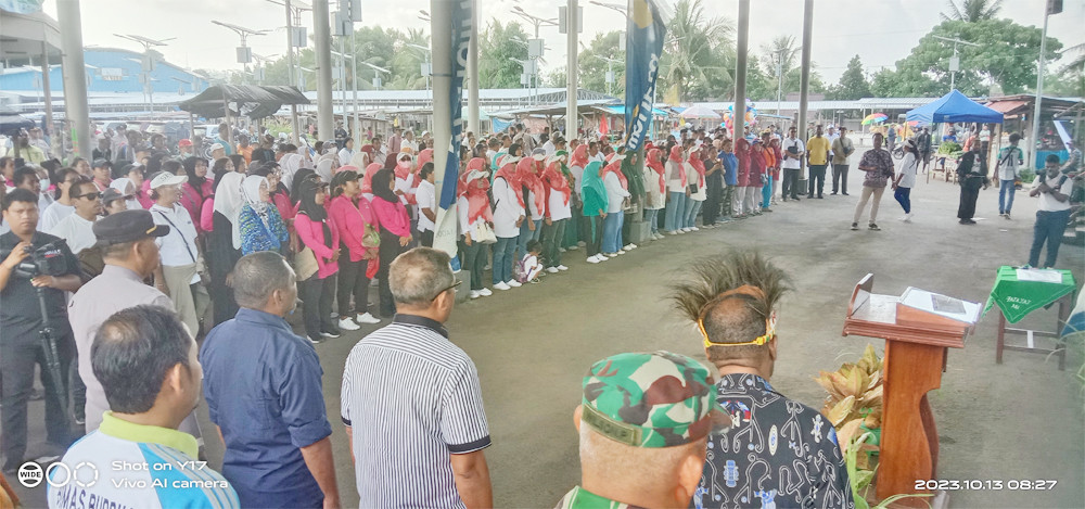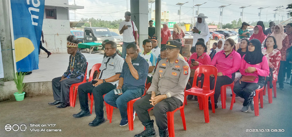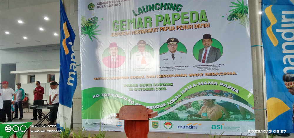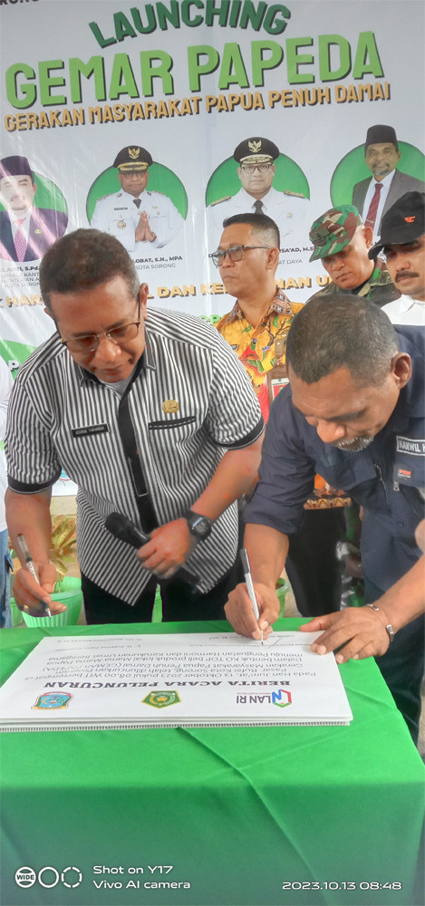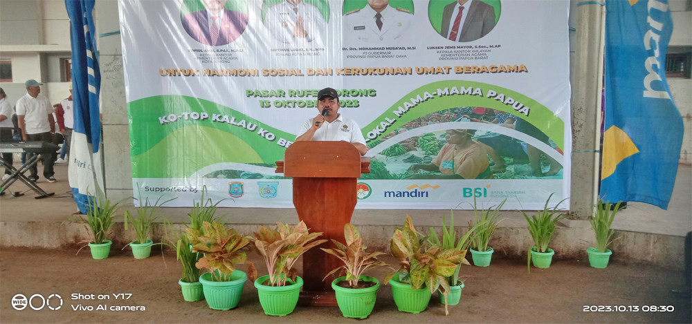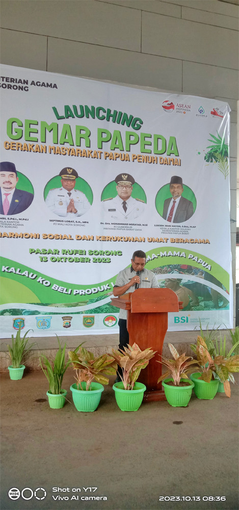 Asisten Bidang Administrasi, Perekonomian dan Pembangunan Setda Kota Sorong, H. Thamrin Tajuddin, S.T., M.M, menghadiri acara Launching Gerakan Masyarakat Papua Penuh Damai (Gemar Papeda) yang digelar di Pasar Rufei Kota Sorong, Jumat (13/10/2023) pagi hari. Kegiatan ini dilaksanakan dalam bentuk KO TOP beli produk lokal mama-mama papua, menuju penguatan harmoni dan kerukunanan agama. Hadir juga dalam kegiatan itu, Staf Ahli Gubernur Bidang Ekonomi, Keuangan dan Pembangunan, Dr. George Yarangga, A.Pi., M.M. Peluncuran Gemar Papeda ditandai dengan penandatangan berita acara, serta penggutingan pita dan pelepasan balon ke udara. Usai itu, seluruh undangan yang hadir melakukan aktifitas belanja di Pasar Rufei. (Diskominfo Kota Sorong)