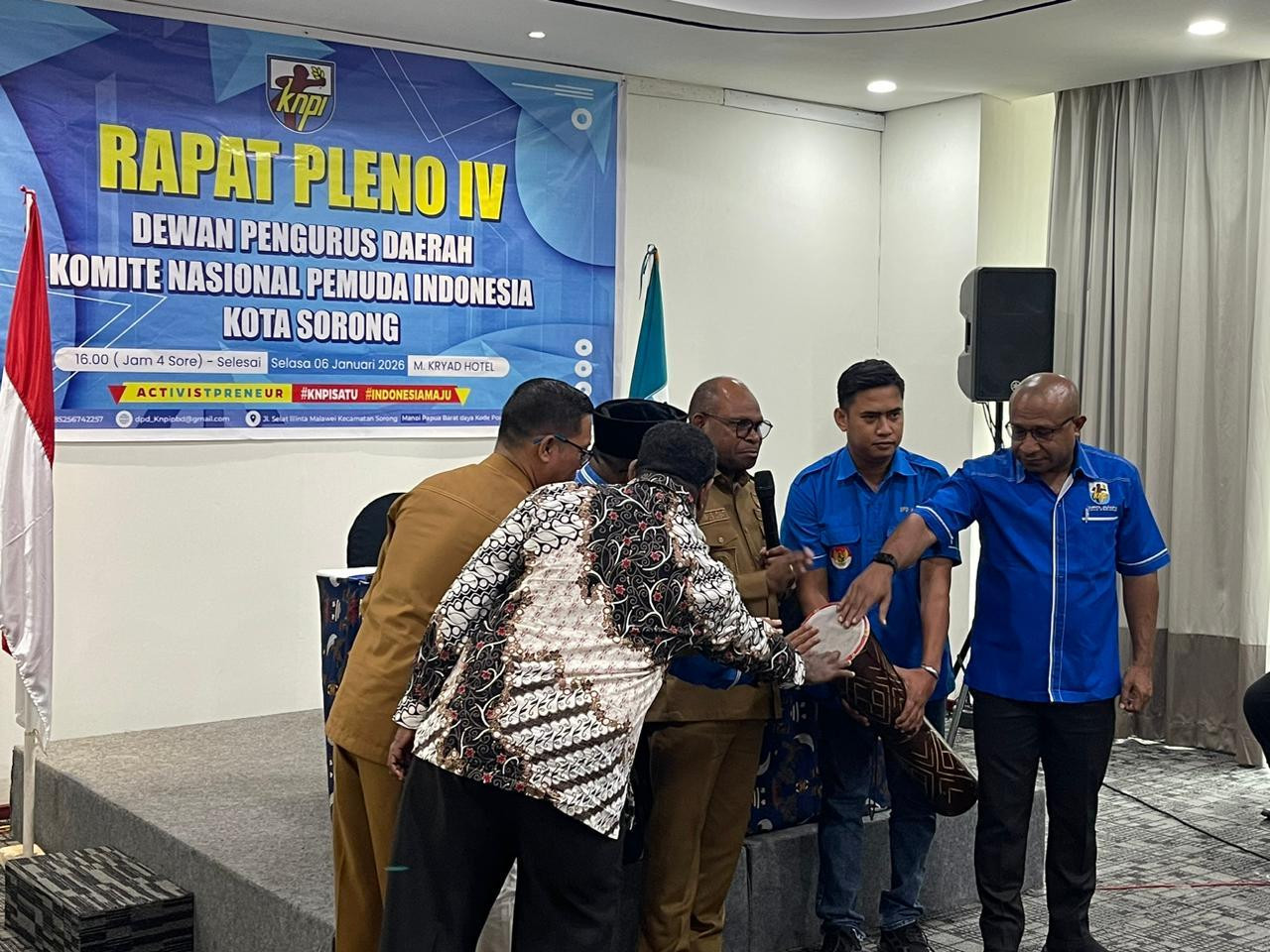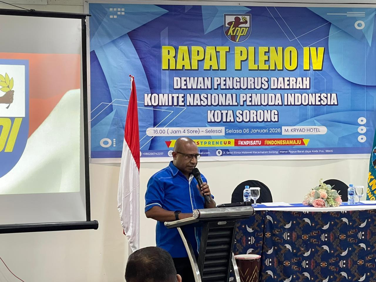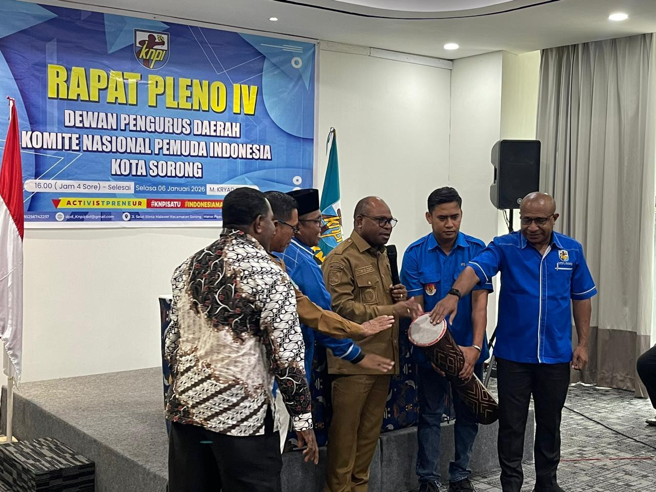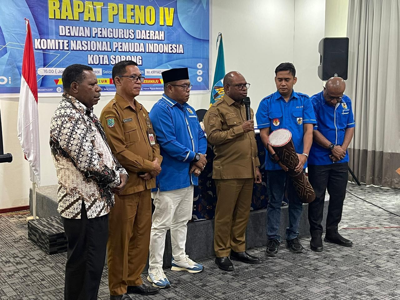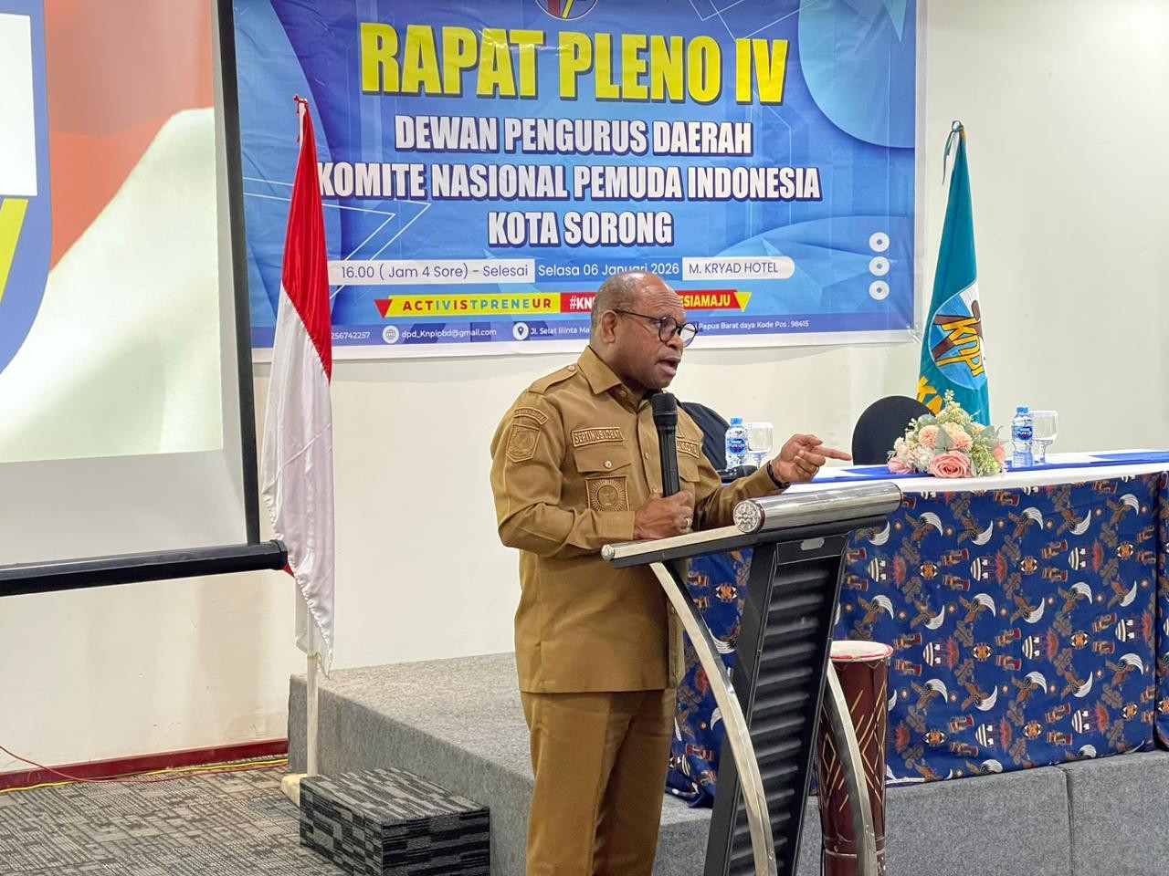 Wali Kota Sorong, Septinus Lobat, S. H., MPA menghadiri sekaligus membuka Rapat Pleno IV Dewan Pengurus Daerah (DPD) Komite Nasional Pemuda Indonesia (KNPI) Kota Sorong. Berlangsung di M. Kryad Hotel. Selasa, (6/1/2025).