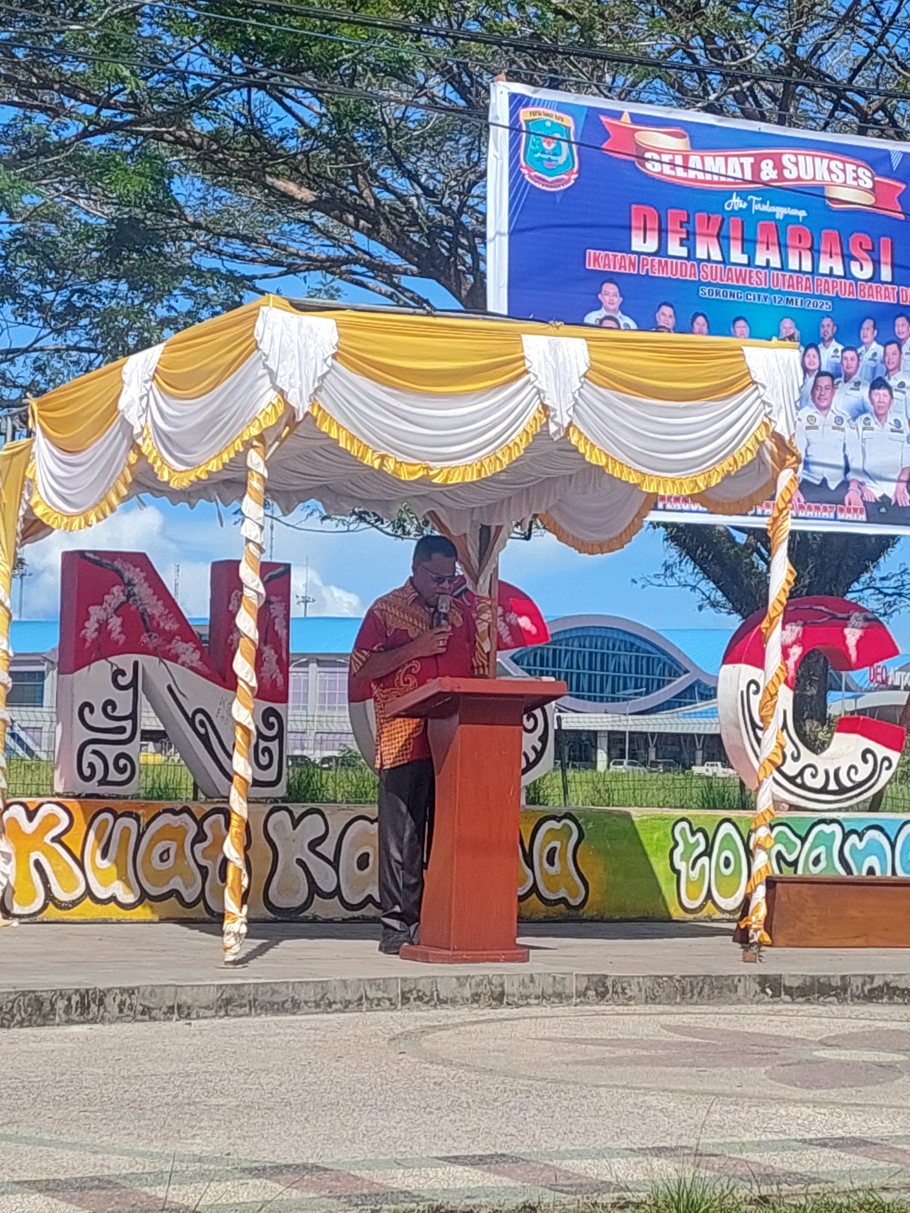 𝐊𝐨𝐭𝐚 𝐒𝐨𝐫𝐨𝐧𝐠 – Wali Kota Sorong, Septinus Lobat, S.H., MPA., yang diwakilkan oleh Sekretaris Daerah Kota Sorong, Drs. Yakob M. Kareth, M.Si., hadiri Deklarasi Ikatan Pemuda Sulawesi Utara Papua Barat Daya Bersama Sub-Sub IPSU Sorong Raya, yang terselenggara di Halaman Sorong City, Depan Bandar Udara DEO Kota Sorong. Senin, (12/5/2025).