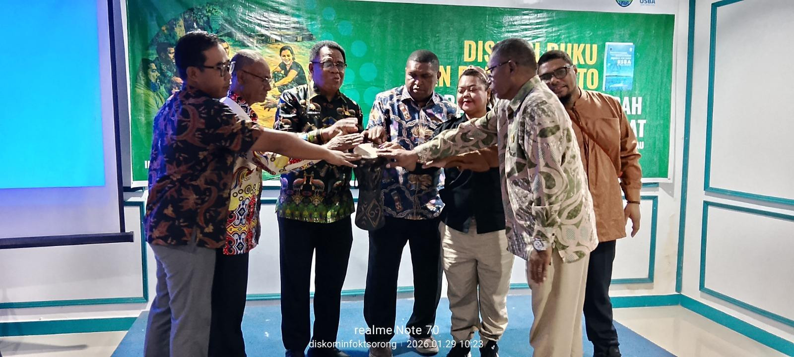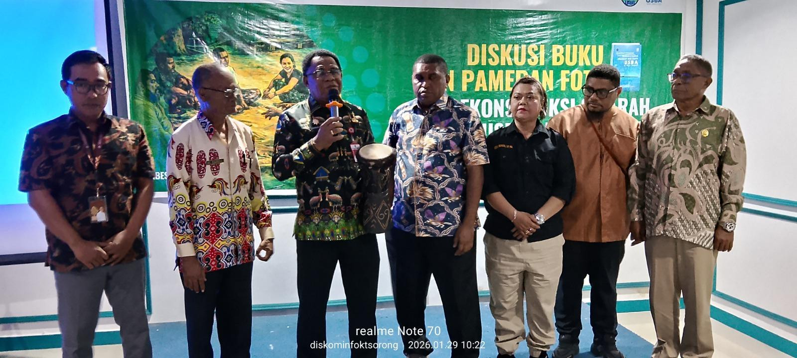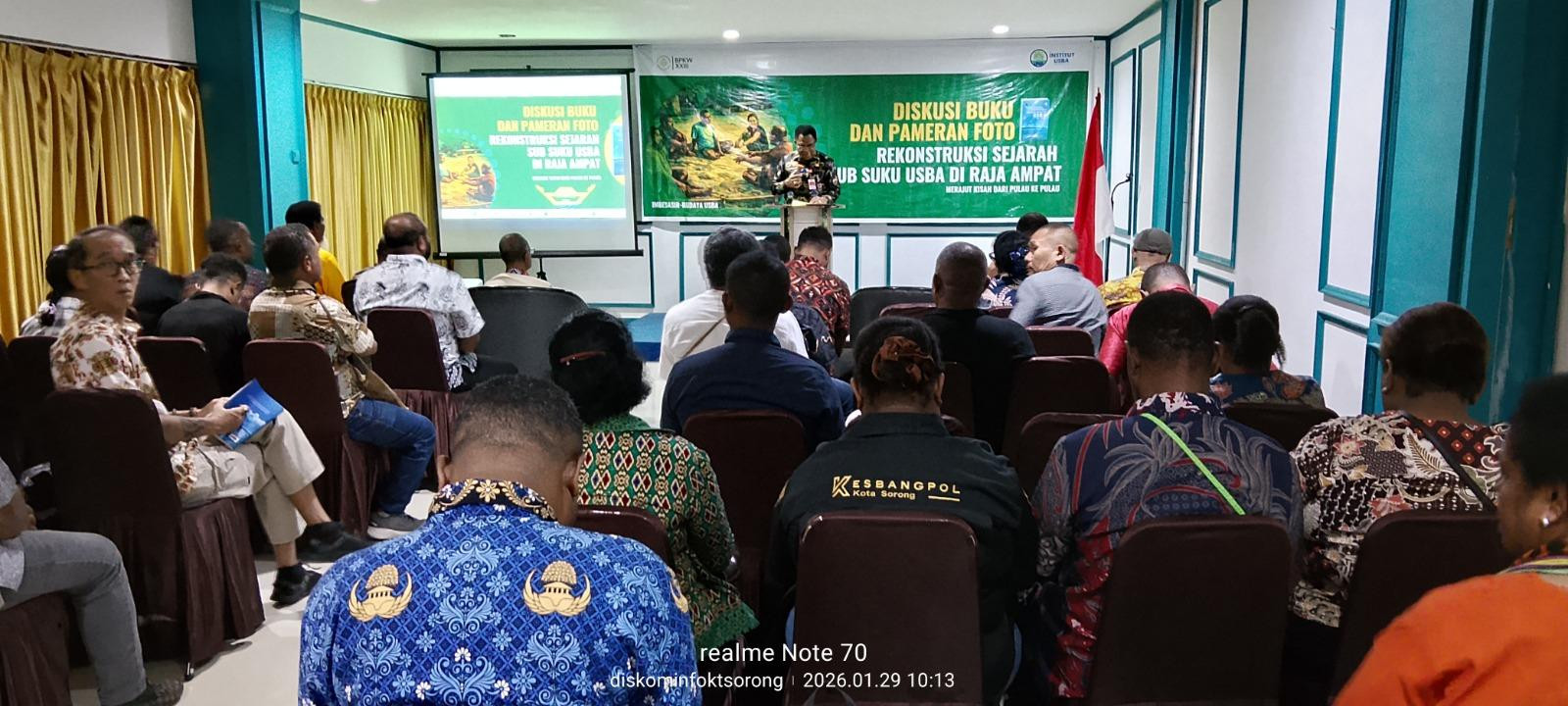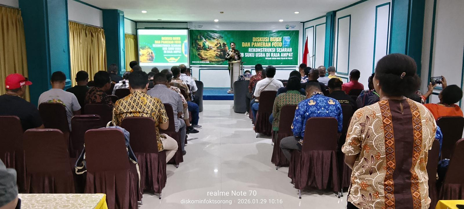 Plt. Asisten Bidang A dministrasi Umum Setda Kota Sorong, Musa Fonataba, S.P., menghadiri kegiatan Diskusi Buku dan Pameran Foto Rekonstruksi Sejarah Sub Suku Usba di Raja Ampat, yang dilaksanakan di Hotel Mariat Kota Sorong, Kamis (29/1/2026) pagi. Kegiatan yang digelar Institut Usba ini bertemakan, “Merajut Kisah dari Pulau ke Pulau”. Pada kesempatan itu, Pj. Sekda Papua Barat Daya, Drs. Yakob M. Kareth, M.Si, mengatakan, acara tersebut bukan sekadar peluncuran sebuah buku saja, namun merupakan sebuah langkah penting dalam merawat memori kolektif, menjaga pengetahuan leluhur, serta memperkuat jembatan dialog kebudayaan antara masyarakat adat, akademisi, dan pemerintah. (Diskominfo Kota Sorong)