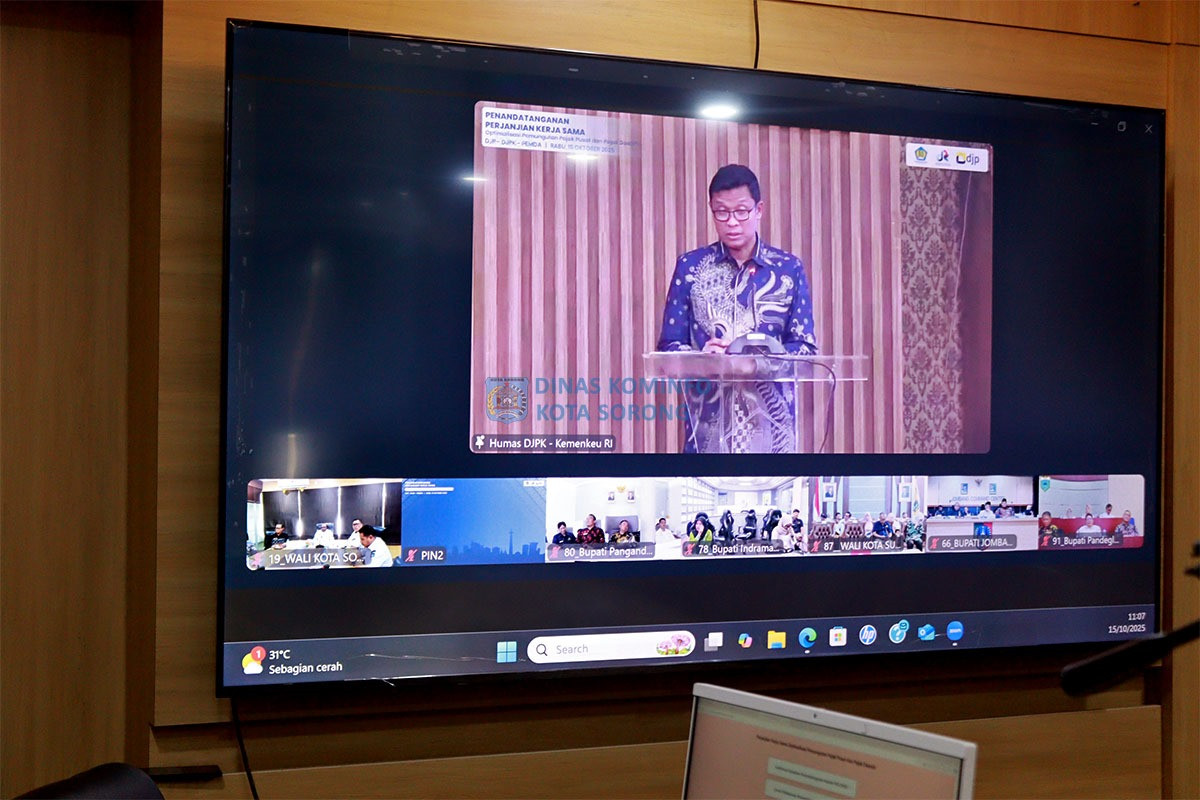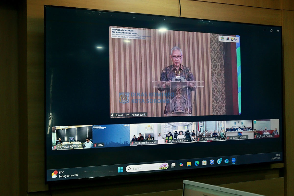 ππ¨ππ ππ¨π«π¨π§π - Wali Kota Sorong, Septinus Lobat, S.H., MPA, didampingi Asisten Bidang Administrasi, Perekonomian dan Pembangunan Setda Kota Sorong, Thamrin Tajuddin, S.T., M.M., dan Kepala Dinas Sosial Kota Sorong, Fauji Fattah, S.STP., M. Si, bersama Kepala KPP Pratama Sorong, Arifin Rosid, Ph.D, Ak dan Kepala Seksi Pengawasan 6 KPP Sorong, Irfan Dwisaputra, menandatangani Perjanjian Kerja Sama Optimalisasi Pemungutan Pajak Pusat dan Pajak Daerah (PKS OP4D) antara Direktorat Jenderal Pajak (DJP), Direktorat Jenderal Perimbangan Keuangan (DJPK), dan Pemerintah Daerah (Pemda), melalui zoom meeting di ruang kerja Wali Kota, Rabu (15/10/2025).