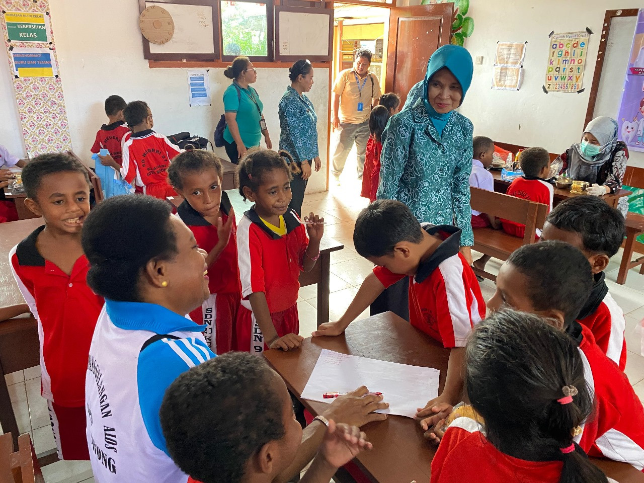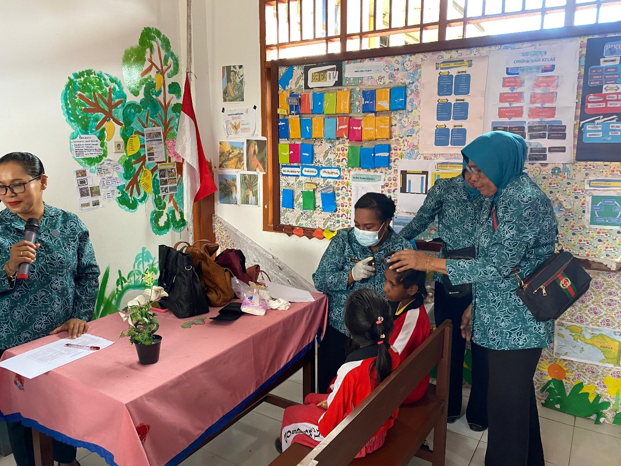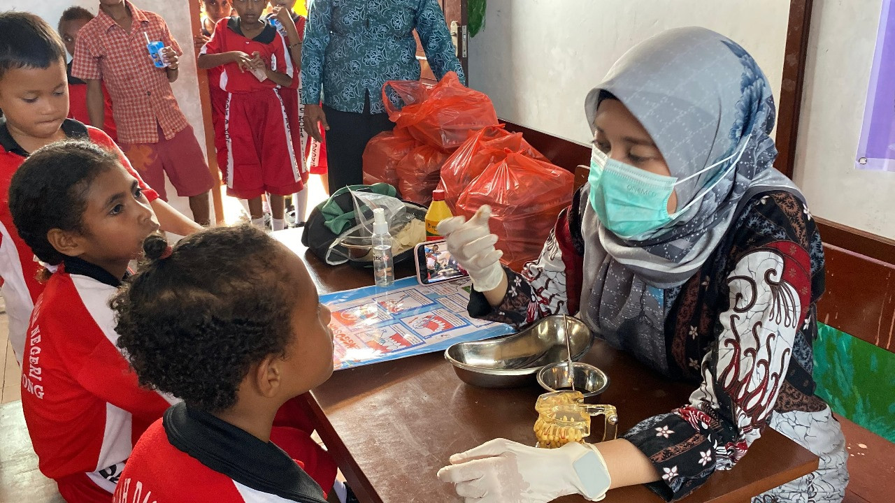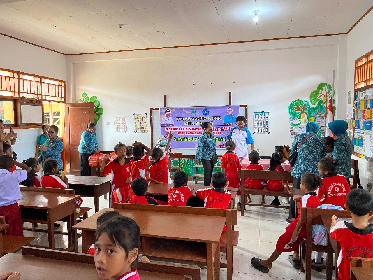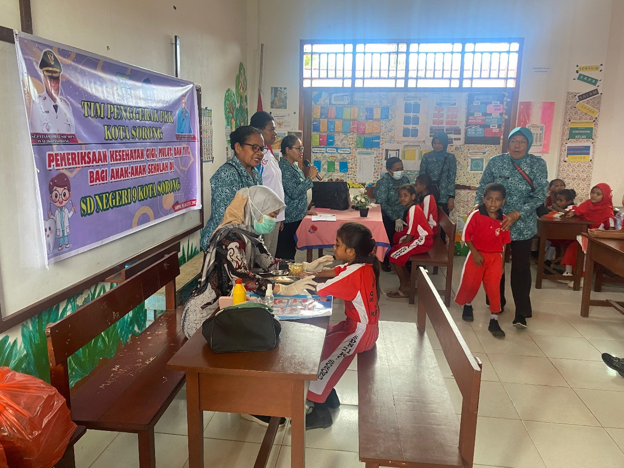 KOTA SORONG - Tim Penggerak Pemberdayaan dan Kesejahteraan Keluarga (TP PKK) Kota Sorong menyelenggarakan kegiatan pemeriksaan Kesehatan bagi para siswa-siswi di SD Negeri 9 Kota Sorong, Kelurahan Rufei, Distrik Sorong Barat. Jumat, (8/8/2025).