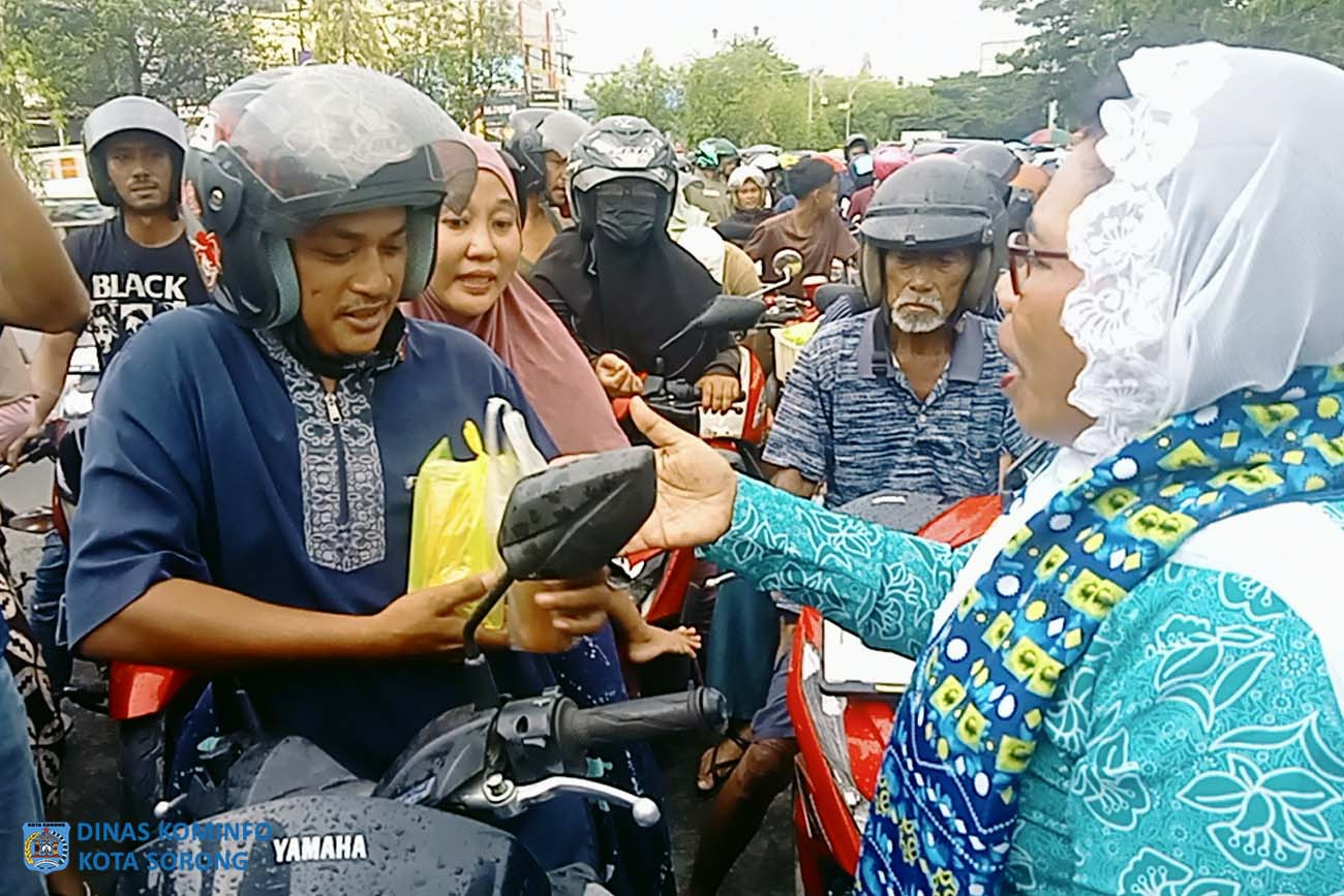 Mengawali pembagian takjil, Ketua TP PKK didampingi Ketua BKMT, Ketua DWP, dan Ketua GOW Kota Sorong membagikan takjil kepada warga yang sudah menunggu di depan lokasi Sorong City. Sekalipun terlihat ramai, namun arus lalu lintas tetap berjalan dengan lancar.