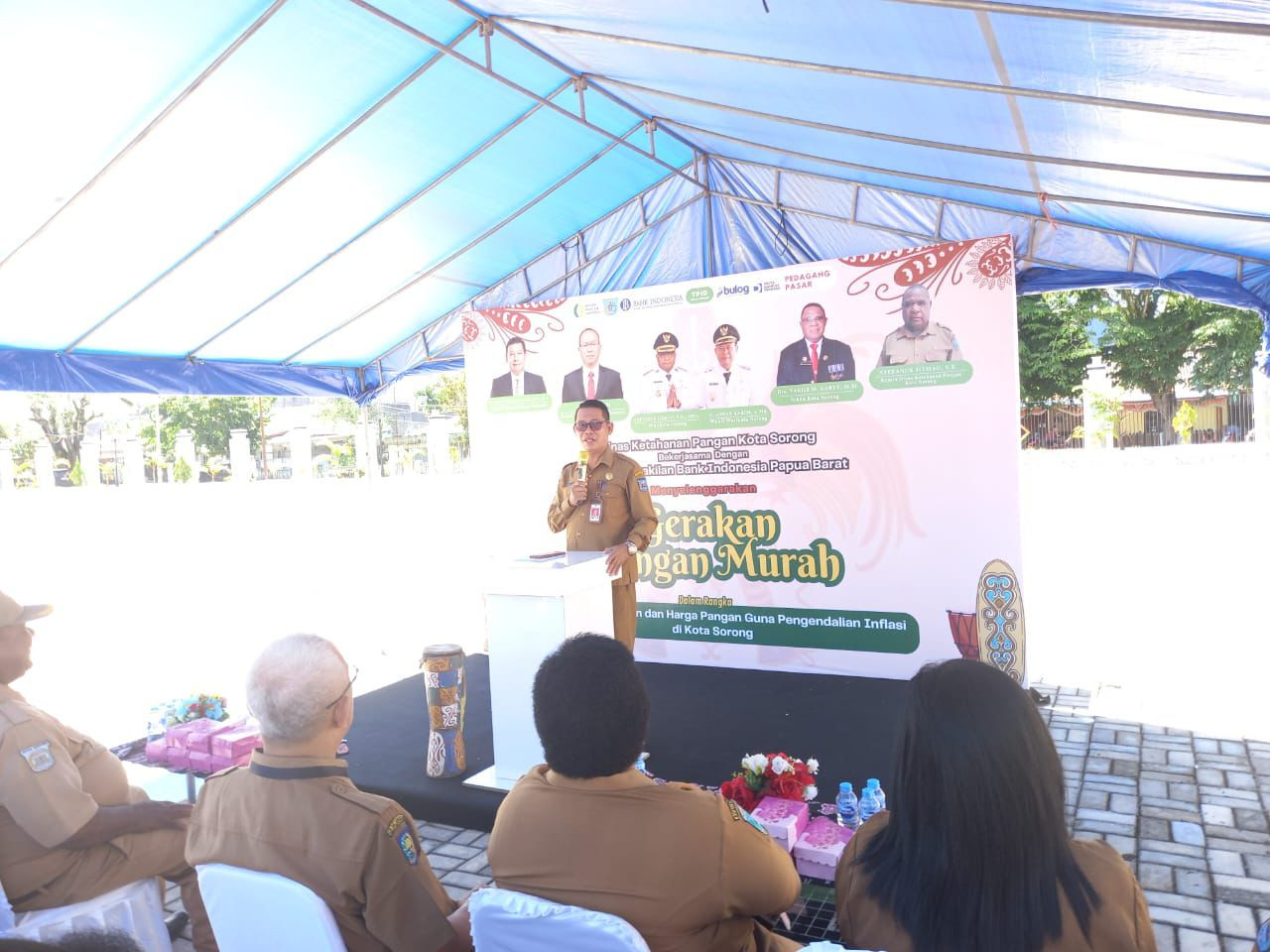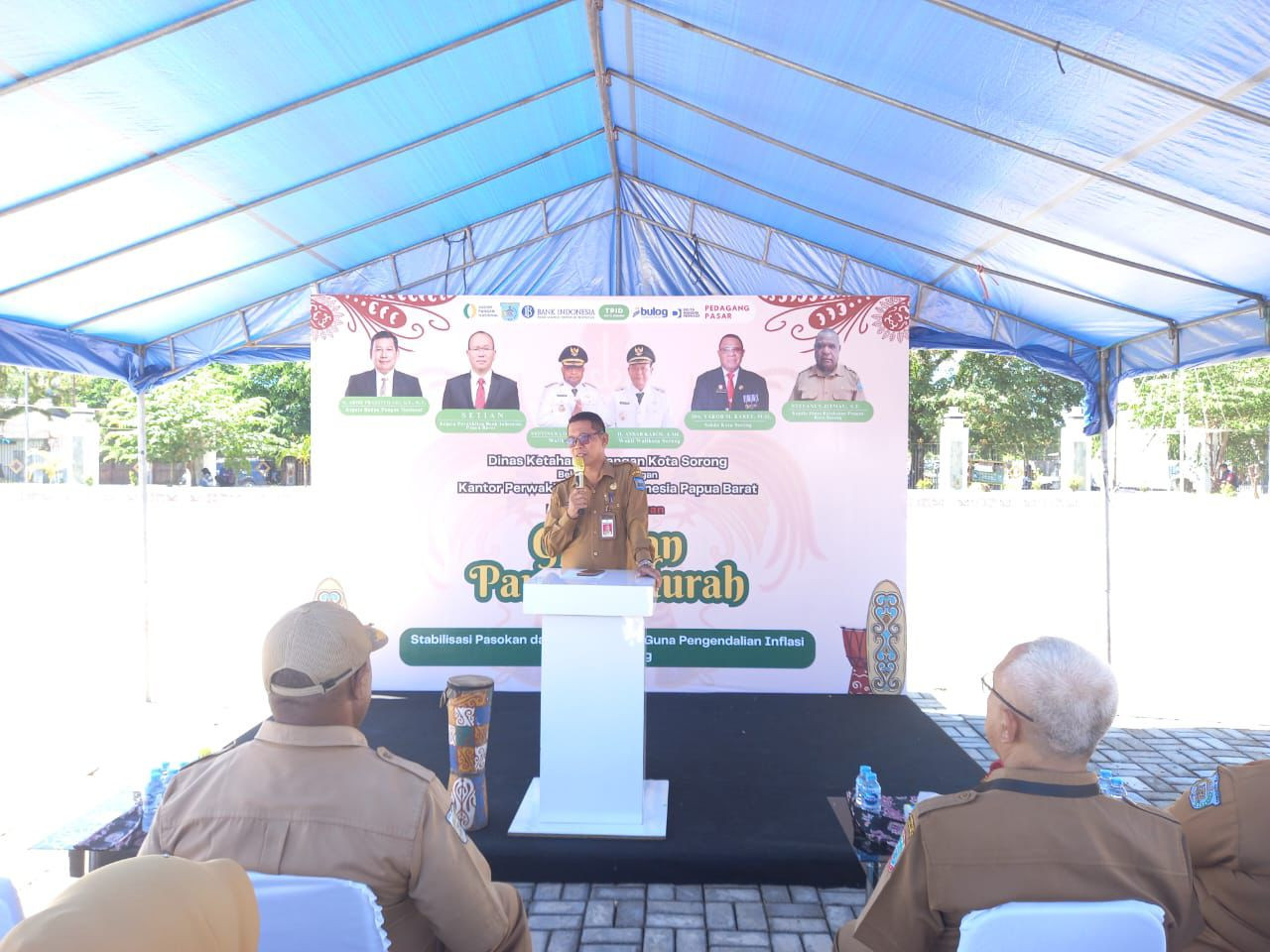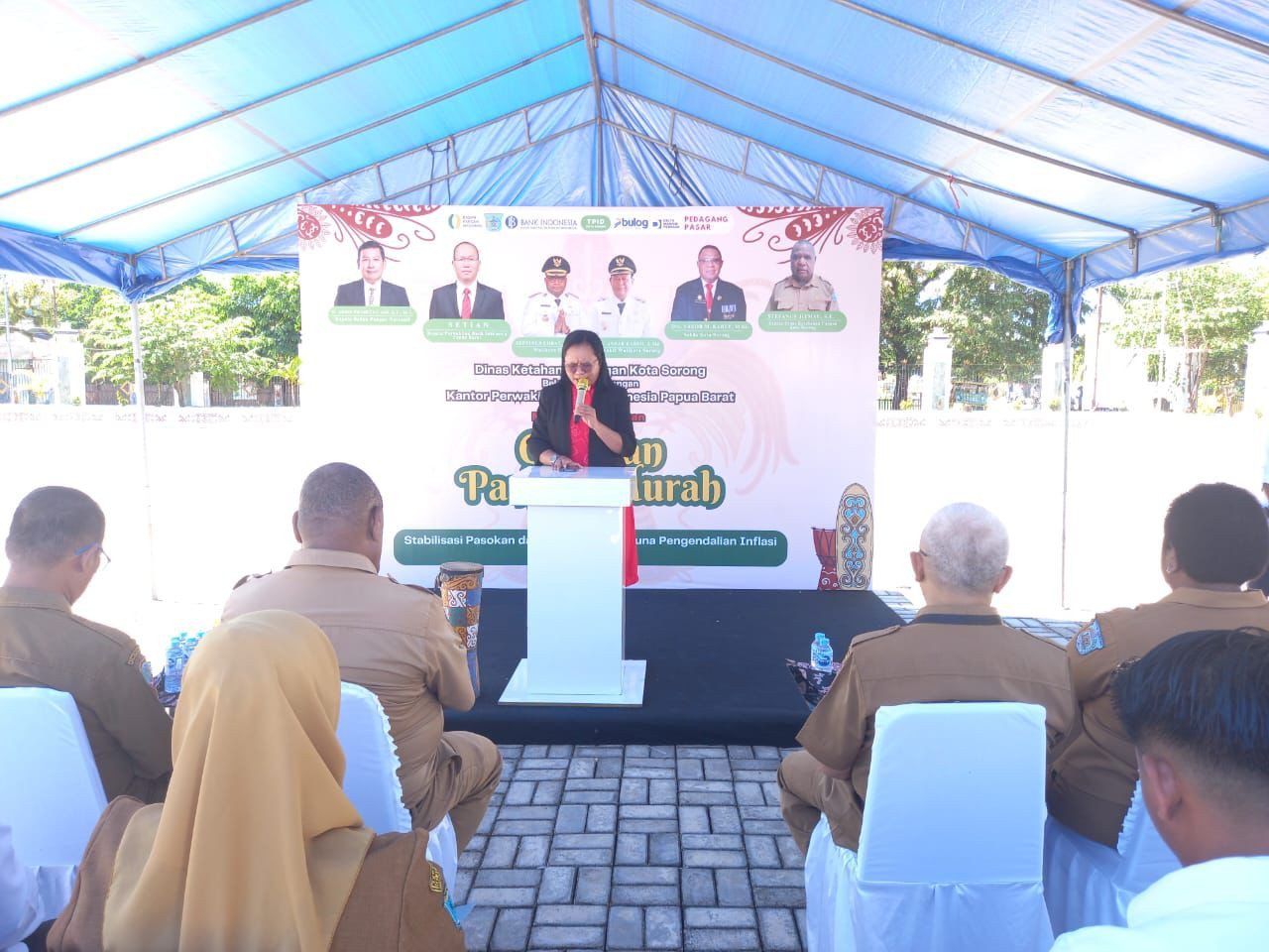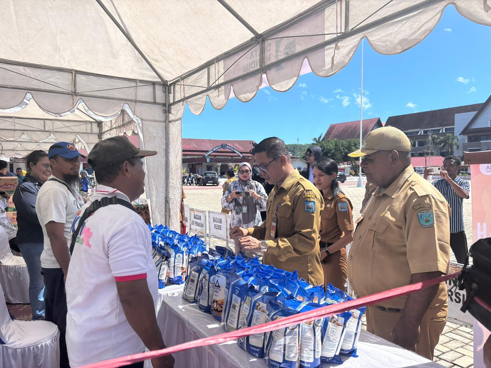 Wali Kota Sorong, Septinus Lobat, S.H., MPA., dan Wakil Wali Kota Sorong, H. Anshar Karim, A.Md., yang diwakili oleh Asisten Il Setda Kota Sorong Thamrin Tajuddin., S.T., MM, hadir sekaligus membuka kegiatan Gerakan Pangan Murah tahun 2025. Pemerintah Kota Sorong melalui Dinas Ketahanan Pangan Kota Sorong bekerja sama dengan Kantor Perwakilan Bank Indonesia Provinsi Papua Barat menggelar Gerakan Pangan Murah ini. Kegiatan ini bertujuan untuk menstabilkan pasokan dan harga pangan sebagai bagian dari upaya pengendalian inflasi daerah. Kegiatan ini dilaksanakan di lapangan apel kantor Wali Kota Sorong. Selasa, (27/05/2025).