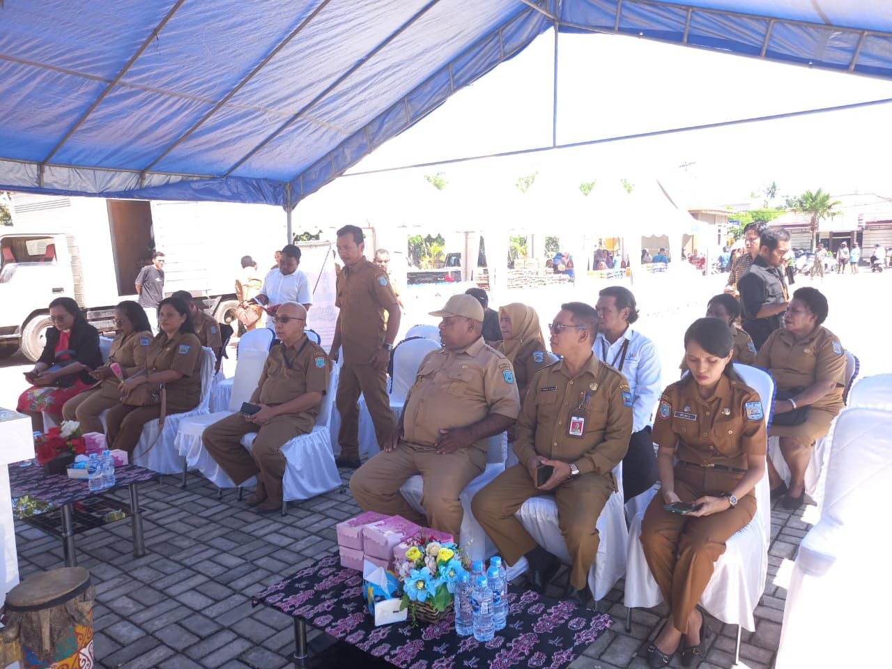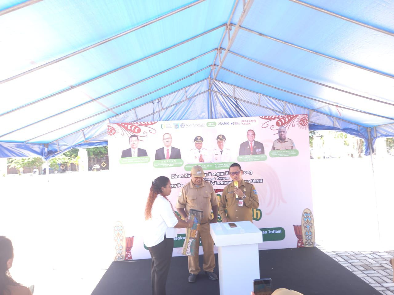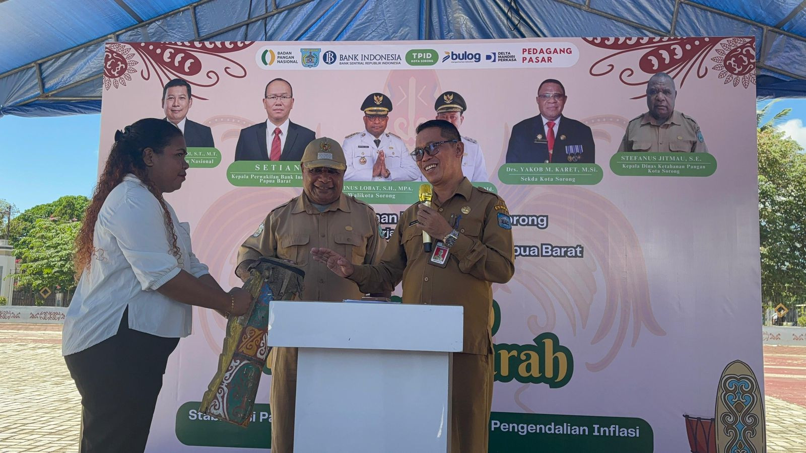 Kemudian kegiatan dilanjutkan dengan penabuhan tifa sebagai tanda dibukanya kegiatan Gerakan Pangan Murah tahun 2025. (Diskominfo Kota Sorong)