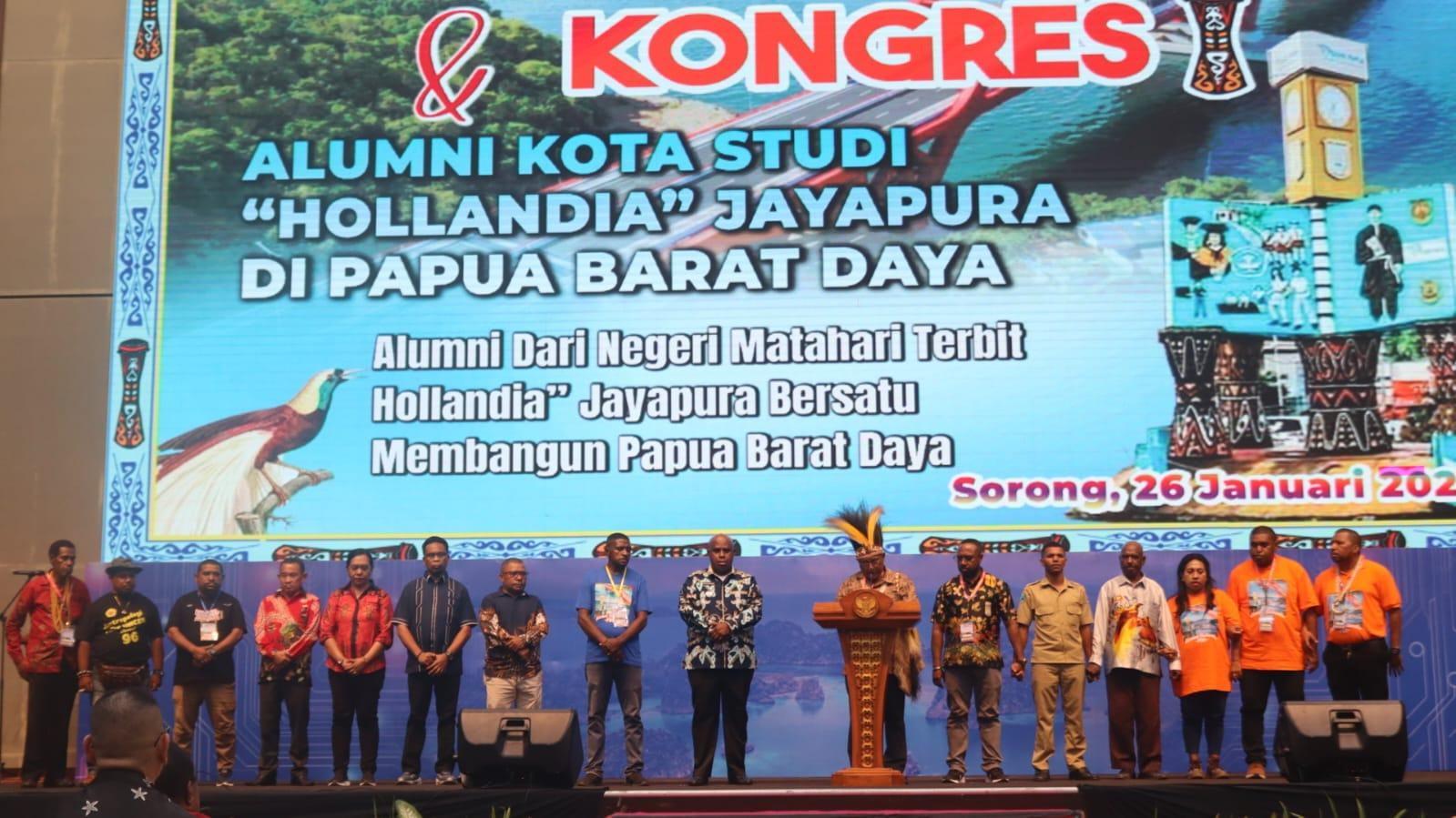 Kota Sorong - Gubernur Papua Barat Daya, Elisa Kambu, S.Sos, menegaskan, alumni Kota Studi Hollandia Jayapura memiliki tanggung jawab untuk mengonsolidasikan kekuatan sumber daya manusia, dan berkontribusi langsung dalam pembangunan Papua Barat Daya melalui wadah Ikatan Alumni, yang dibentuk secara resmi dalam Kongres I Alumni Kota Studi Hollandia Jayapura di Gedung Lambert Jitmau, Senin (26/1/2026).