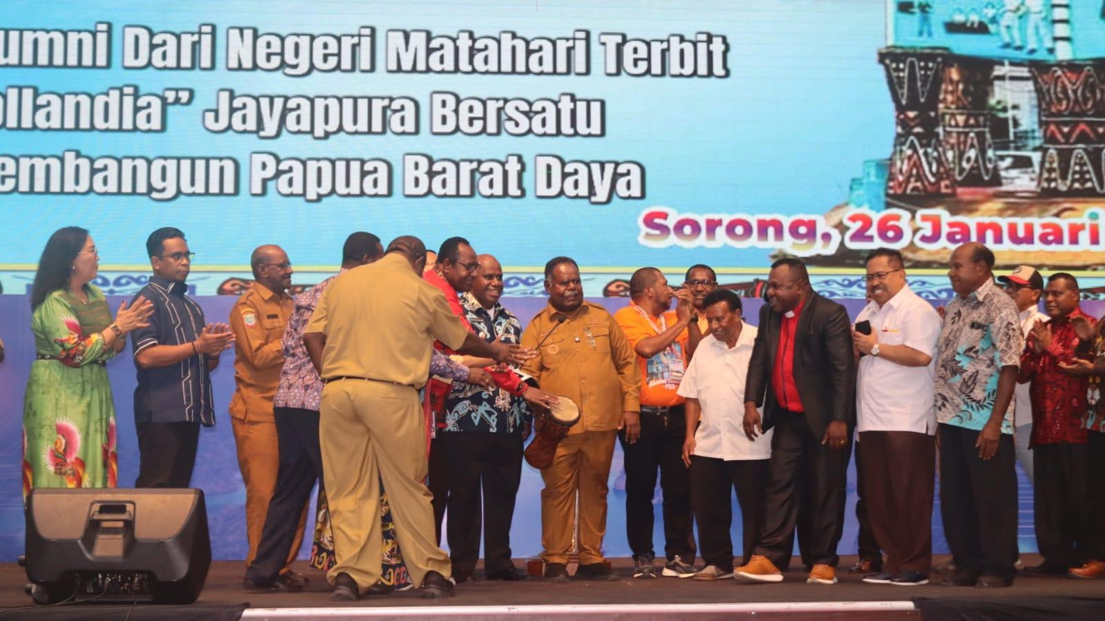 Kongres I Ikatan Alumni Kota Studi Hollandia Jayapura secara resmi dibuka oleh Gubernur Papua Barat Daya, yang ditandai dengan pemukulan tifa. Dari seluruh alumni dari berbagai latar belakang profesi yang hadir, nampak juga sejumlah pejabat di lingkup pemerintah kota Sorong yang merupakan alumni dari Kota Studi Hollandia Jayapura. (Diskominfo Kota Sorong)