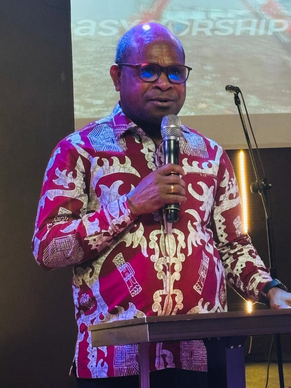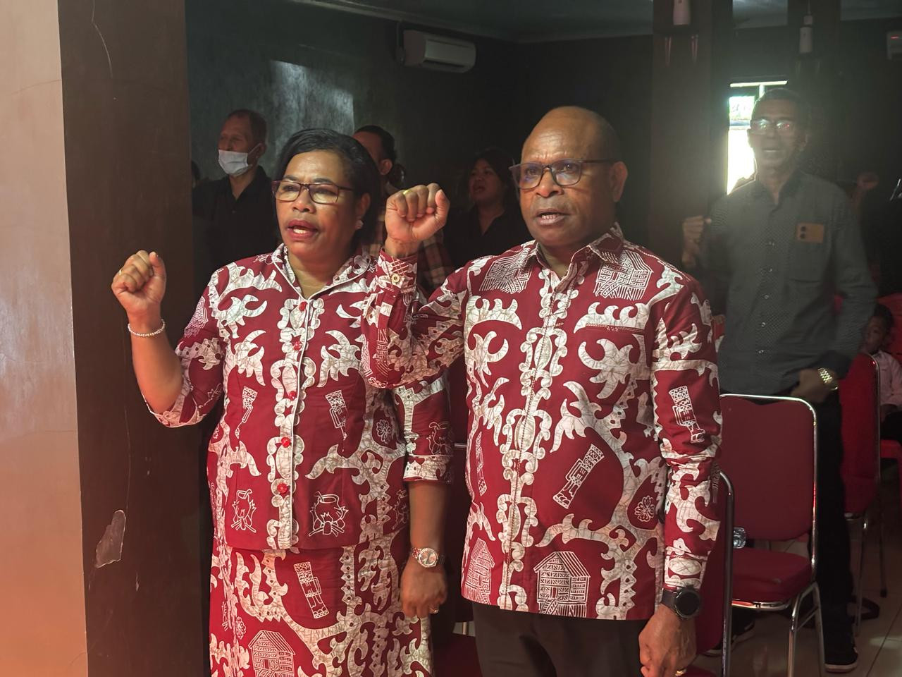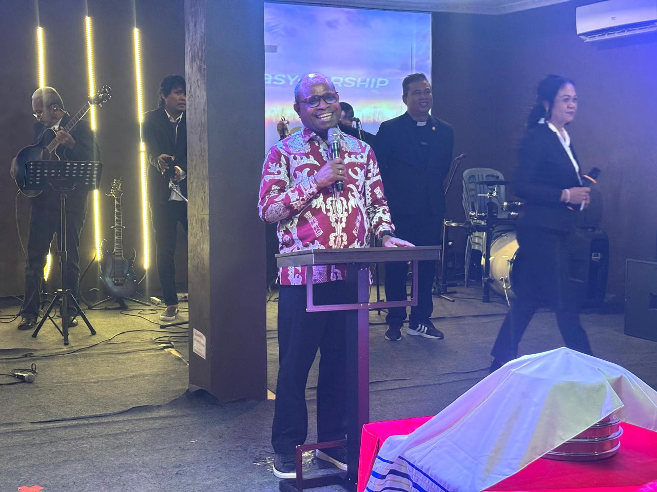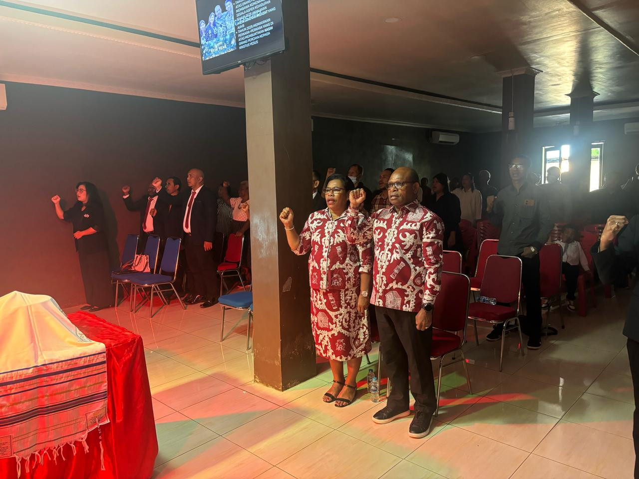 Wali Kota Sorong, Septinus Lobat, S.H., MPA., bersama Ny. Jemima E. W. Lobat, S.K.M., M.A.P., didampingi beberapa kepala OPD lingkup Pemerinta Kota Sorong, Ibadah Minggu bersama Jemaat GBI Healing Service Sorong, di Kel. Klabala, Kota Sorong. Minggu, (13/4/2025).