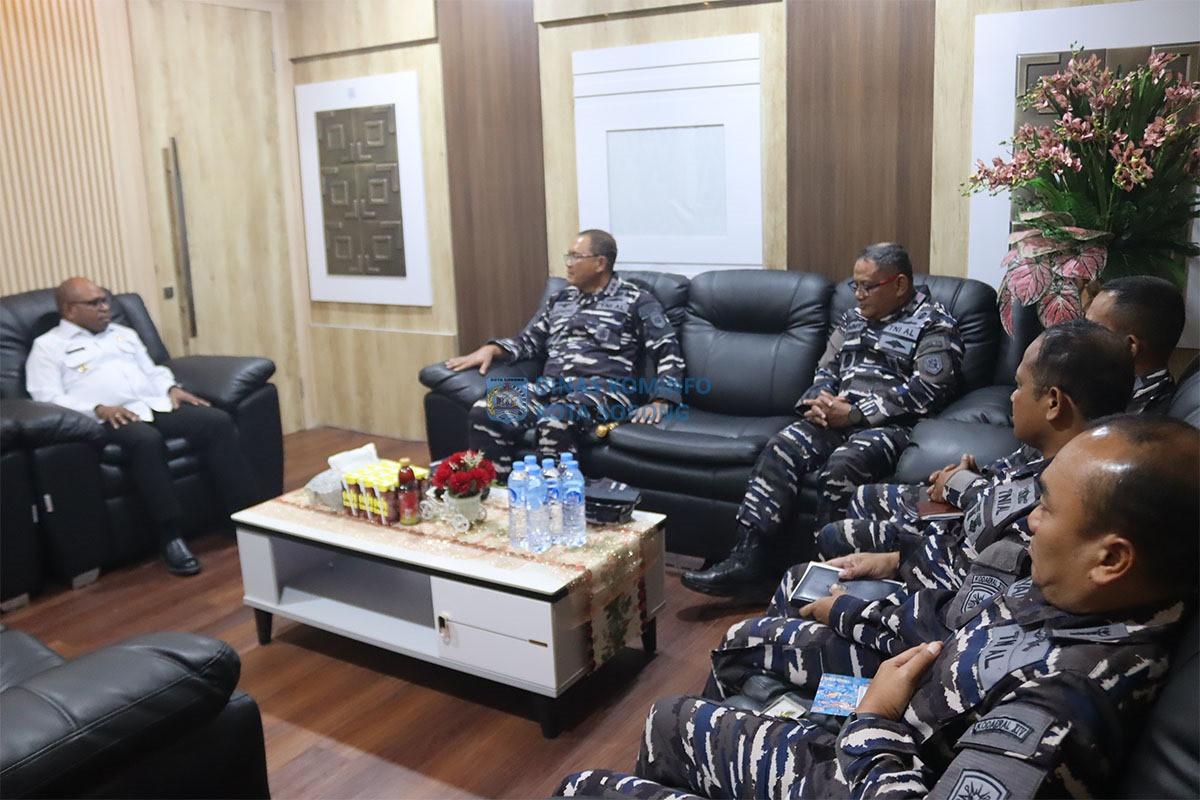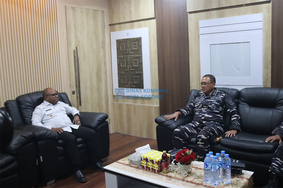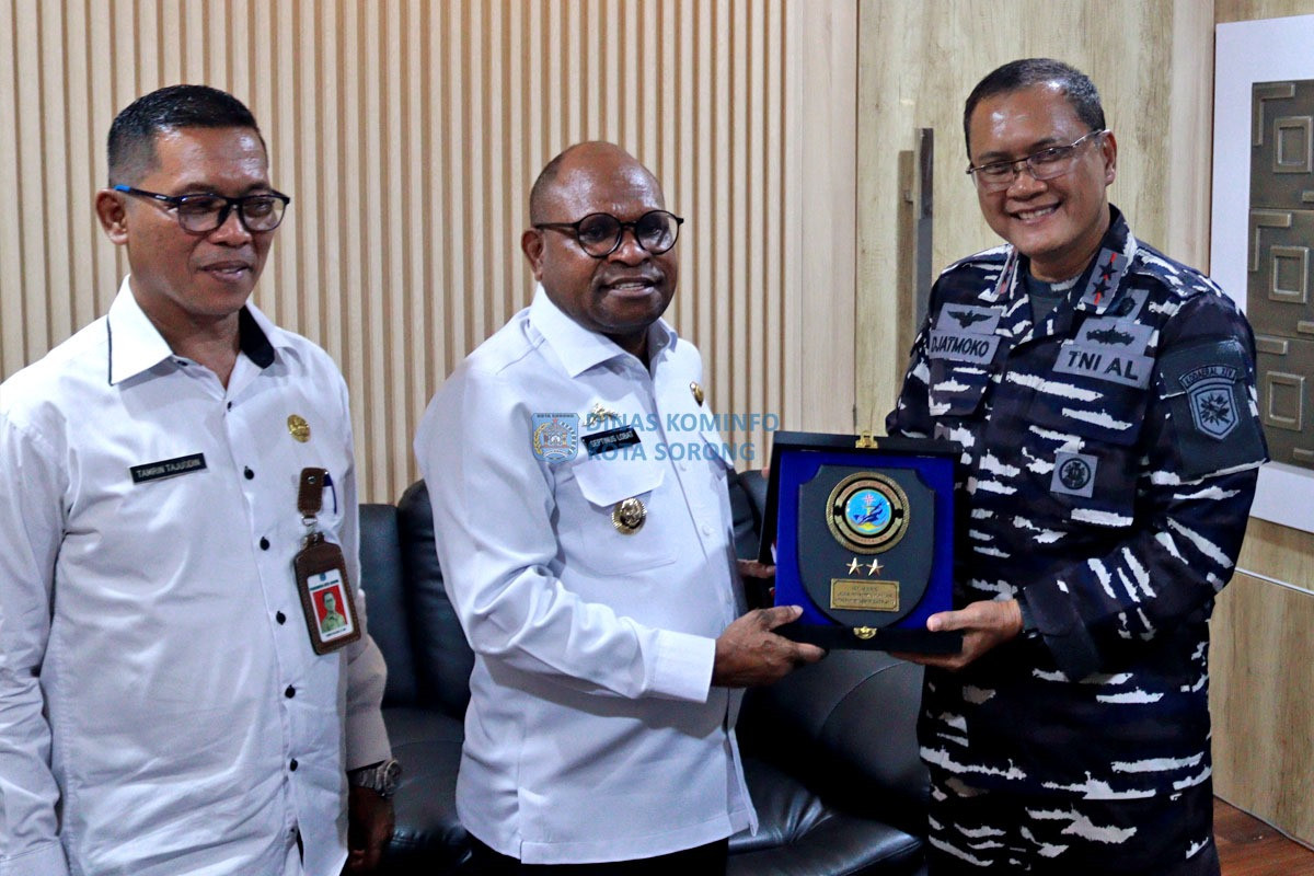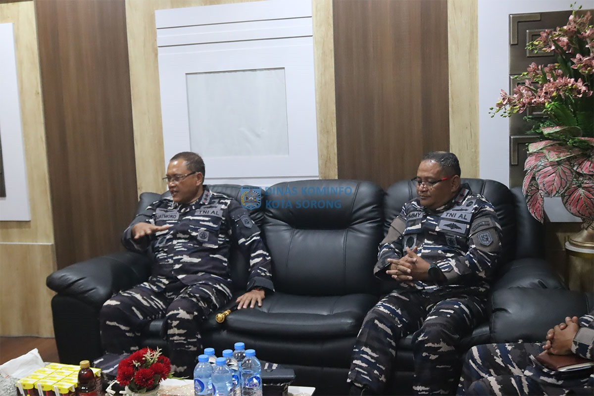 Kunjungan Dankodaeral XIV (Sorong), Laksamana Muda TNI Djatmoko, S.E., M.M., CHRMP, Bersama Wakil Komandan (Wadan) Kodaeral XIV, Kolonel Laut (P) Tommy Herlambang, S.E, dan beberapa perwira, di ruang kerja Wali Kota