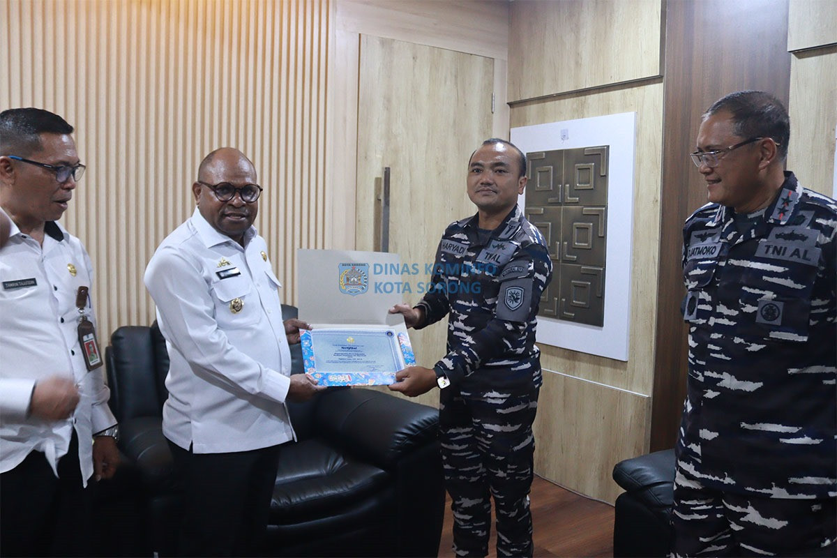 Wali Kota Sorong, Septinus Lobat, S.H., MPA., didampingi Asisten Bidang Administrasi, Perekonomian dan Pembangunan Setda Kota Sorong, Thamrin Tajuddin, S.T., M.M., menerima kunjungan Dankodaeral XIV (Sorong), Laksamana Muda TNI Djatmoko, S.E., M.M., CHRMP, Bersama Wakil Komandan (Wadan) Kodaeral XIV, Kolonel Laut (P) Tommy Herlambang, S.E, dan beberapa perwira, di ruang kerja Wali Kota, Rabu (15/10/2025). Pada kesempatan itu juga, dilakukan penyematan Brevet Kehormatan Kesehatan Penyelaman dan Hiperbarik, serta penyerahan sertifikat kepada Wali Kota Sorong, dan juga pemberian plakat cenderamata. (π«πππππππππ π²πππ πΊπππππ)