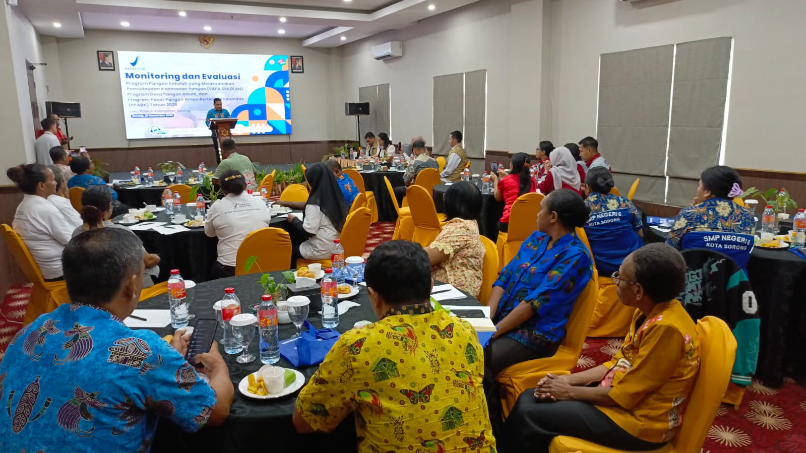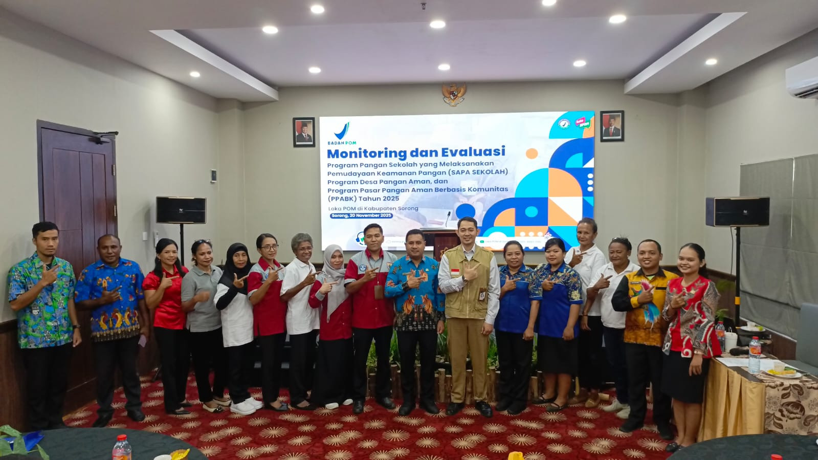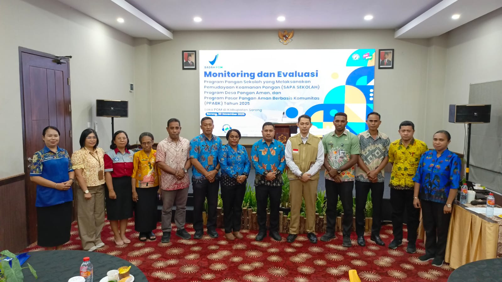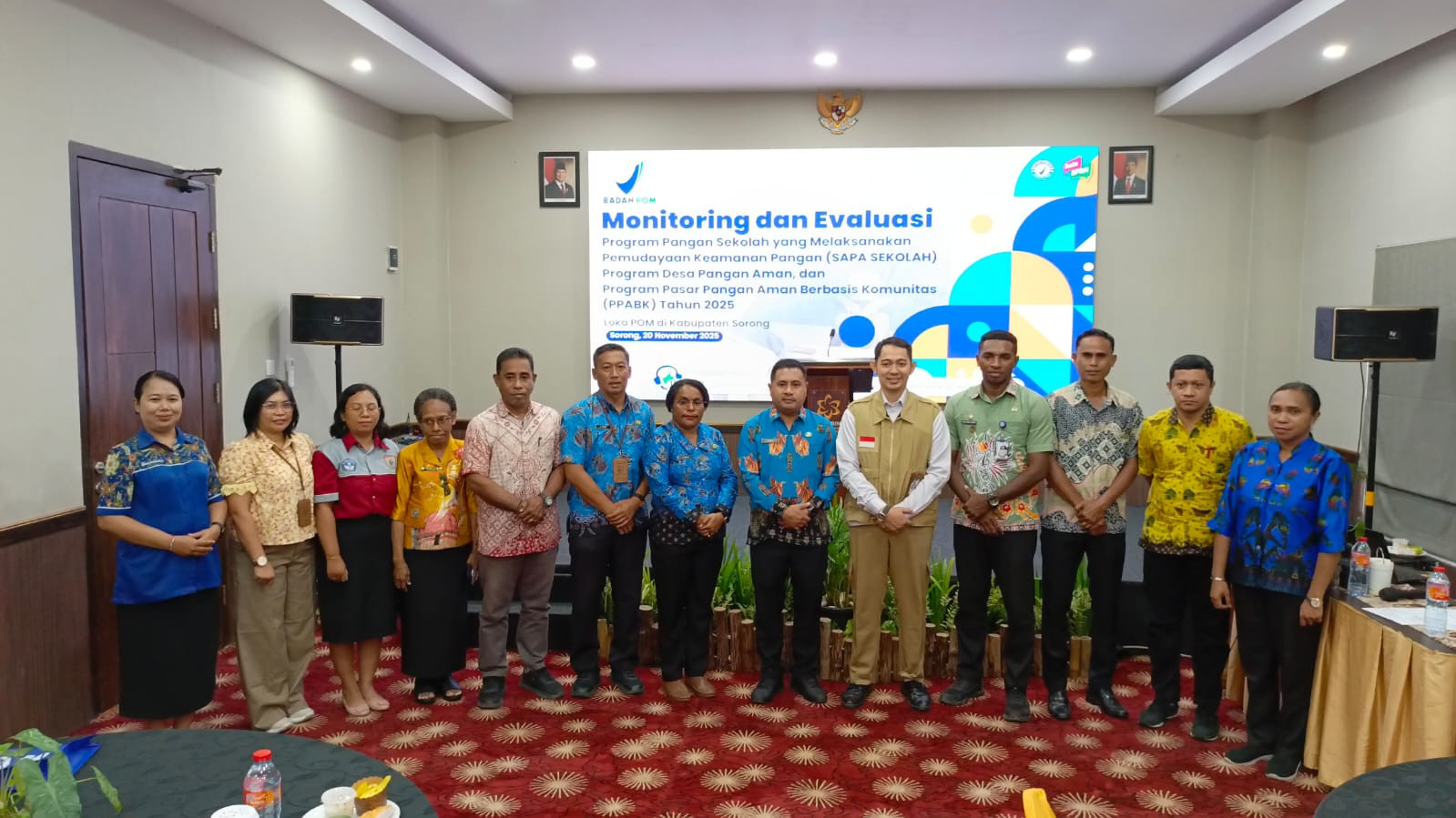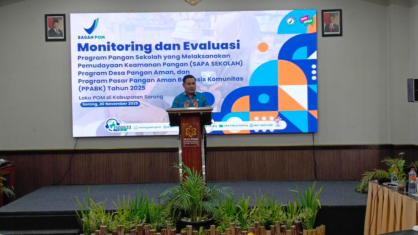 Mewakili Wali Kota Sorong, Kepala Badan Pengelolaan Pajak dan Retribusi Daerah (BPPRD), Fauzi Fattah, S.STP., M.Si., membuka kegiatan Monitoring dan Evaluasi Program Pangan Sekolah yang diselenggarakan oleh Loka POM Kabupaten Sorong di Vega Prime Hotel. (20/11/2025).