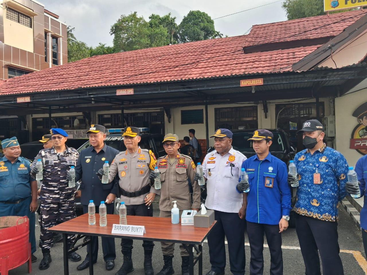 Di akhir kegiatan, aparat kepolisian turut melakukan pemusnahan barang bukti berupa 100 liter minuman keras lokal sebagai upaya menjaga keamanan dan ketertiban masyarakat menjelang Hari Raya Idul Fitri. (Dinas Kominfo Kota Sorong)