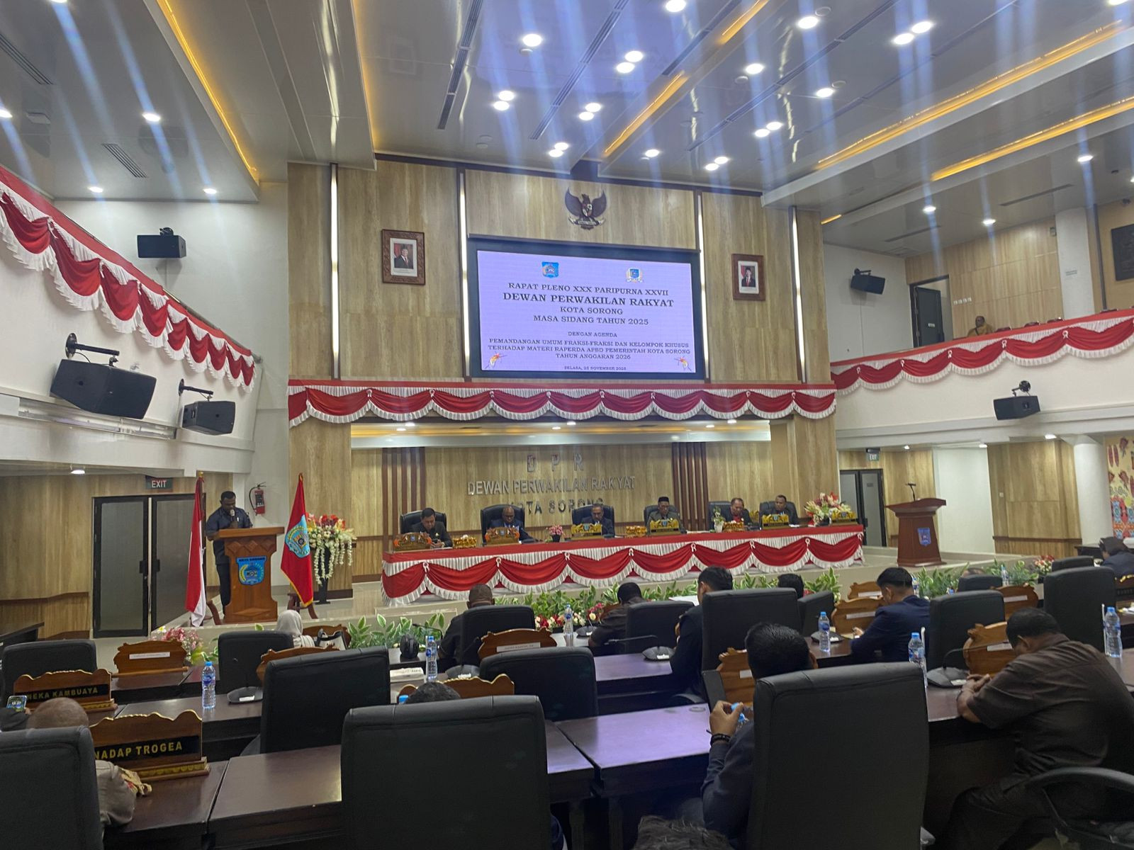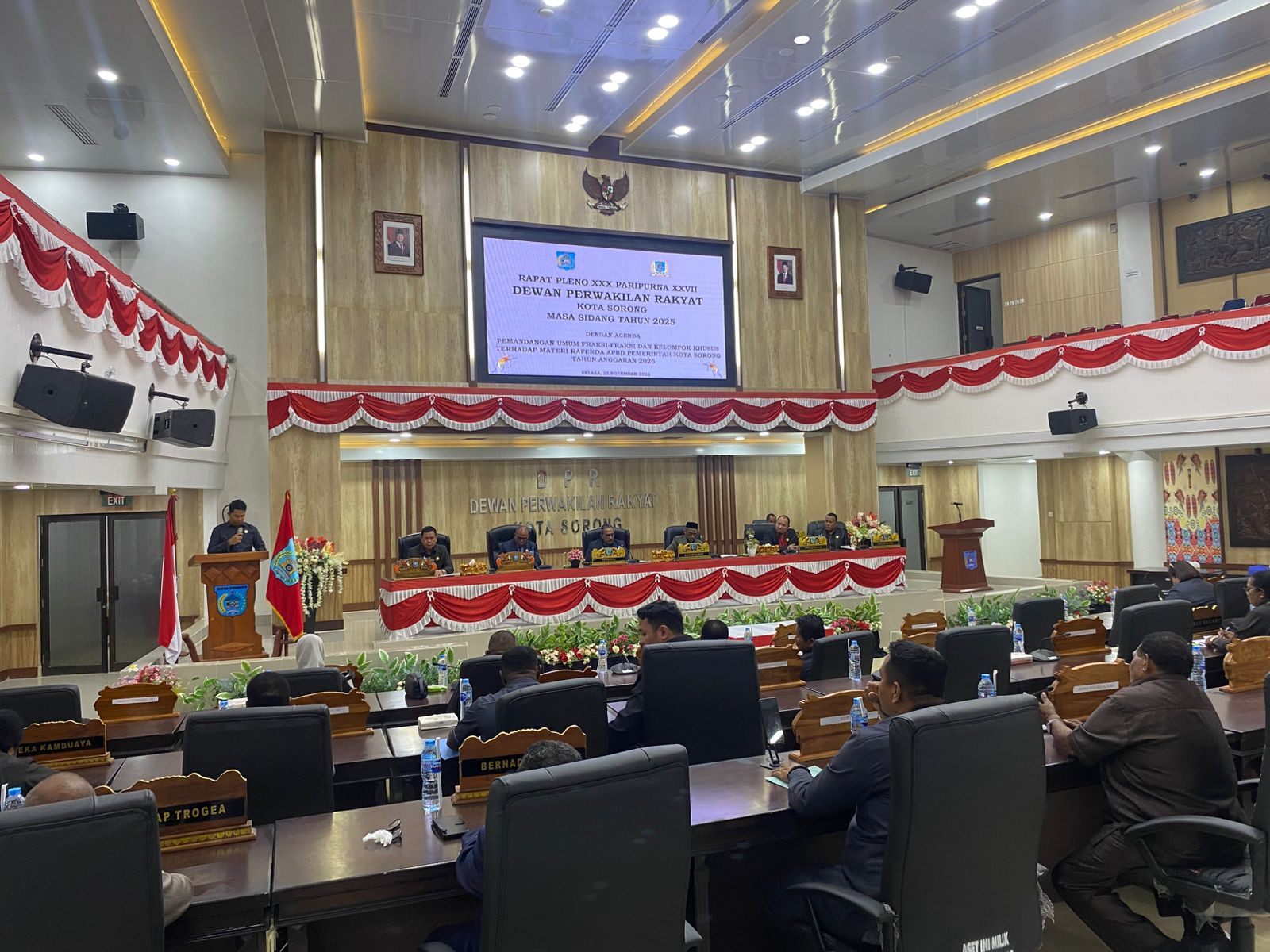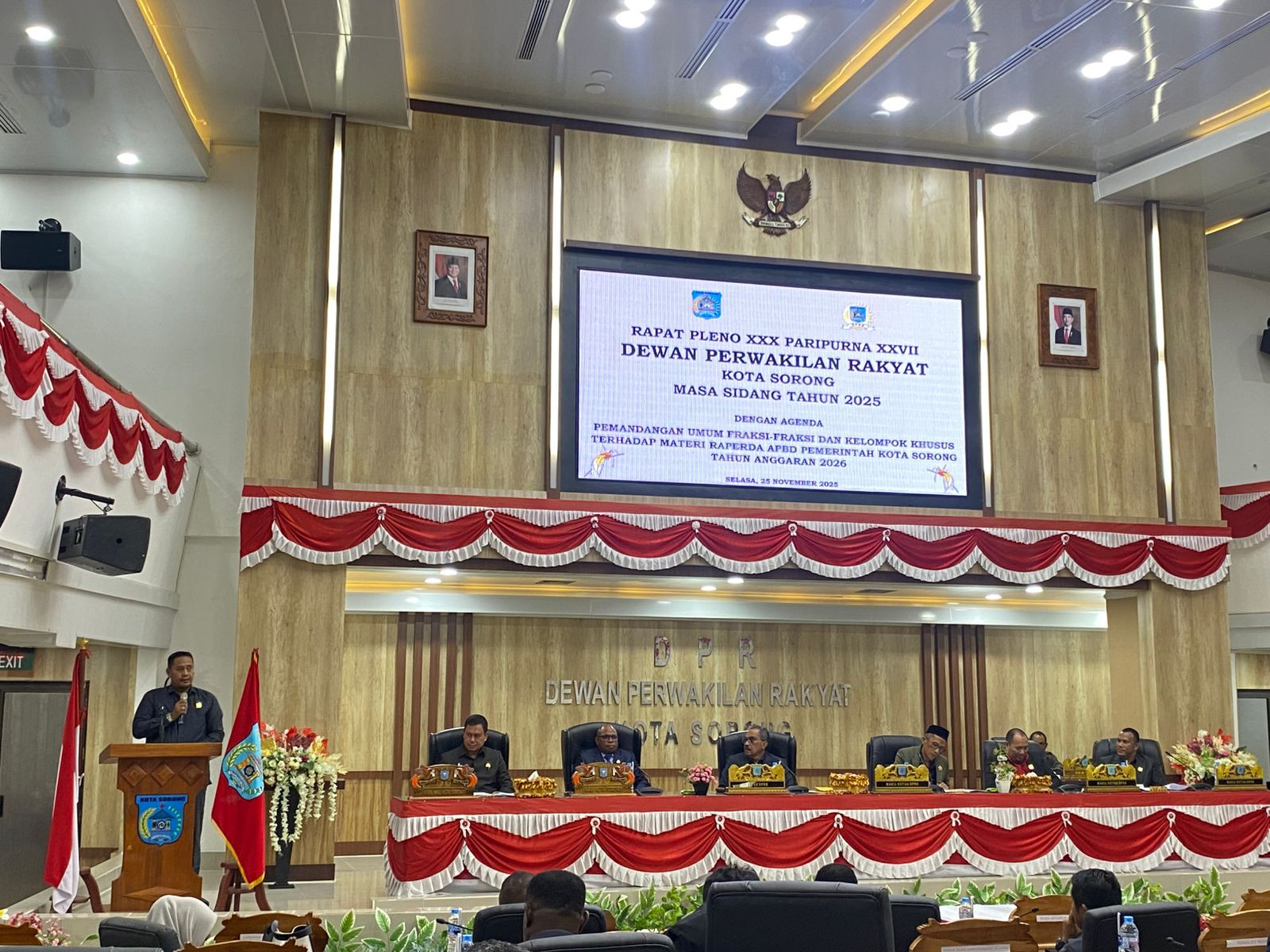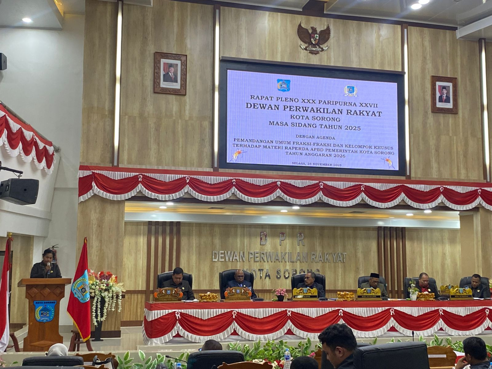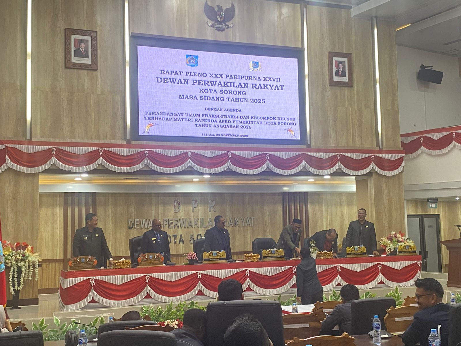 KOTA SORONG, 25 November 2025 – Dewan Perwakilan Rakyat Kota (DPRK) Sorong menggelar Rapat Pleno XXX Paripurna XXVII Masa Sidang Tahun 2025 dengan agenda Pemandangan Umum Fraksi-Fraksi dan Kelompok Khusus terhadap Rancangan Peraturan Daerah (Raperda) APBD Pemerintah Kota Sorong Tahun Anggaran 2026.