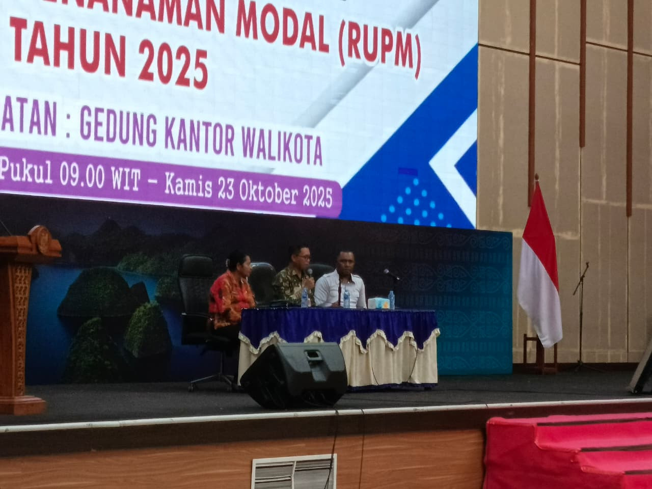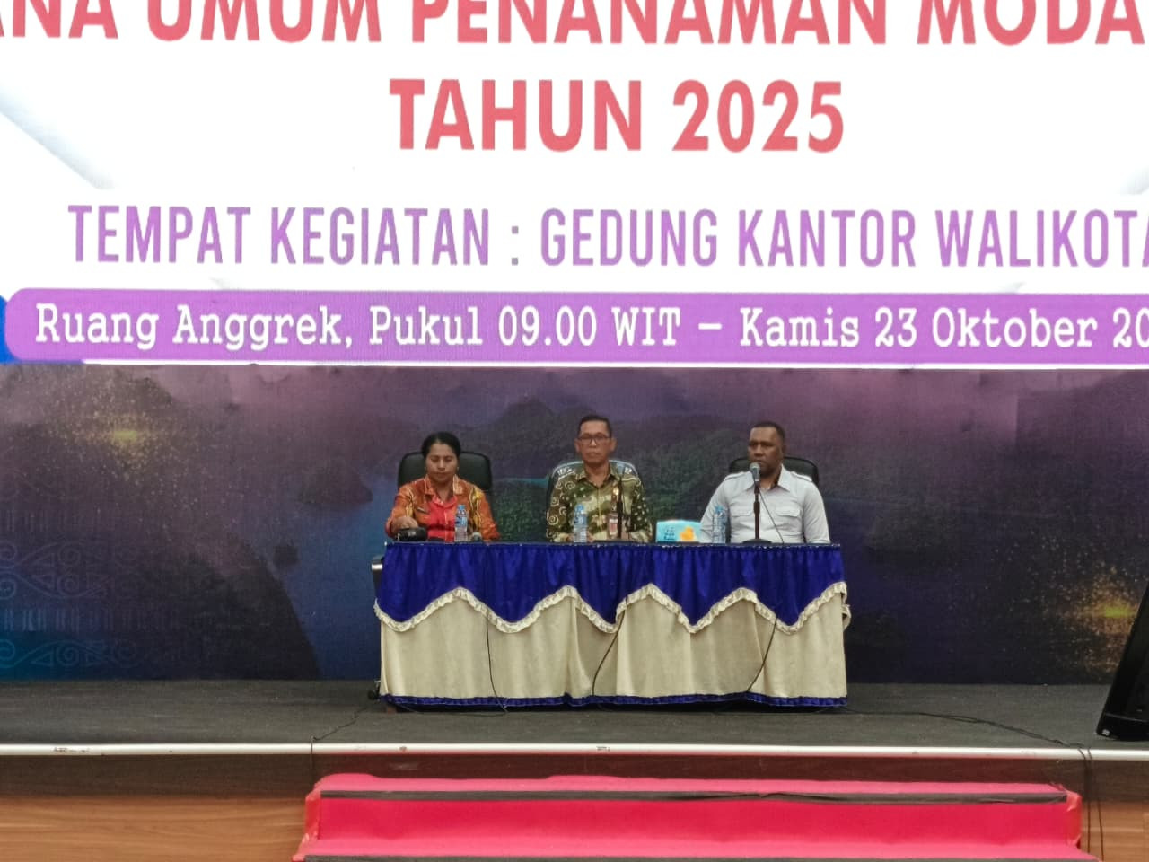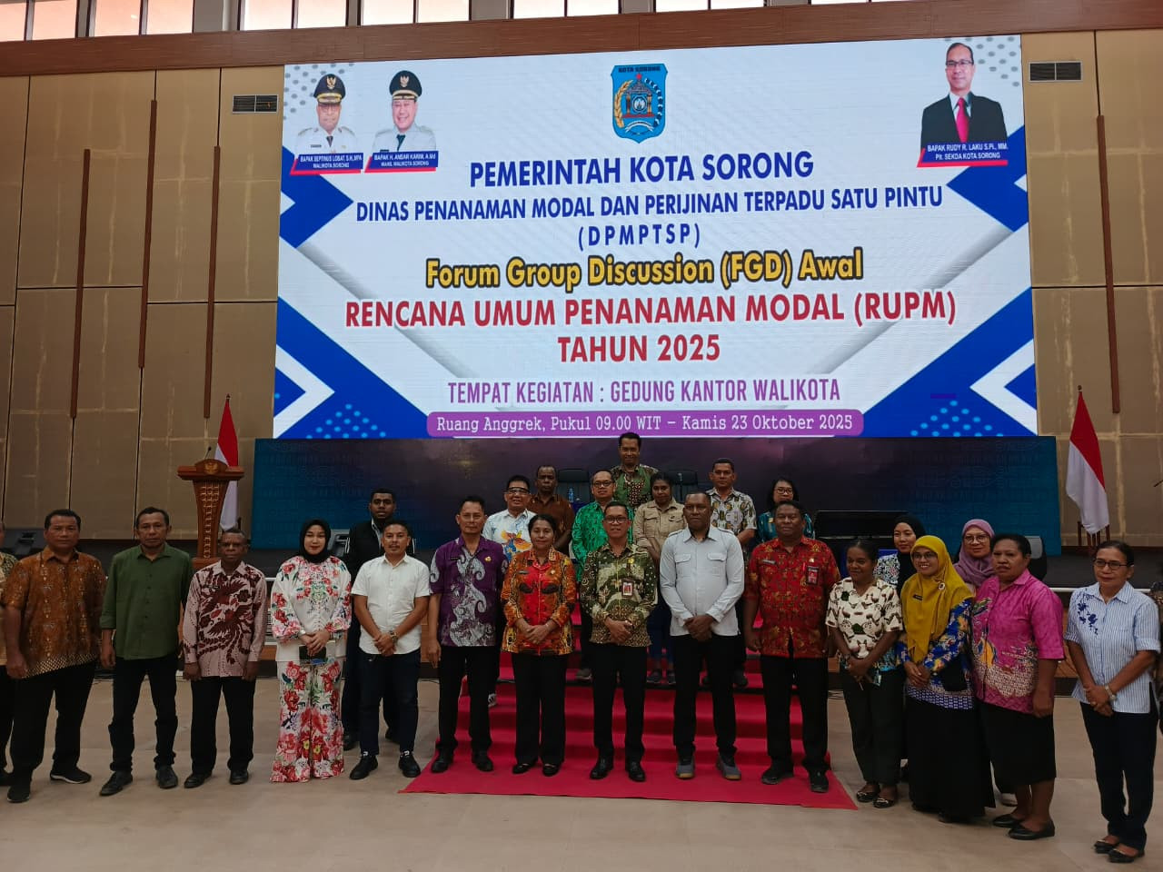 Kota Sorong, 23 Januari 2025 — Asisten Bidang Administrasi, Perekonomian, dan Pembangunan Sekretariat Daerah Kota Sorong, Thamrin Tajuddin, S.T., M.M., secara resmi membuka kegiatan Forum Group Discussion (FGD) Awal Rencana Umum Penanaman Modal (RUPM) Tahun 2025 yang diselenggarakan oleh Dinas Penanaman Modal dan Pelayanan Terpadu Satu Pintu (DPMPTSP) Kota Sorong, bertempat di Gedung Drs. Ec. L. Jitmau, M.M.