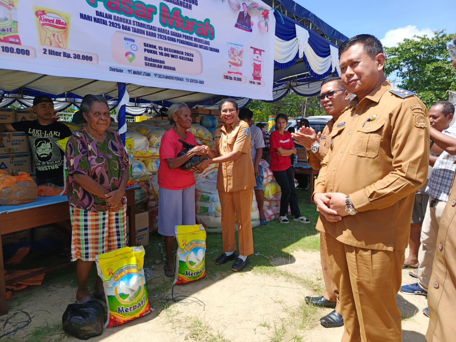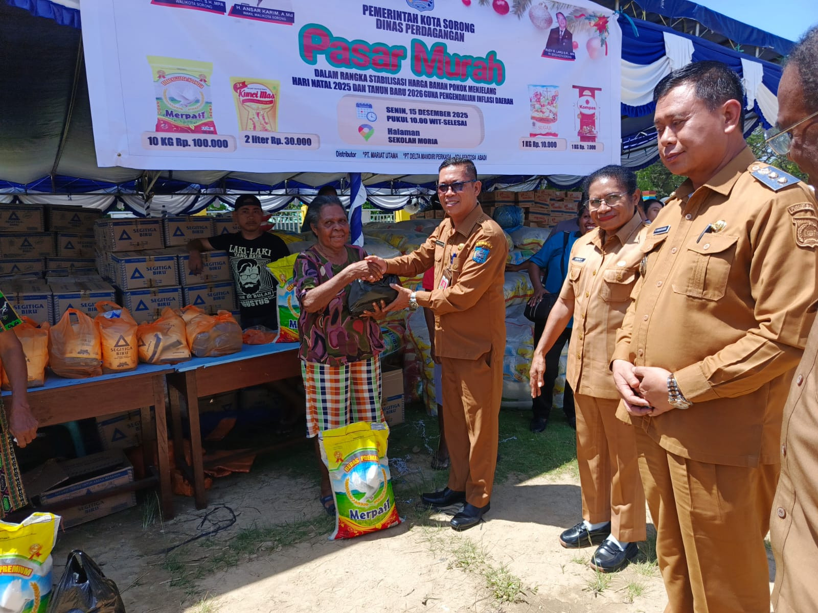 Kota Sorong — Wakil Wali Kota H. Anshar Karim, A.Md., hadir sekaligus membuka secara resmi Kegiatan Pasar Murah dalam rangka Stabilitas Harga Bahan Pokok Menjelang Hari Natal 2025 dan Tahun Baru 2026 guna Pengendalin Inflasi Daerah. Halaman Sekolah Moria. Senin, (51/12/2025).