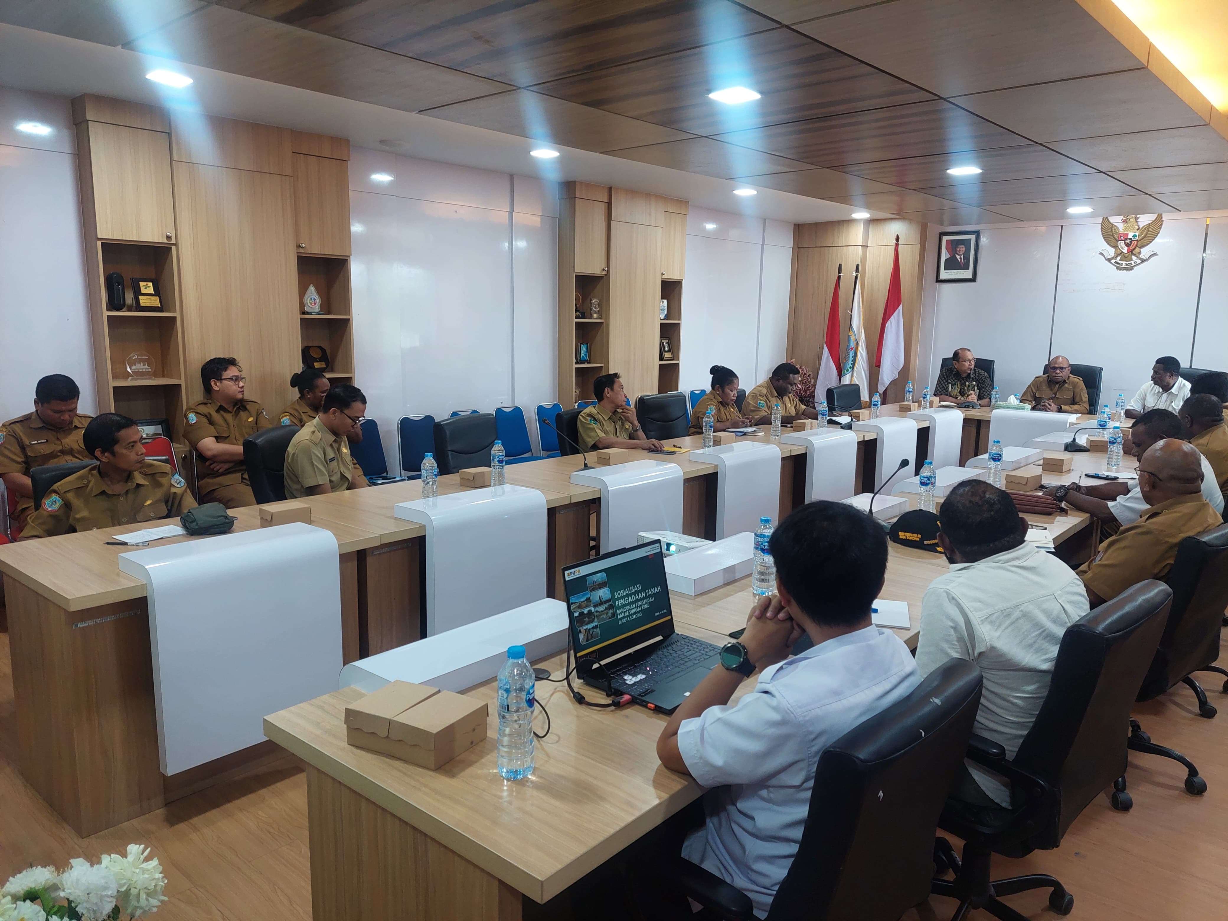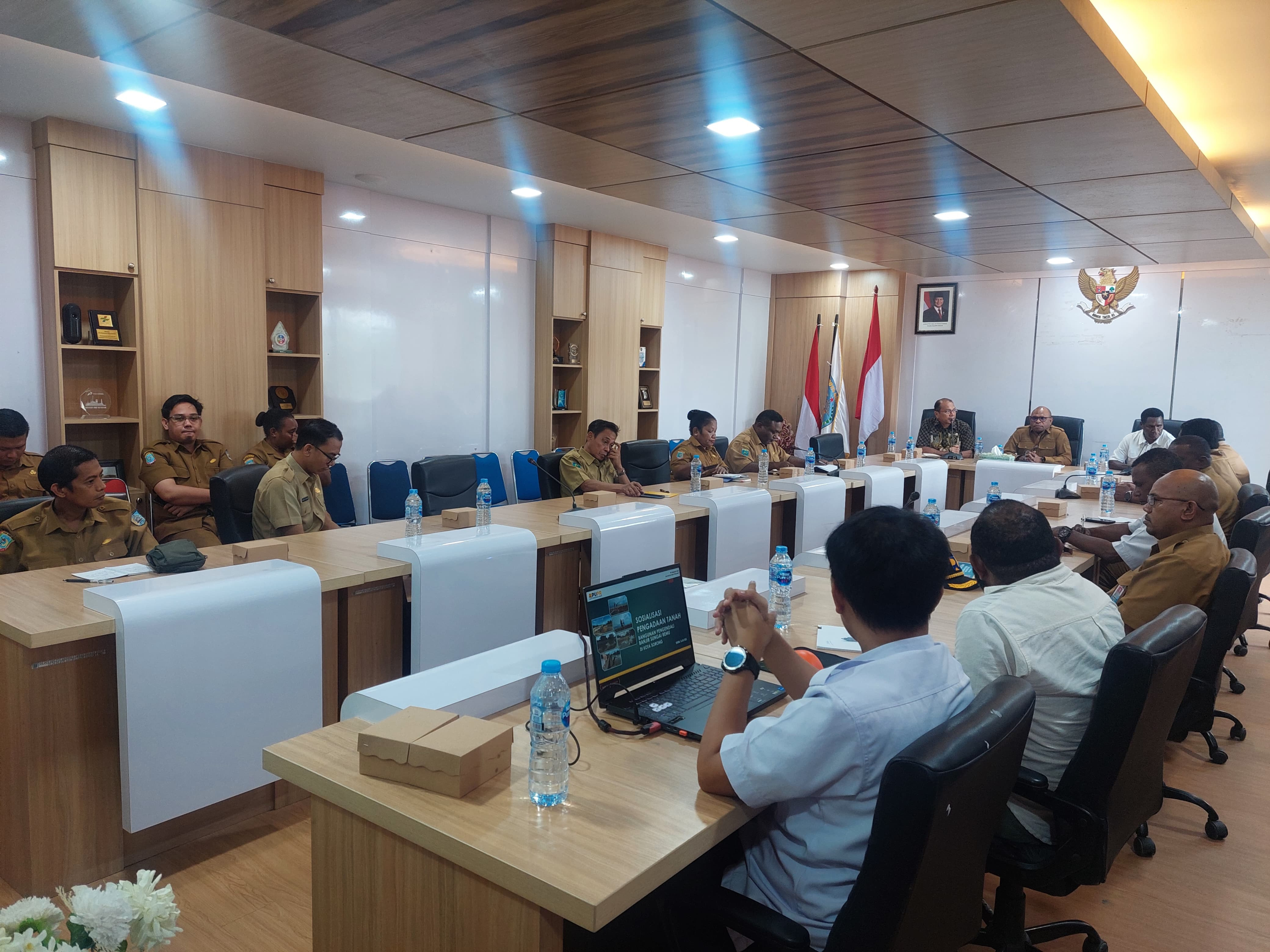Kepala Balai Wilayah Sungai (BWS) Papua Barat di Kota Sorong, Wempi Nauw, ST, MT., bersama Tim, memberikan Paparan kepada Pemerintah Kota Sorong terkait Pengadaan Tanah, Bangunan, Pengendali Banjir, di Sungai Remu Kota Sorong.
