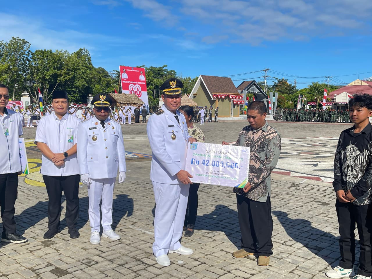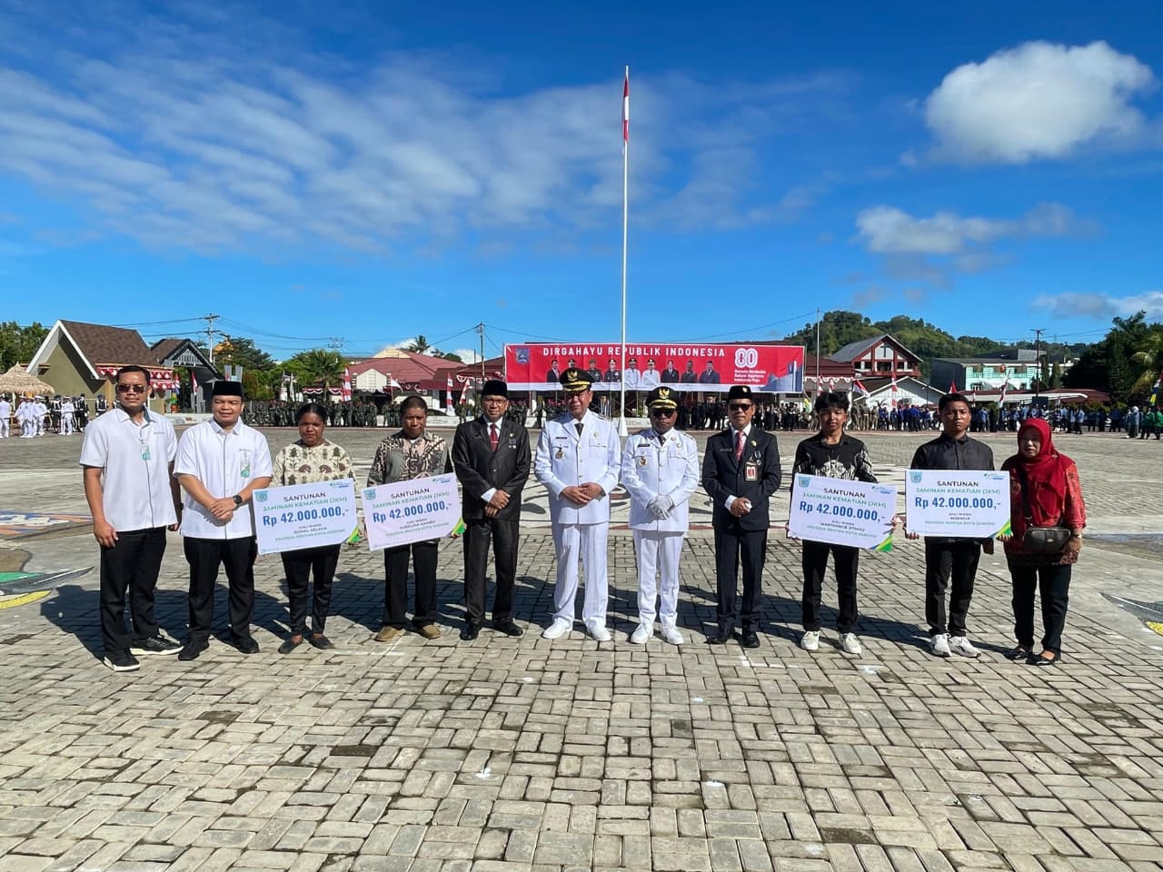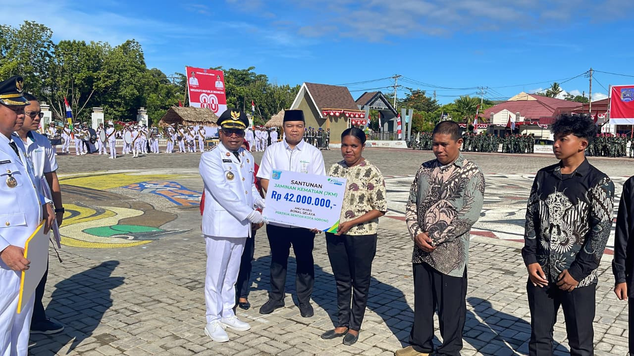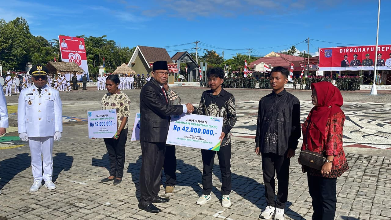 Kemudian, Upacara ini dilanjutkan juga dengan Pemberian Santunan Jaminan Kematian (JKM) kepada Pekerja Rentan Kota Sorong oleh BPJS Ketenegakerjaan yang diterima oleh empat perwakilan keluarga tersebut. (Dinas Kominfo Kota Sorong).