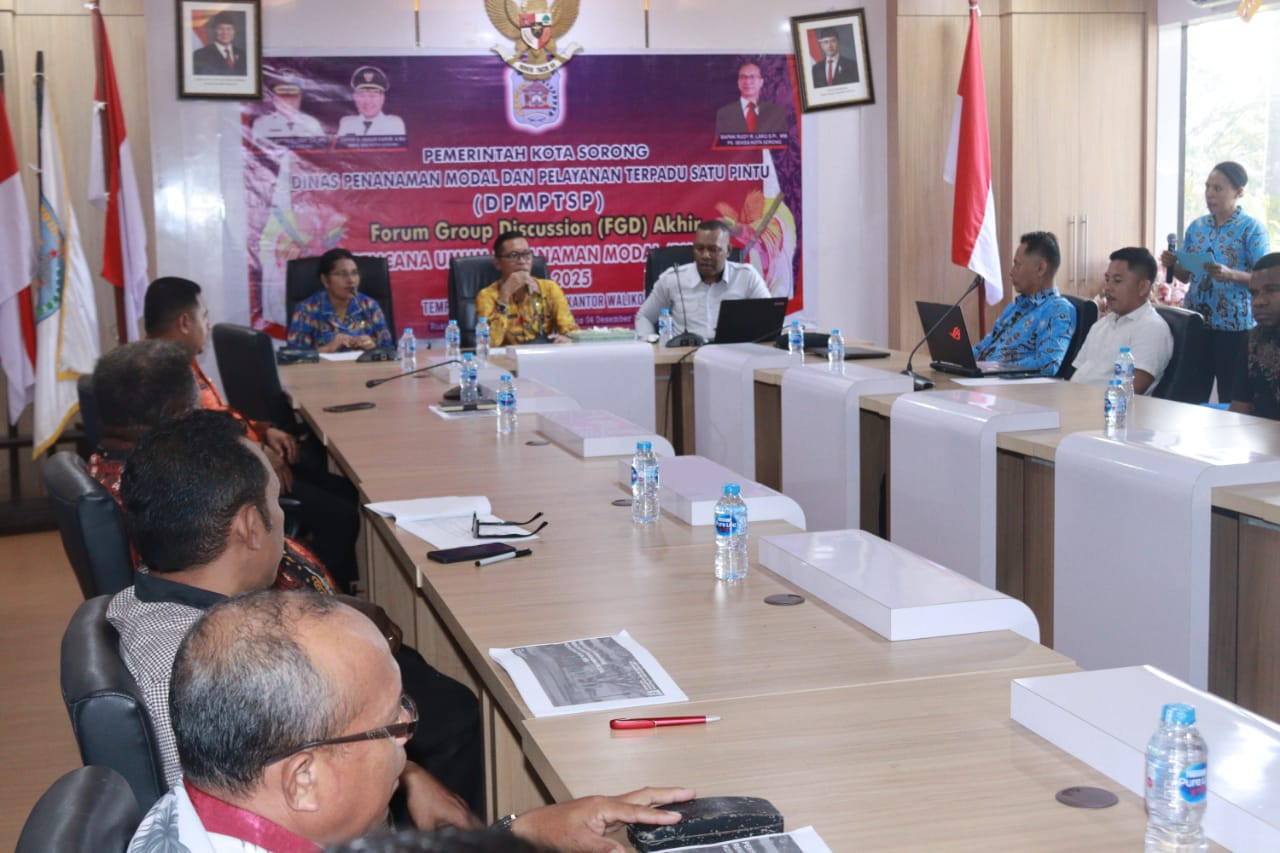 Kota Sorong — Asisten Bidang Perekonomian dan Pembangunan Setda Kota Sorong, juga hadir sebagai Pjs. Sekda Kota Sorong, H. Thamrin Tajuddin, S.T., M.M., hadir pada FGD Rencana Umum Penanaman Modal (RUPM), Pemerintah Kota Sorong menegaskan komitmennya untuk memperkuat iklim investasi daerah melalui penyusunan Rencana Umum Penanaman Modal (RUPM). Dokumen ini dinilai sebagai langkah strategis untuk memetakan dan mengoptimalkan seluruh potensi investasi yang dimiliki daerah. Ruang Rapat Wali Kota Sorong. Kamis, (4/12/2025).