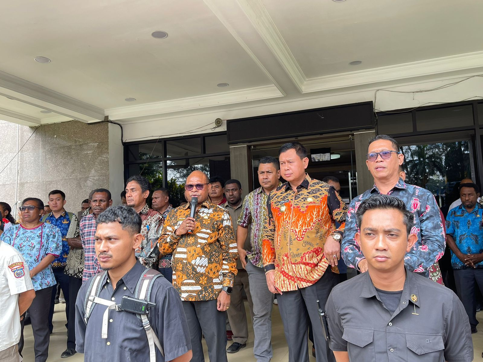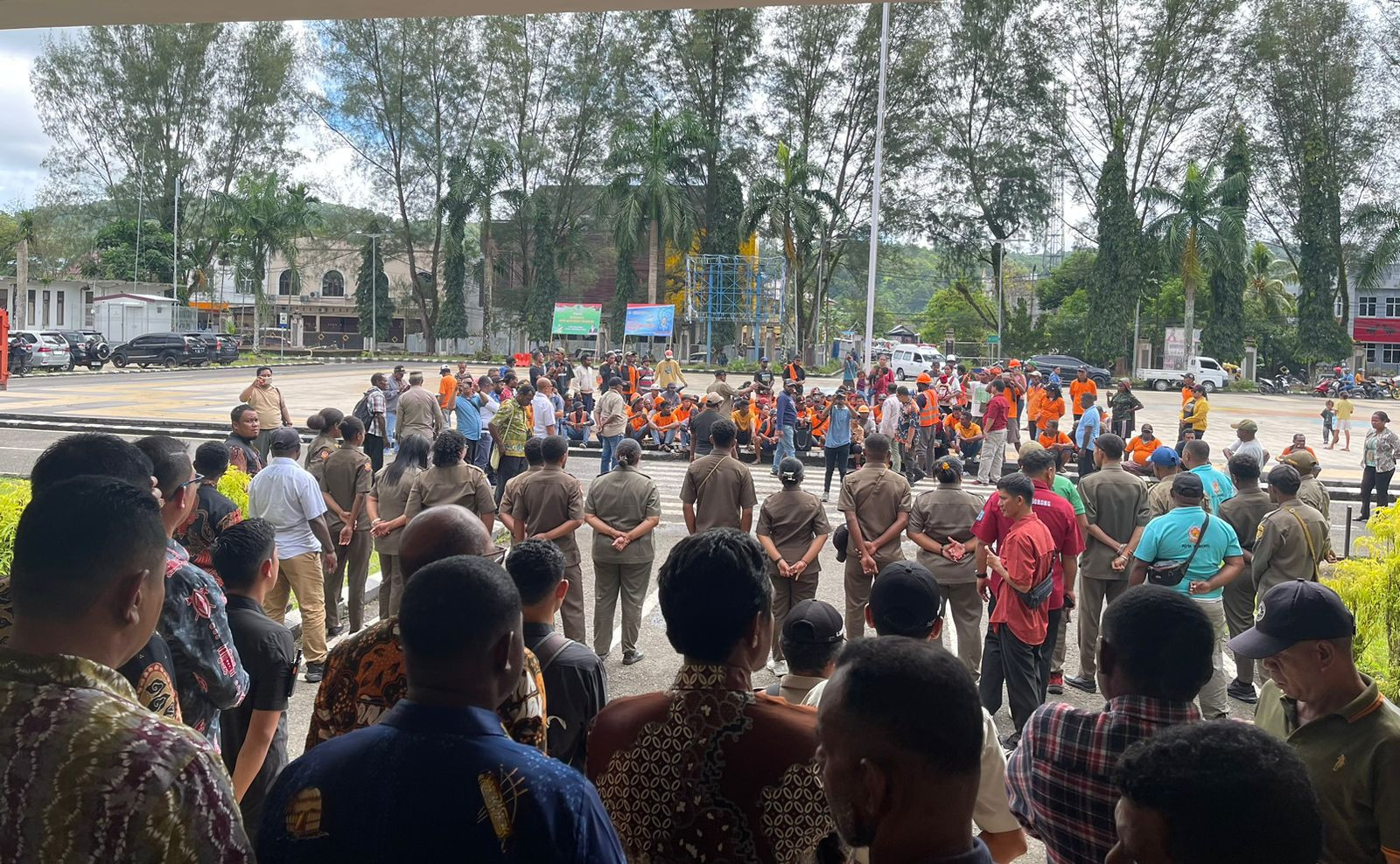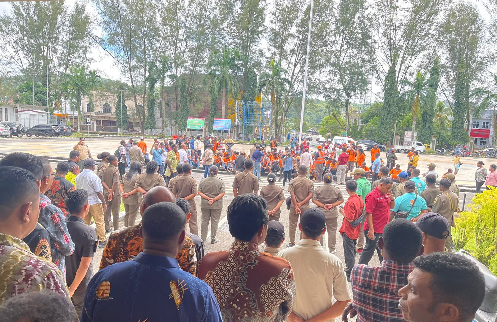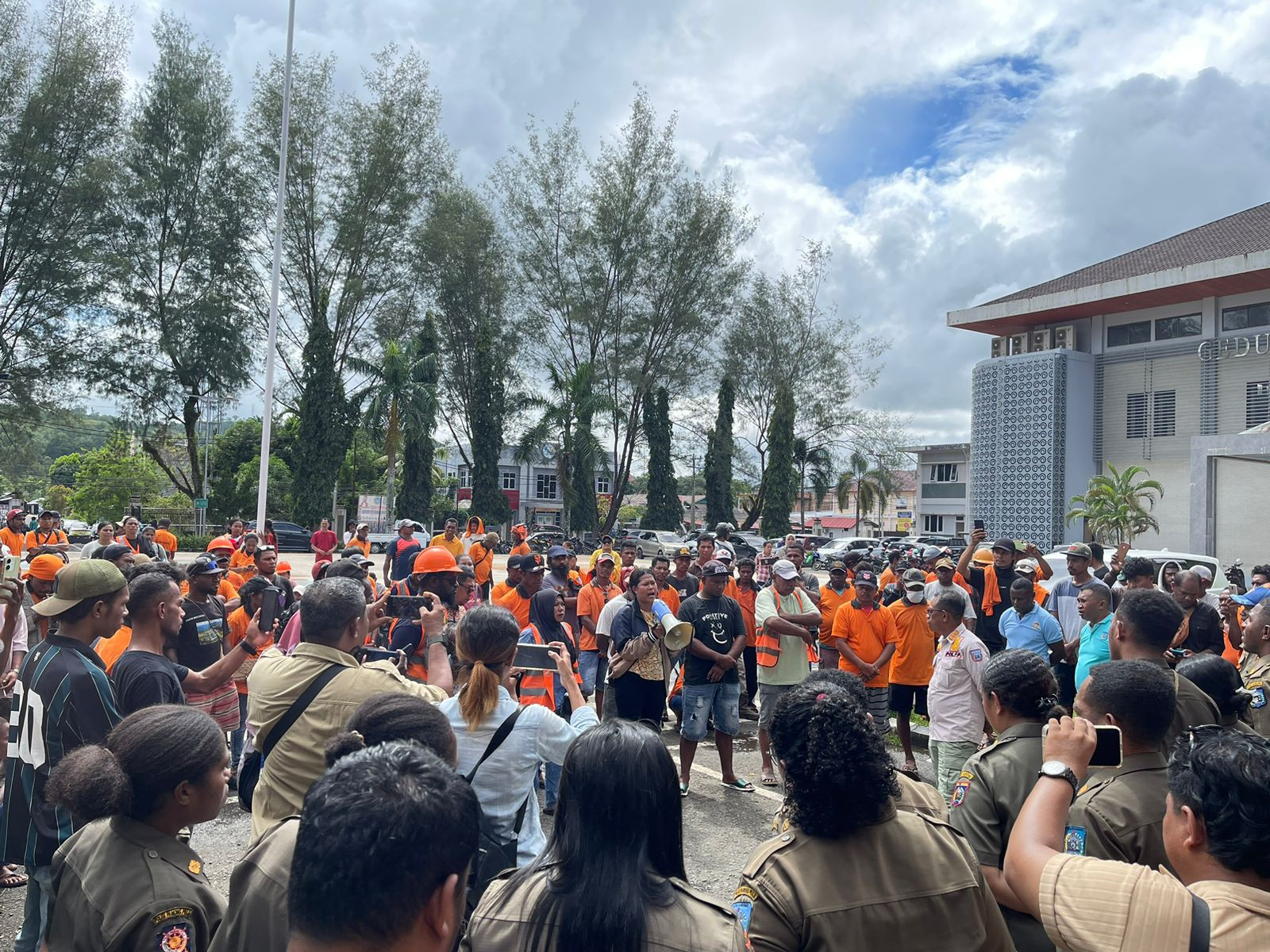 KOTA SORONG — Wali Kota Sorong, Septinus Lobat, S.H., MPA, bersama Wakil Wali Kota H. Anshar Karim, A.Md, turun langsung menemui petugas kebersihan yang sedang melakukan aksi penyampaian aspirasi di halaman Kantor Wali Kota Sorong, Kamis (17/7/2025).