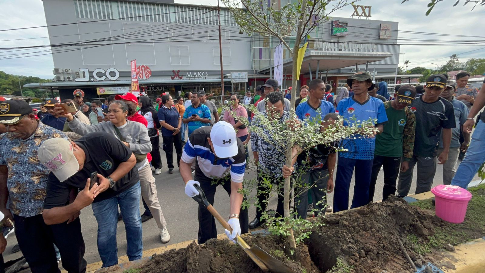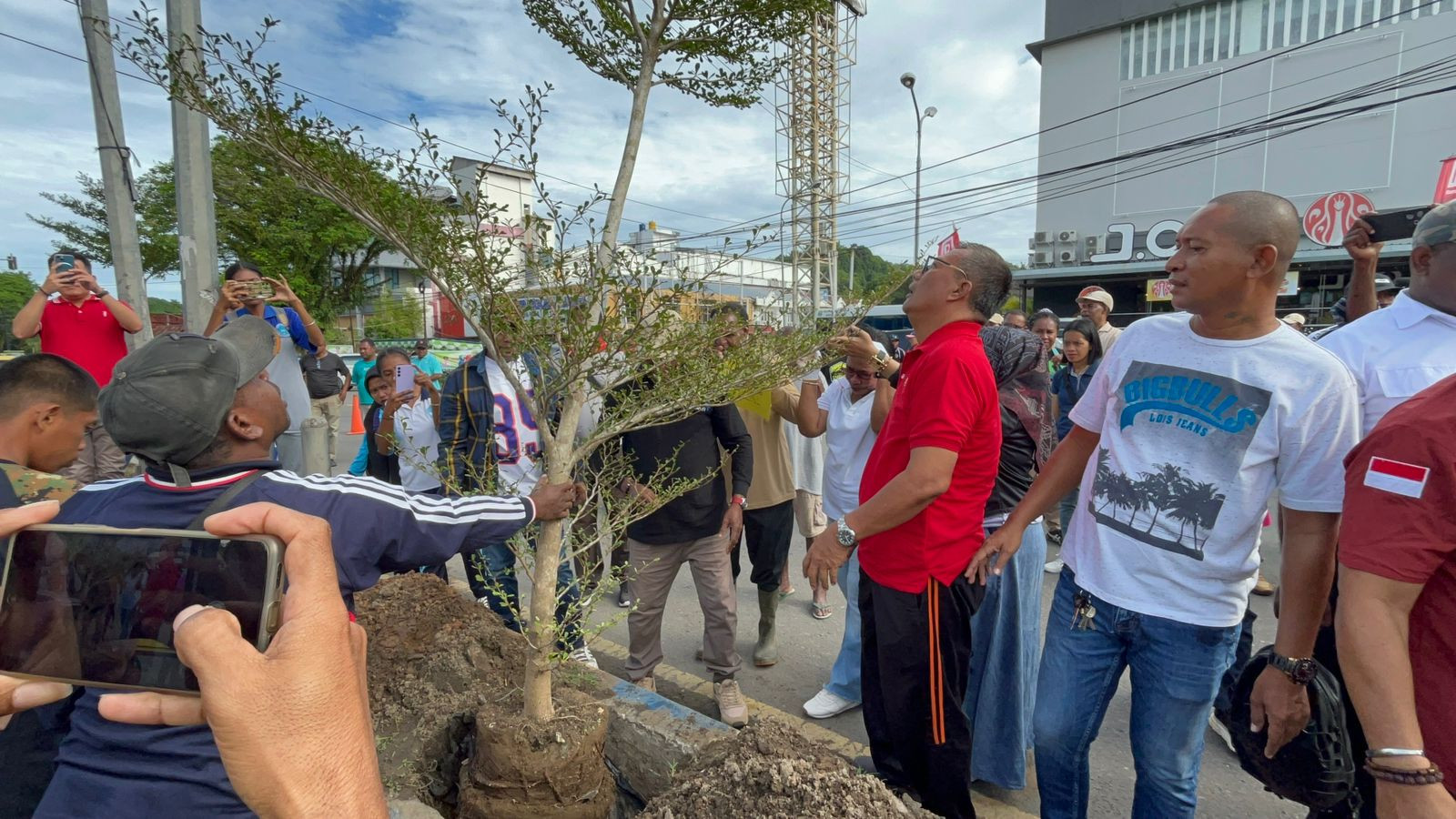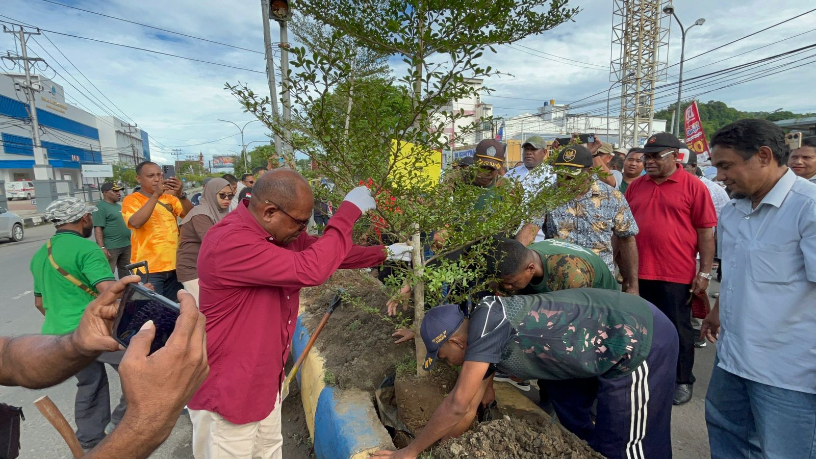 Wali Kota Sorong, Septinus Lobat, S.H., MPA., didampingi Wakil Wali Kota Sorong, H. Anshar Karim, A.Md., bersama Ketua TP-PKK Kota Sorong Jemima Elisabet Windesi, S.K.M., M.A.P., dan para anggota DPRD Kota Sorong, pimpinan OPD beserta para ASN Pemkot Sorong mengikuti kegiatan penanaman pohon dengan tema “Wujudkan Kotq Sorong Sejuk Dengan Menanam Pohon”. Kegiatan ini diselenggarakan oleh Pemerintah Kota Sorong melalui dinas Lingkungan Hidup. Kegiatan ini berlangsung di depan Mal Ramayana kelurahan Kofkerbu Distrik Sorong, Kota Sorong. Jumat, (11/7/2025).