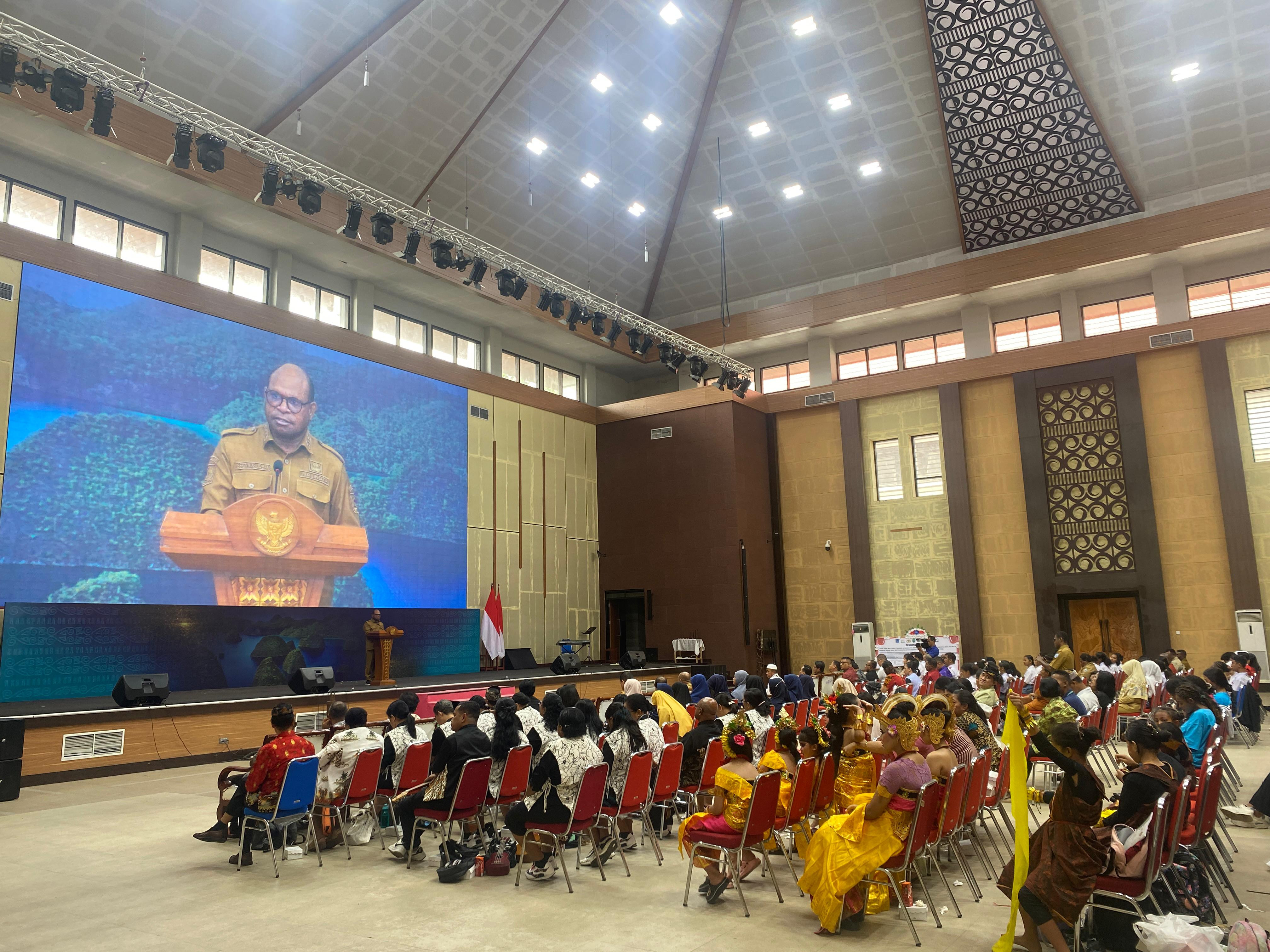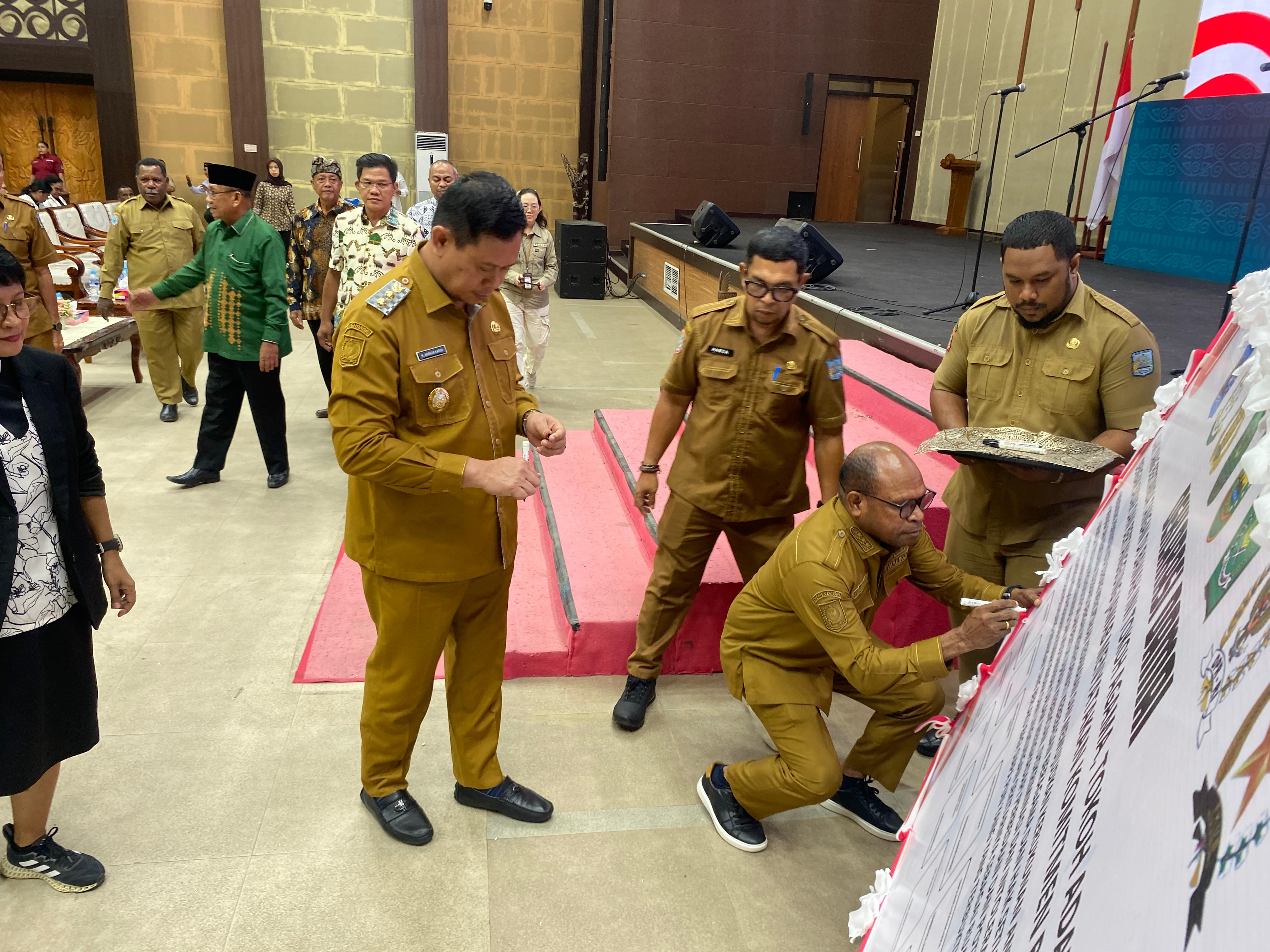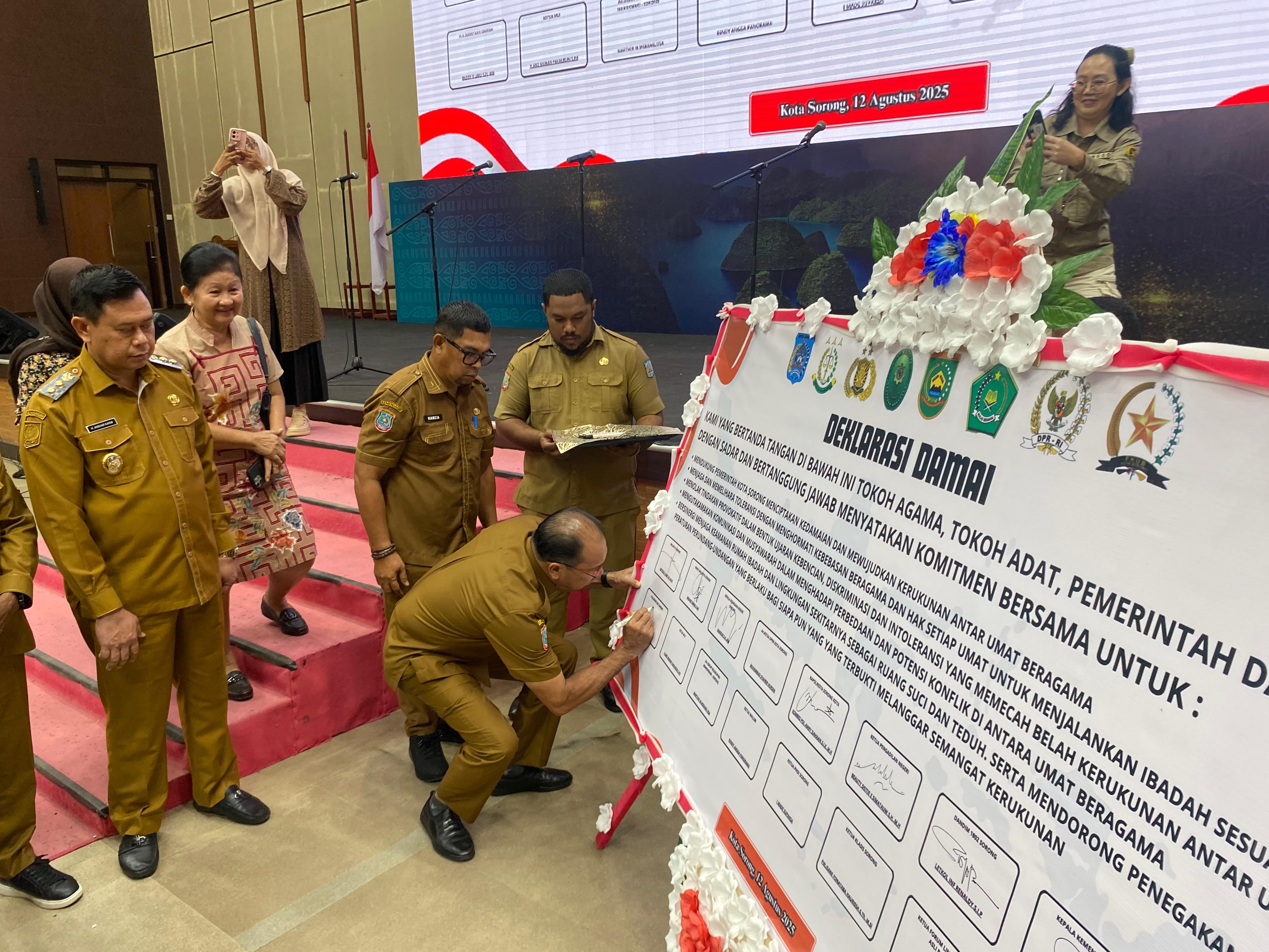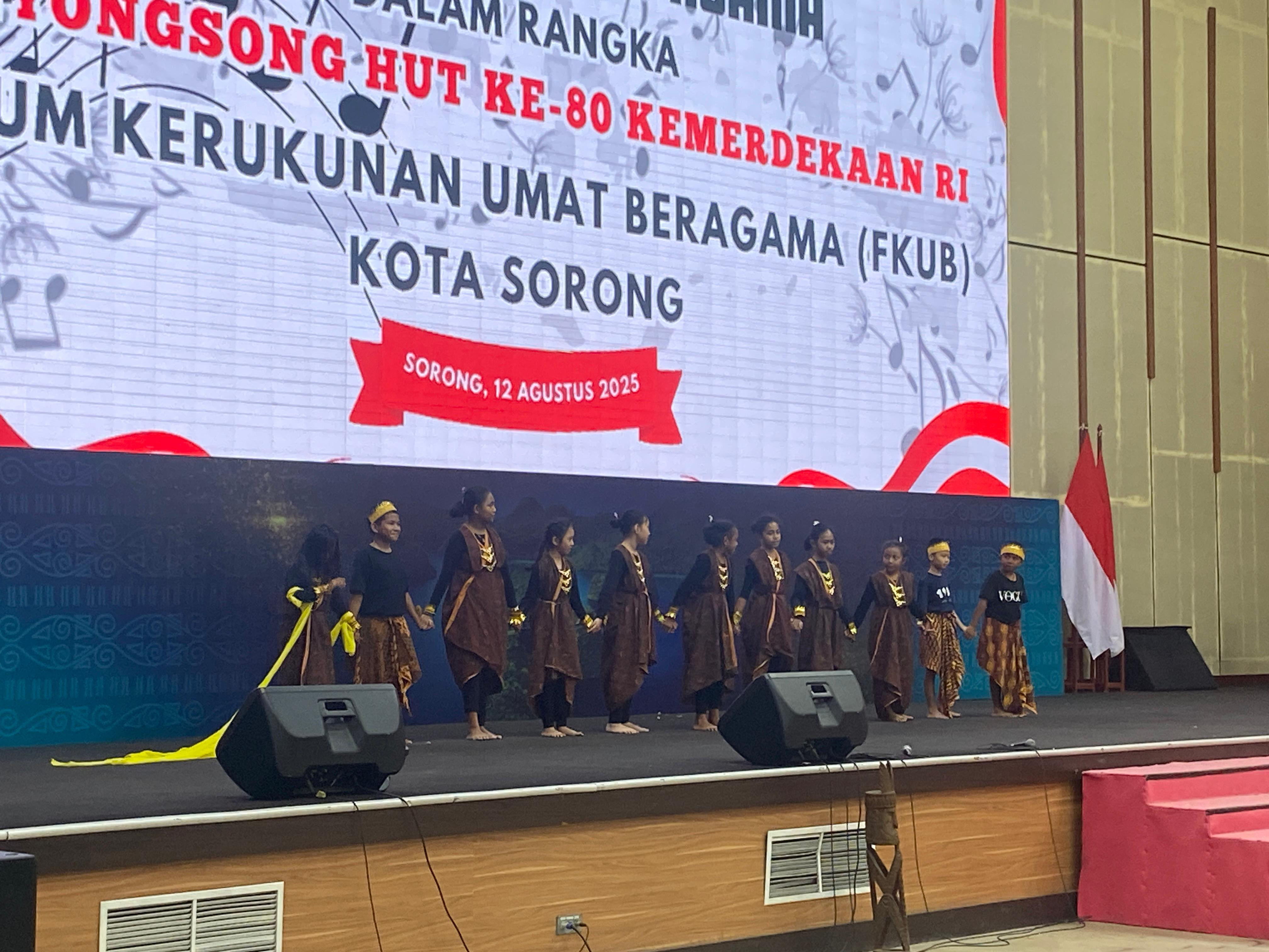 KOTA SORONG - Pentas Seni Lintas Agama sekaligus Deklarasi Damai dalam rangka menyambut HUT ke-10 Kemerdekaan Republik Indonesia yang diselenggarakan oleh Forum Kerukunan Umat Beragama (FKUB) Kota Sorong, di Gedung LJ. Selasa, (12/8/2025).|