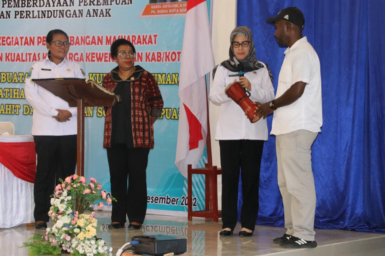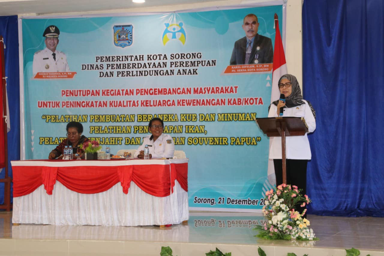 Dalam Rangka Penutupan Pelatihan Menjahit, Pelatihan Souvenir Khas Papua, Pelatihan Pembuatan Beraneka Kue Dan Minuman, Serta Pelatihan Pengasapan Ikan, Rabu, (21/12/2022), Gedung, Welly Tigtigweria. Pj. Wali Kota Sorong, George Yarangga, A.PI,MM, yang diwakilkan oleh Staf Ahli bidang kemasyarakatan dan Sumber Daya Manusia, Gamar Malabar, S.Sos,MM, memberikan Apresiasi kepada Dinas Pemberdayaan Perempuan dan Perlindungan Anak Kota Sorong atas niat dan perhatian yang baik kepada pengrajin yang ada dikota sorong.