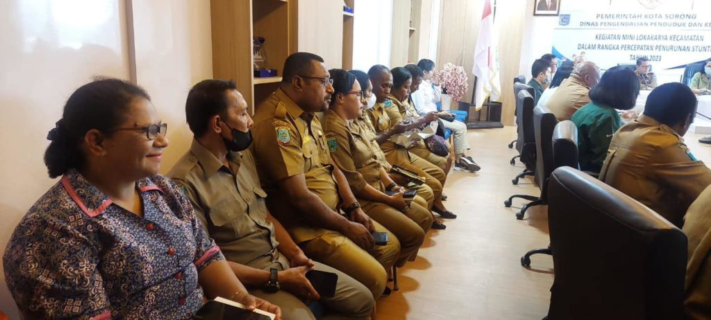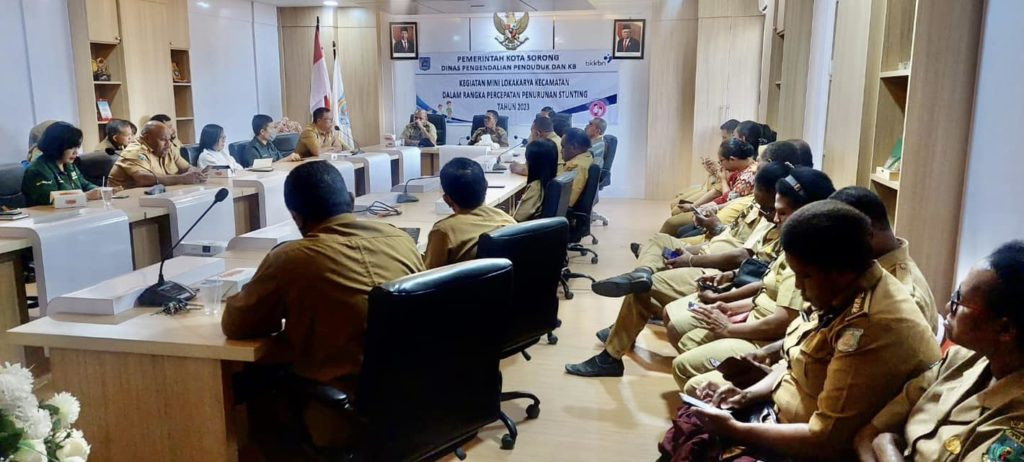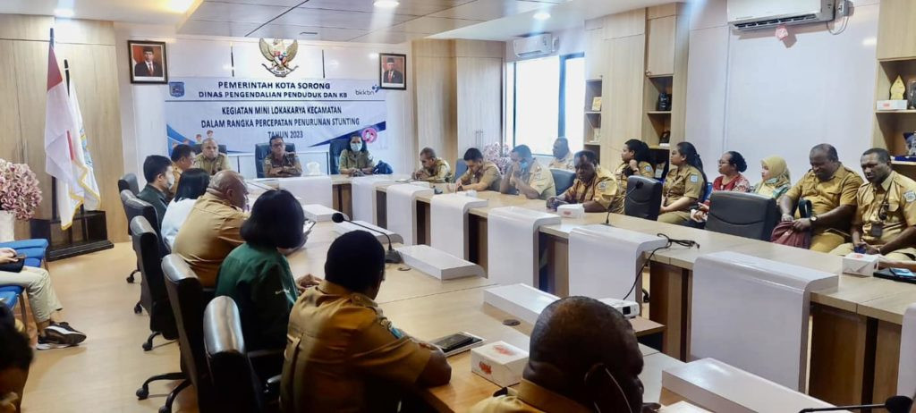 H. Thamrin Tajuddin, S.T., MM., selaku Asisten II SETDA Kota Sorong, mewakili Pj. Wali kota Sorong, George Yarangga, A.PI. MM., dalam Kegiatan Mini Lokakarya Kecamatan dalam Rangka Percepatan Penurunan Stunting Tahun 2023, yang diselenggarakan oleh Dinas Pengendalian Penduduk dan KB. Ruang Anggrek, Kantor Wali Kota Sorong. Selasa, (15/8/2023). Ny. Jaquline M. Yarangga selaku Pj. Ketua Tim PKK Kota Sorong, turut hadir dalam pertemuan tersebut. Rapat dilaksanakan guna mendiskusikan Penanganan Stunting di Kota Sorong.