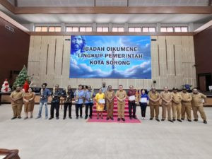 Penjabat Wali Kota Sorong, Dr. Bernhard Eduard Rondonuwu, S.Sos., M.Si, Menyerahan penghargaan lomba Dekorasi Natal di Lingkup Kantor dan Badan Usaha Kota serta lomba Pondok Natal 2024. Acara berlangsung meriah di Gedung Lamberthus Jitmau, Senin 13 Januari 2024, yang dihadiri para peserta dan masyarakat.