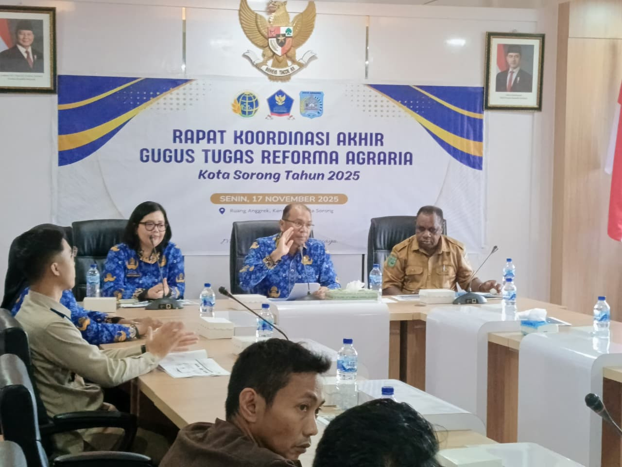 Kota Sorong — Plt. Sekretaris Daerah Kota Sorong, Ruddy R. Laku, S.Pi., M.M., secara resmi membuka Rapat Koordinasi Akhir Gugus Tugas Reforma Agraria Tahun 2025, yang digelar sebagai bentuk evaluasi menyeluruh terhadap seluruh kegiatan reforma agraria yang telah dilaksanakan sepanjang tahun berjalan. Ruang Anggrek, Lt.II, Kantor Wali Kota Sorong. Senin, (17/11/2025).