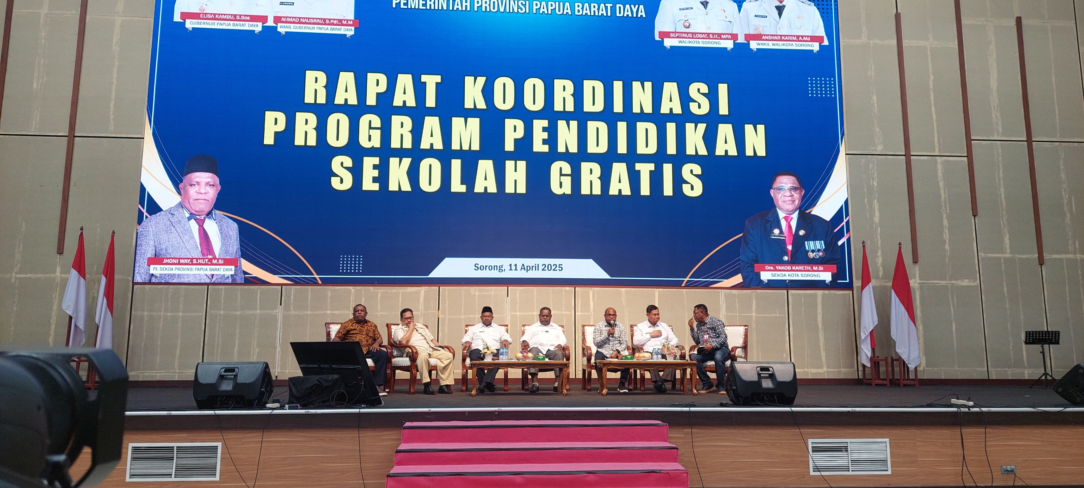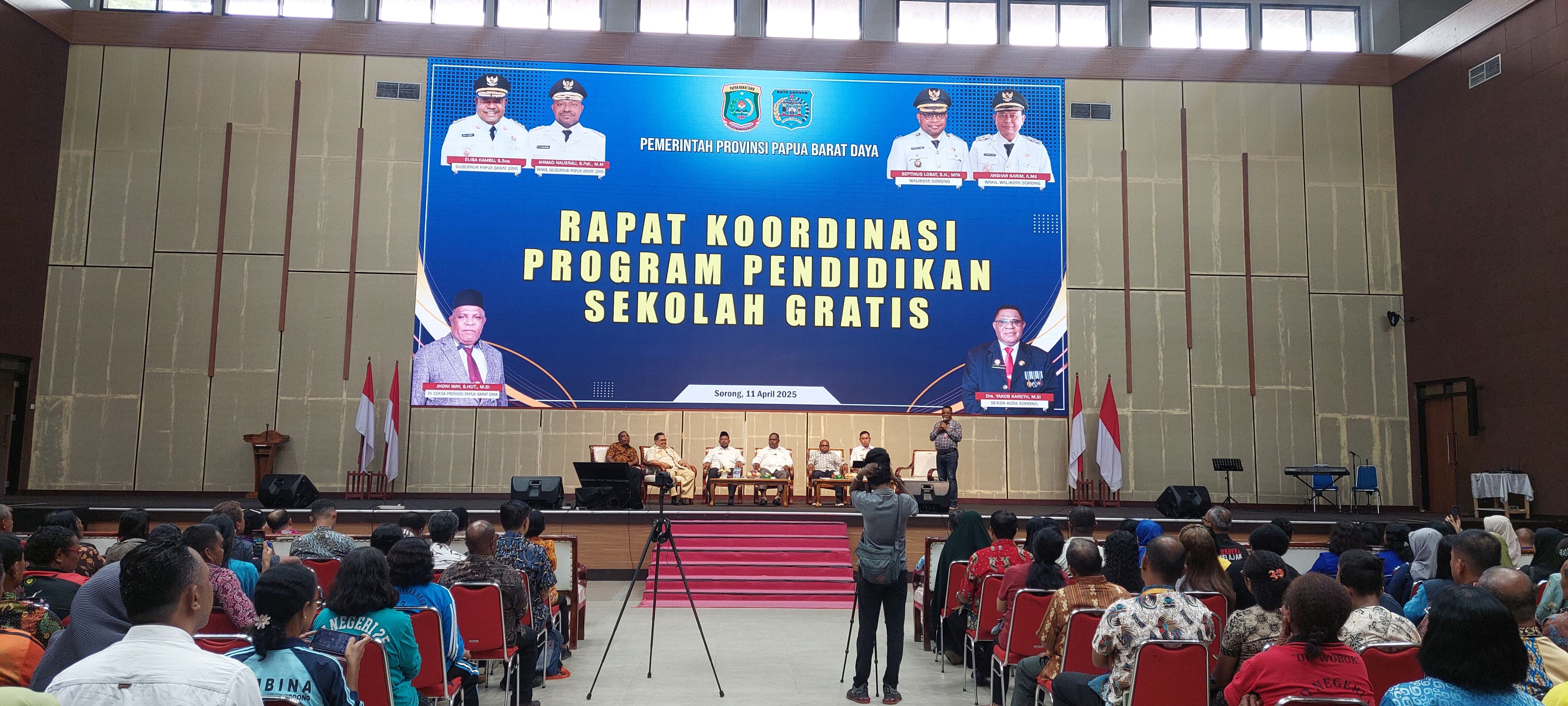 Kota Sorong - Wali Kota Sorong, Septinus Lobat, S.H., MPA., bersama Wakil Wali Kota Sorong, Anshar Karim, A.Md., dan Sekretaris Daerah Kota Sorong, Drs. Yakob M. Kareth, M.Si., hadir pada Rapat Koordinasi Program Pendidikan Sekolah Gratis, Rapat Koordinasi ini jgga dihadiri langsung oleh Elisa Kambu, S.Sos., selaku Gubernur Provinsi Papua Barat Daya, didampingi oleh Wakil Gubernur Provinsi Papua Barat Daya, Ahmad Nausrau, S.Pd.I., M.M., Pj. Sekretaris Daerah Provinsi Papua Barat Daya, Jhoni Way, S.HUY., M.Si., dan Otto Ihalauw., MA., selaku Ketua Perwakilan Badan Pengarah Percepatan Pembangunan Otonomi Khusus Papua (BP3OKP) Papua Barat Daya. Gedung Drs. Ec L. Jitmau, MM, Jumat, (11/4/2025).