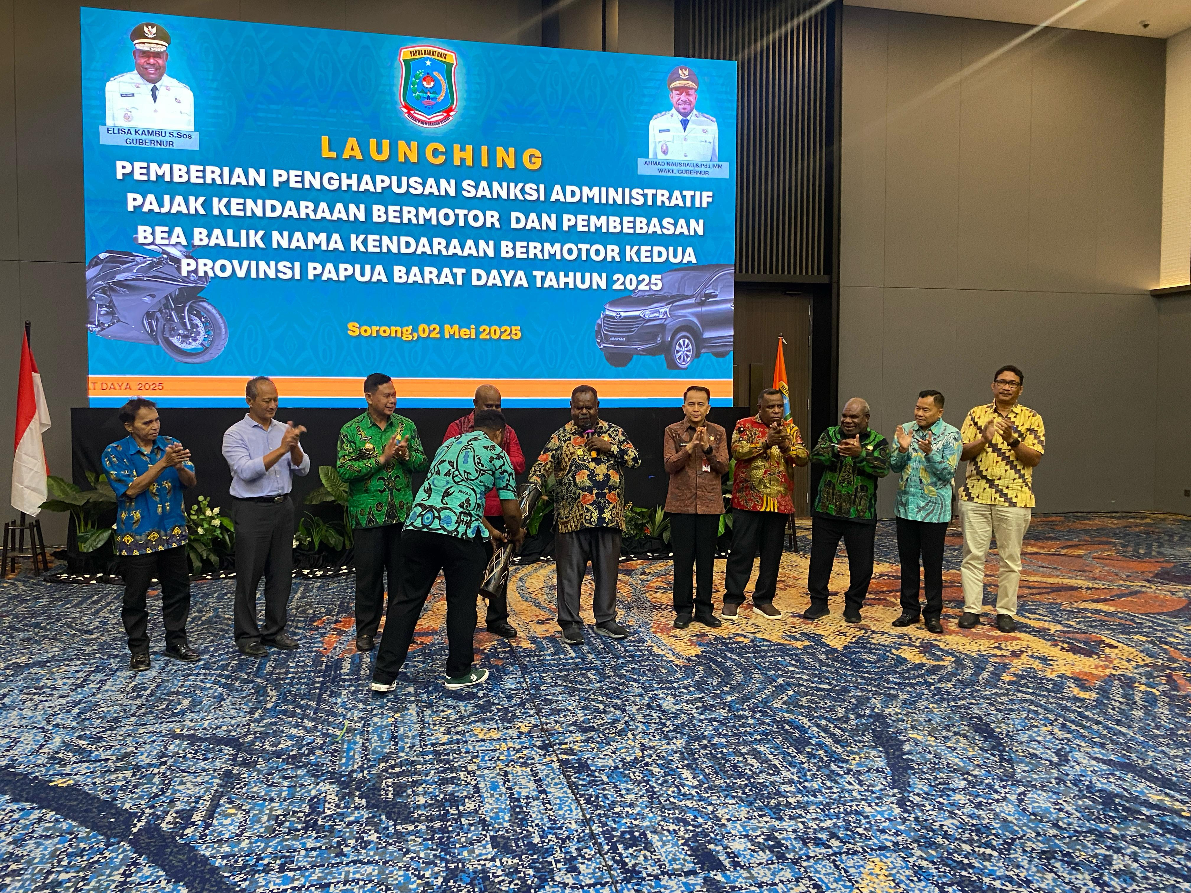 Usai itu, Gubernur Papua Barat Daya meresmikan program pemberian penghapusan sanksi administratif pajak kendaraan bermotor dan pembebasan bea balik nama kendaraan bermotor kedua Provinsi Papua Barat Daya tahun 2025, dengan disaksi oleh Dirjen Bangda serta para tamu hadirin lainnya.(Dinas Kominfo Kota Sorong).
