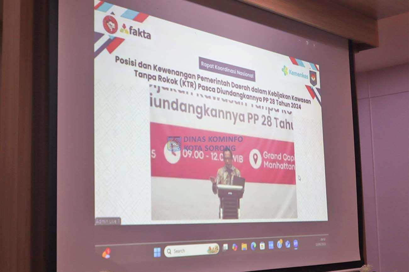 Kementerian Kesehatan RI menggelar Rapat Koordinasi Nasional Posisi dan Kewenangan Pemerintah Daerah Dalam Kebijakan Kawasan tanpa Rokok, Kamis (12/6/2025). Sekretaris Daerah Kota Sorong diwakili Kepala Bidang P2P Dinas Kesehatan, Jenny Isir, SKM, Perwakilan Kabag Hukum, dan Kepala Seksi Pencegahan dan Pengendalian Penyakit Tidak Menular (P2PTM) Dinas Kesehatan, turut mengikuti kegiatan tersebut secara virtual melalui Zoom Meeting, di Ruang Anggrek Kantor Wali Kota Sorong. Menteri Dalam Negeri, Tito Karnavian dalam sambutannya mengatakan, pemerintah sudah mengeluarkan banyak regulasi, oleh karena itu, pemerintah perlu melakukan intervensi yang salah satunya adalah, membuat Kawasan Tanpa Rokok (KTR). (Diskominfo Kota Sorong)