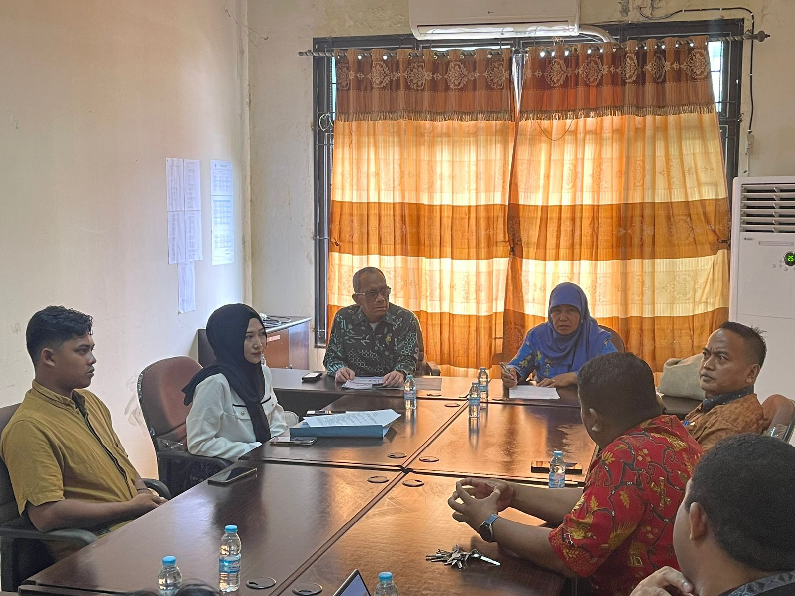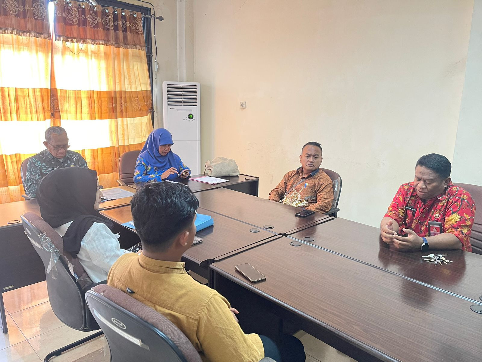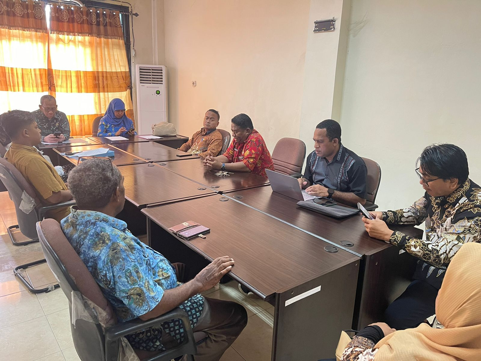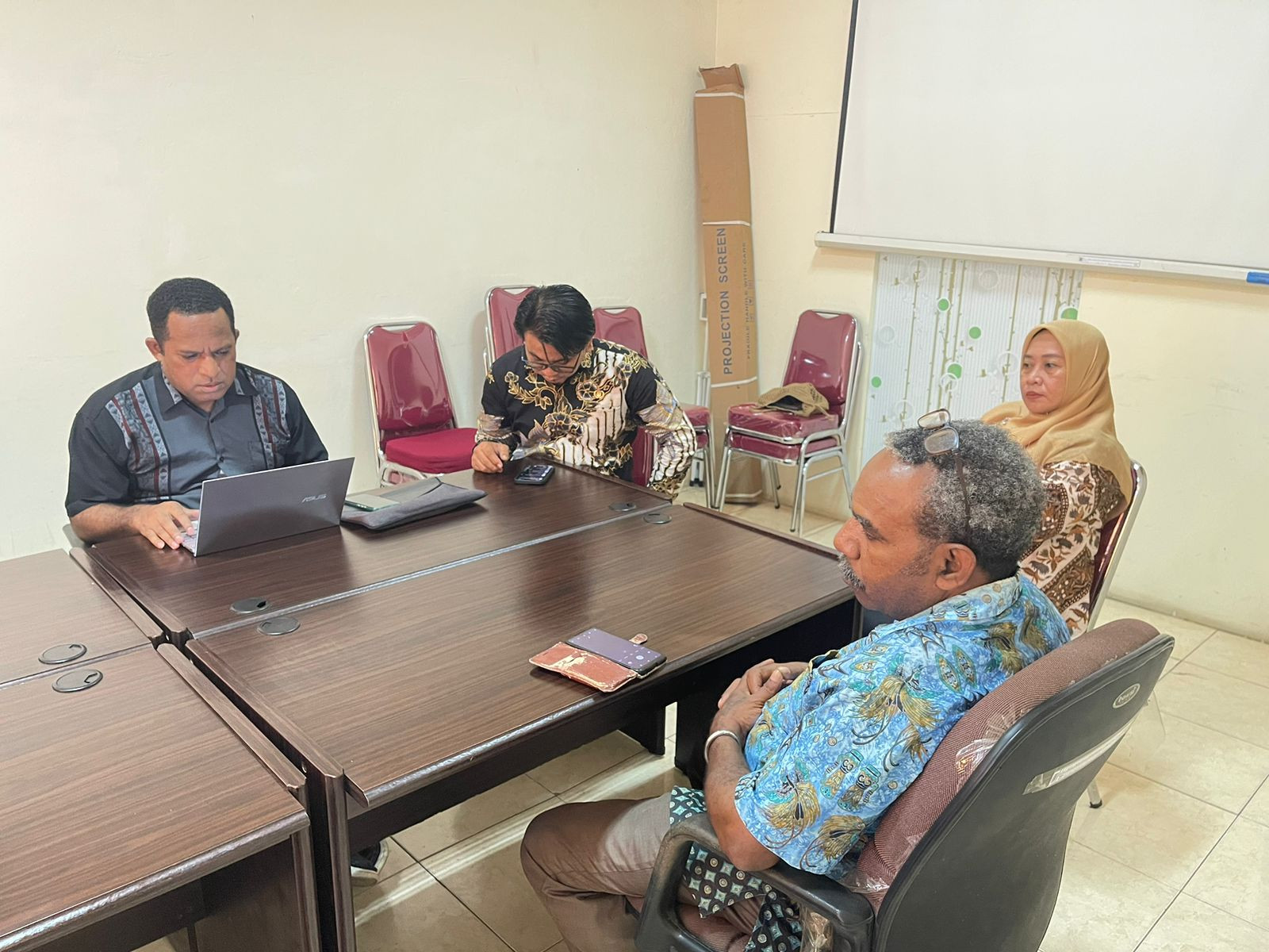 Asisten Bidang Administrasi Umum, Hanok J. Talla, S.Sos selaku Kepala Dinas DPMPTSP dan Plt. Kepala Dinas Kominfo James Burung, S.Sos., M.M bersama Tim Teknis Dinas Kominfo, Tim DPMPTSP, Tim Teknis Cipta Karya melakukan rapat koordinasi terkait pemasangan Videotron PT. Trans Solution Indonesia. Rapat ini berlangsung di Ruang Rapat DPMPTSP Kota Sorong. Kamis (10/7/2025). (Diskominfo Kota Sorong)