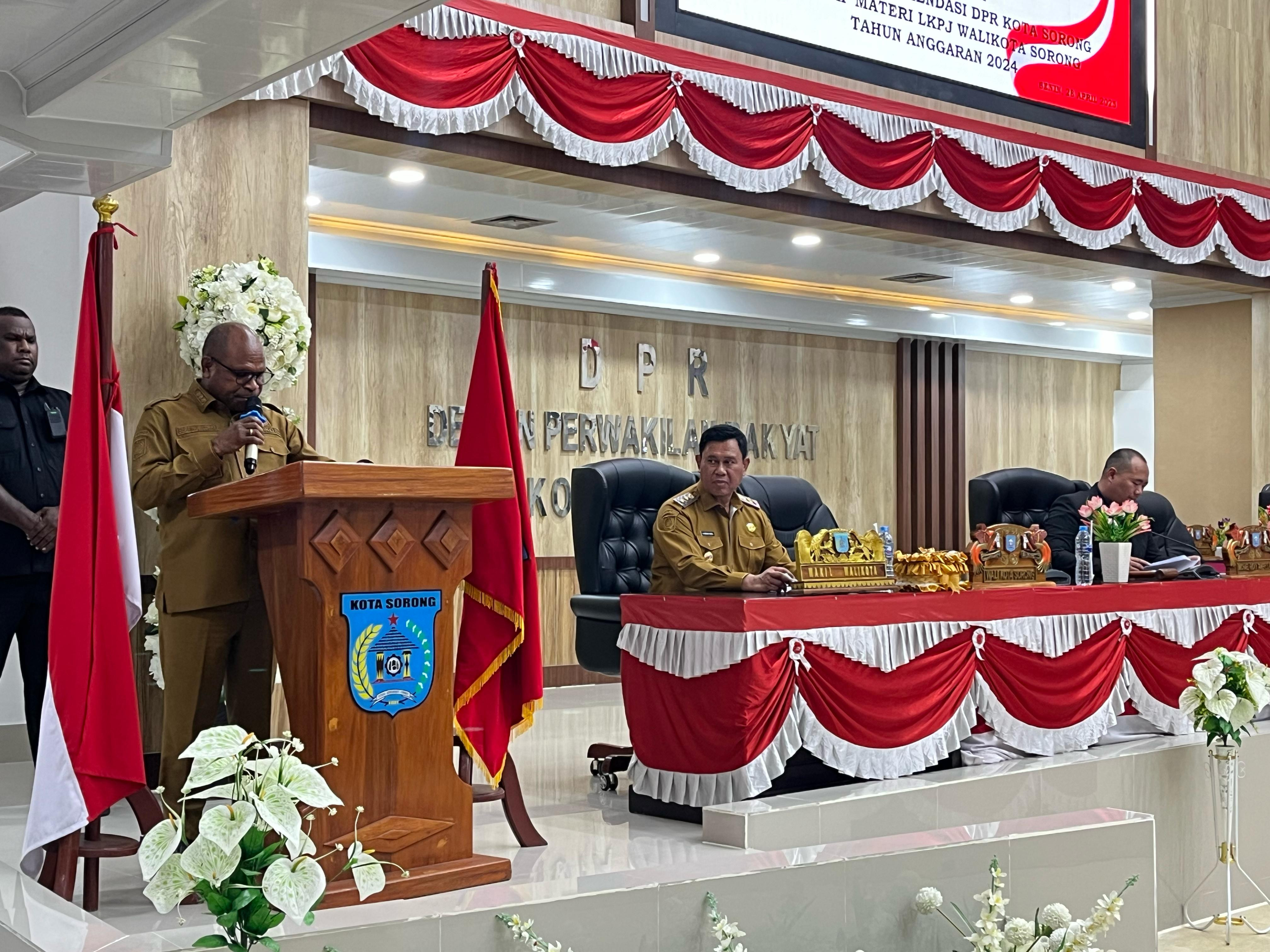 Dalam sambutan Wali Kota Sorong mengatakan Patut kita syukuri bersama dan penghargaan yang setinggi-tingginya kepada semua pihak yang telah berpartisipasi memberikan kontribusi, baik secara langsung, maupun tidak langsung terutama kepada dewan perwakilan rakyat daerah kota sorong. Terima kasih kami ucapkan atas catatan dan rekomendasi yang berupa catatan-catatan strategis yang berisikan saran, masukan dan atau koreksi terhadap penyelenggaraan urusan desentralisasi, tugas pembantu dan tugas umum pemerintahan selama tahun anggaran 2024. Keputusan itu dalam rangka perbaikan penyelenggaraan pemerintahan daerah kedepan, ucap Wali Kota Sorong.