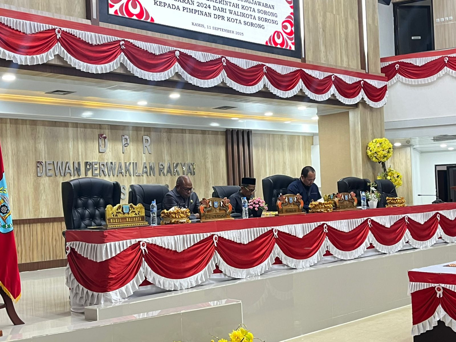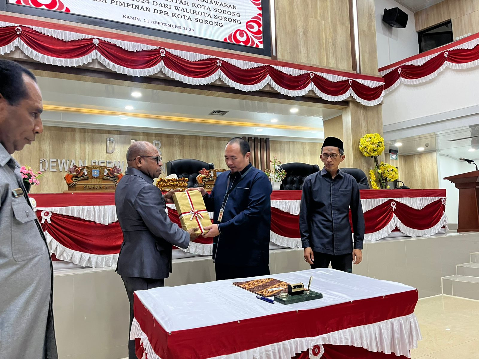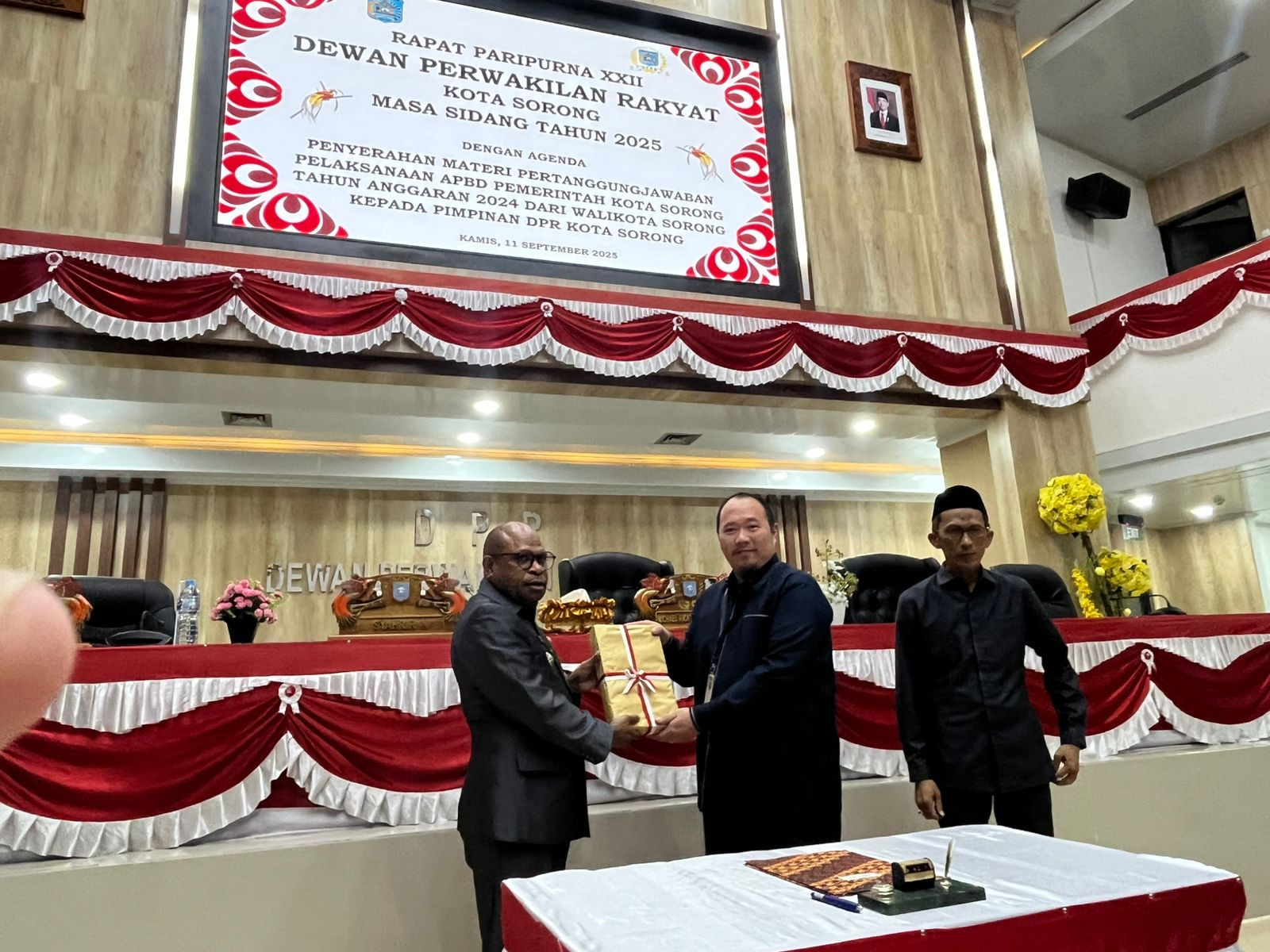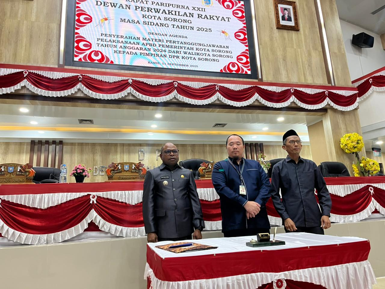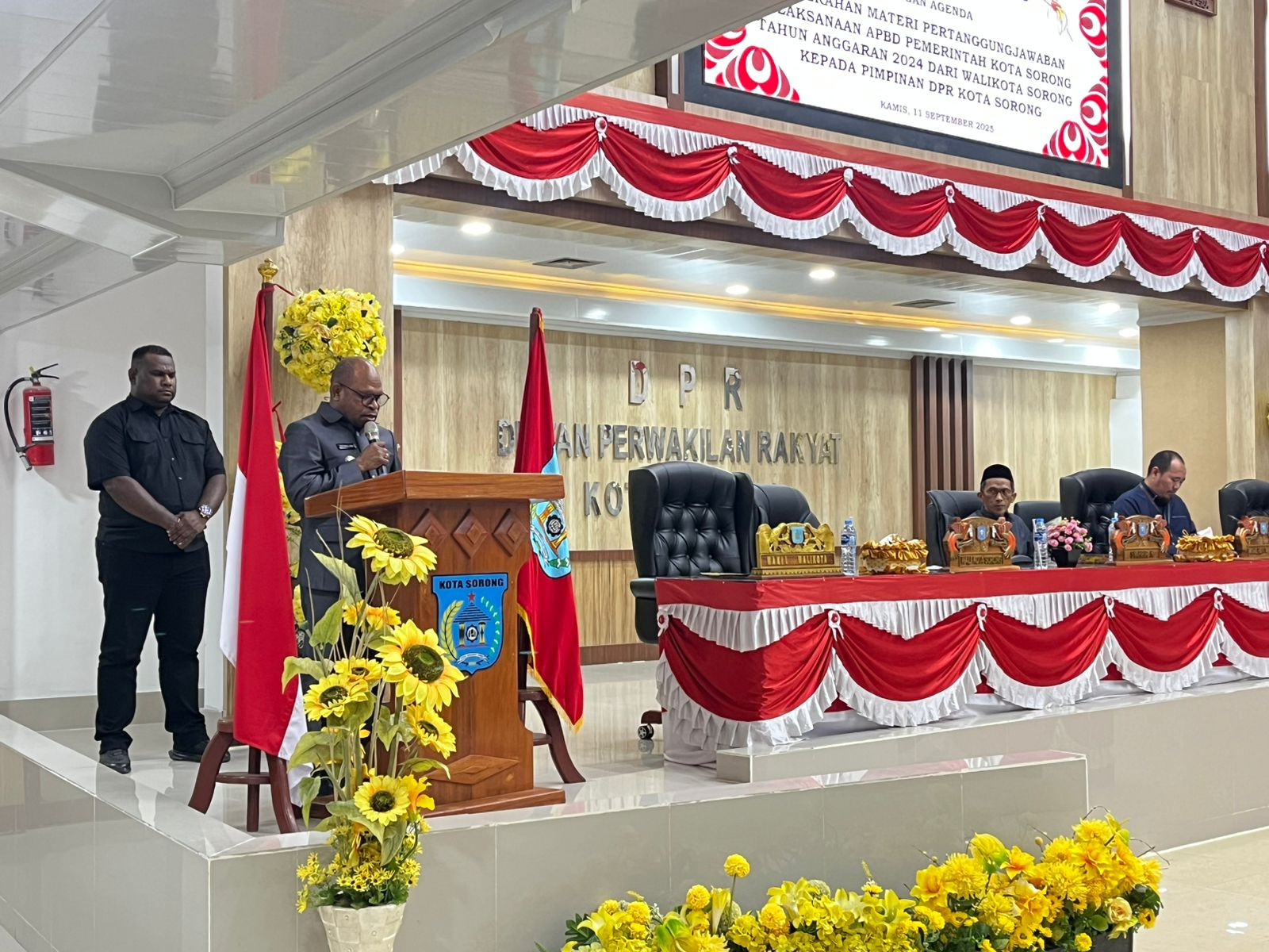 Kota Sorong-Wali Kota Sorong Septinus Lobat, S.H., MPA, bersama Plt. Sekda Kota Sorong dan para pimpinan OPD mengikuti rapat paripurna XXII Dewan Perwakilan Rakyat Kota Sorong dengan agenda penyerahan dan pembahasan materi Raperda tentang pertanggungjawaban pelaksanaan APBD Kota Sorong tahun anggaran 2024 Pemerintah Kota Sorong dari Wali Kota Sorong kepada Pimpinan DPR Kota Sorong yang berlangsung di ruang rapat kantor DPRD Kota Sorong. Kamis, (11/09/2025).
