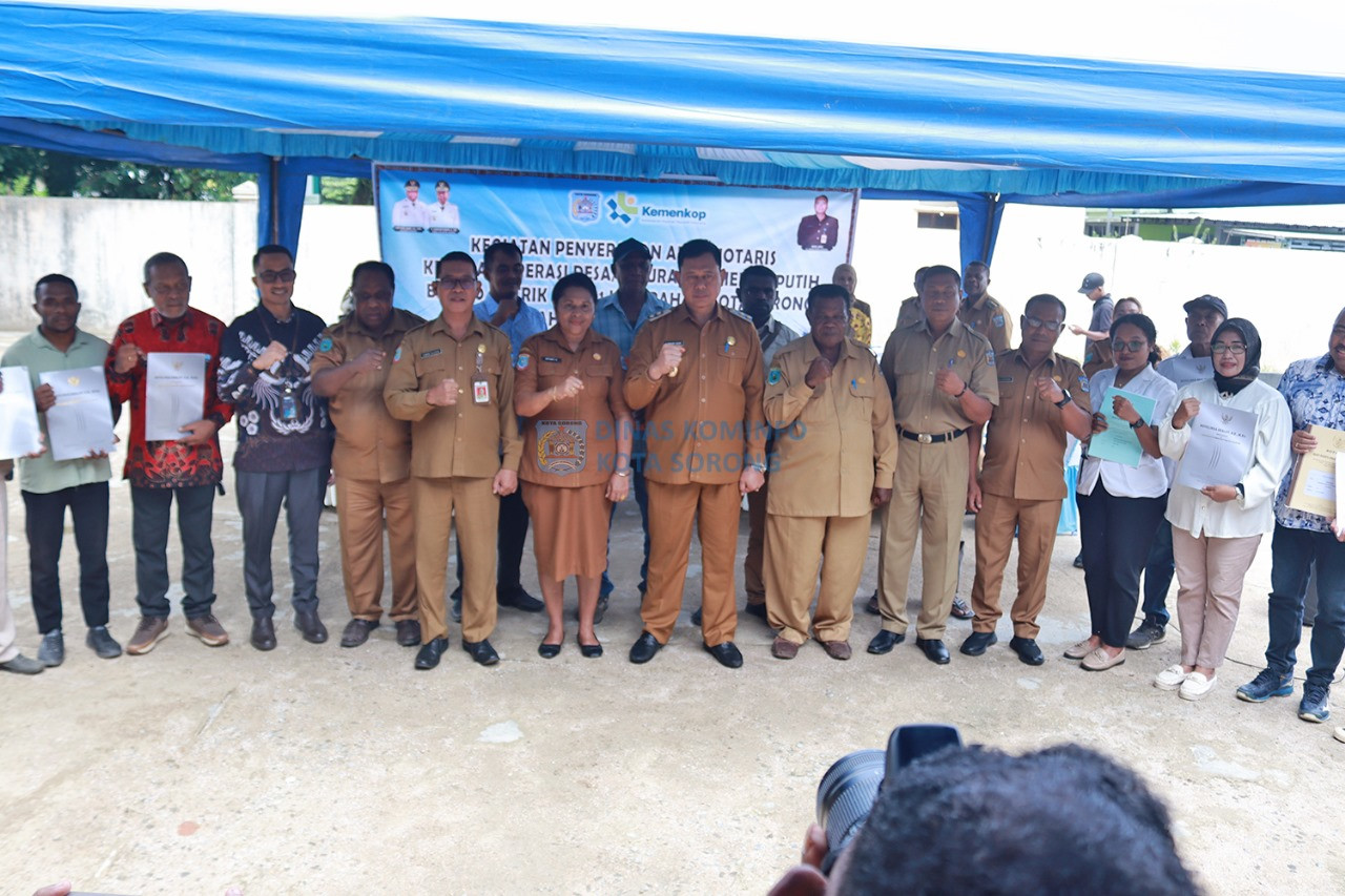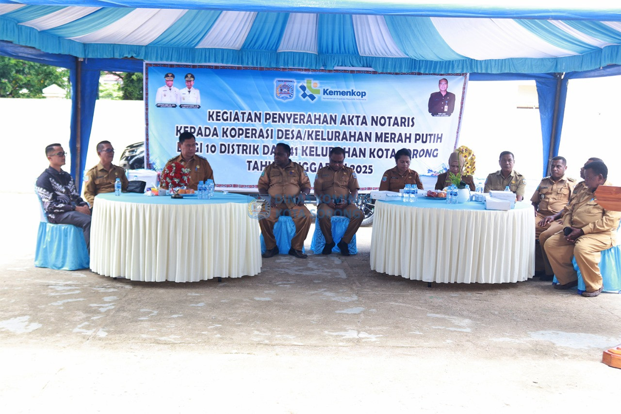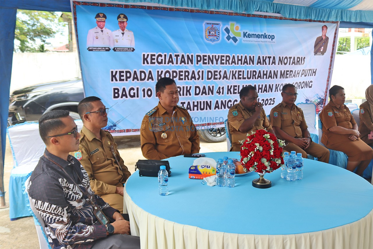 Kota Sorong - Wakil Wali Kota Sorong, Anshar Karim, A.Md., menyerahkan Akta Notaris kepada Koperasi Kelurahan Merah Putih (KKMP) bagi 10 Distrik dan 41 Kelurahan, yang dilaksanakan di Halaman Kantor Distrik Sorong, Selasa (15/7/2025), siang.