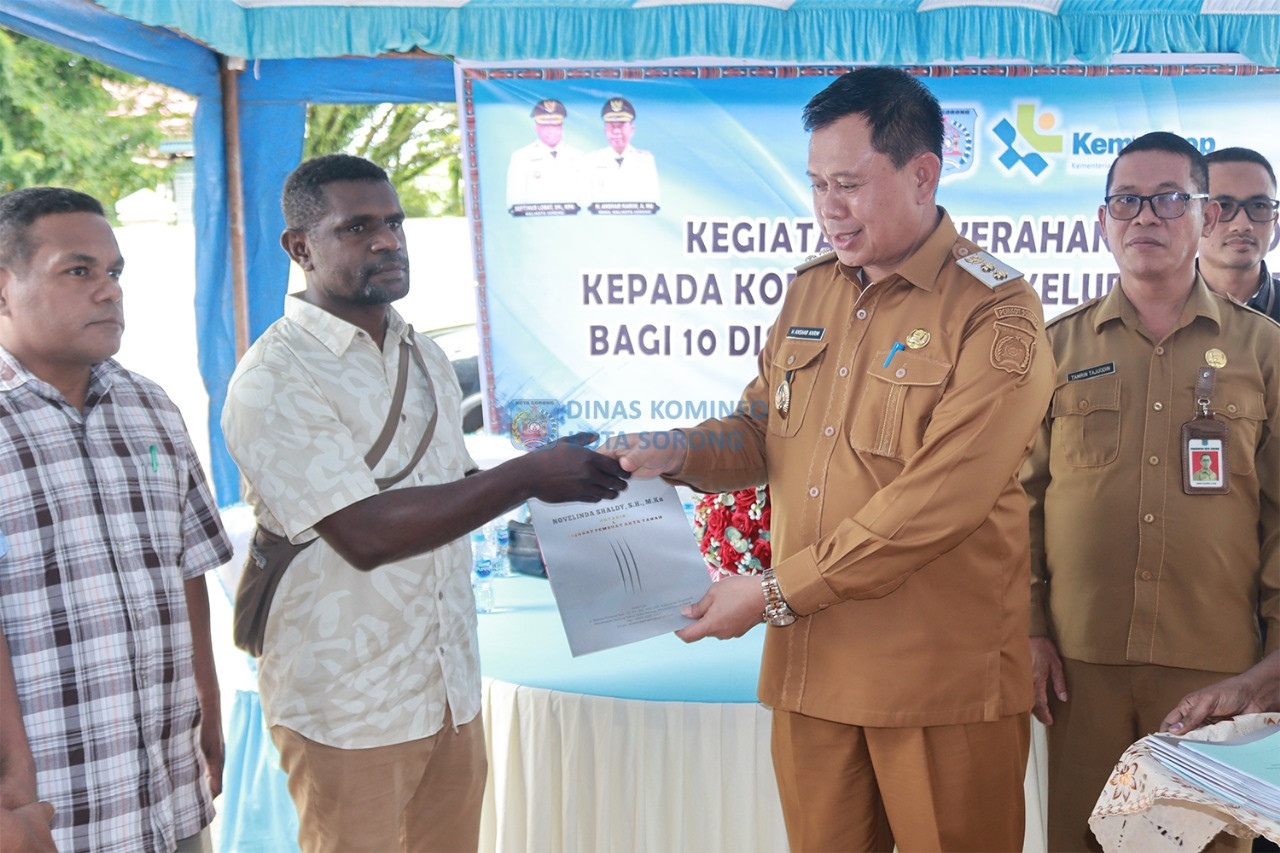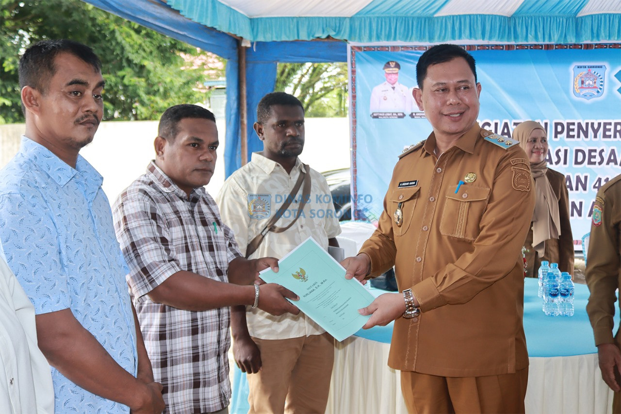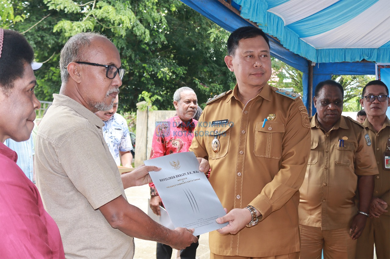 Kota Sorong - Wakil Wali Kota Sorong, Anshar Karim, A.Md., menyerahkan Akta Notaris kepada Koperasi Kelurahan Merah Putih (KKMP) bagi 10 Distrik dan 41 Kelurahan, yang dilaksanakan di Halaman Kantor Distrik Sorong, Selasa (15/7/2025), siang.