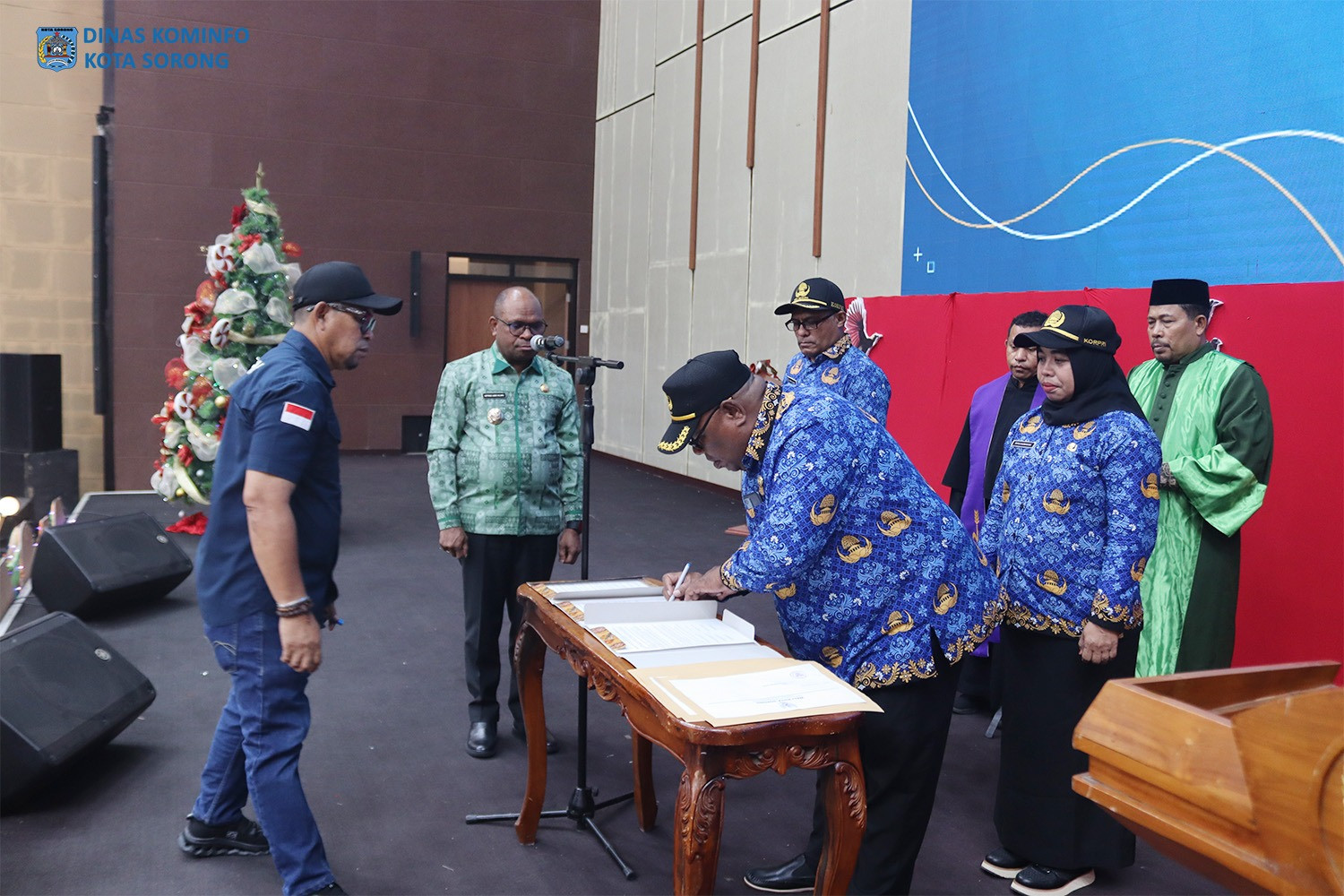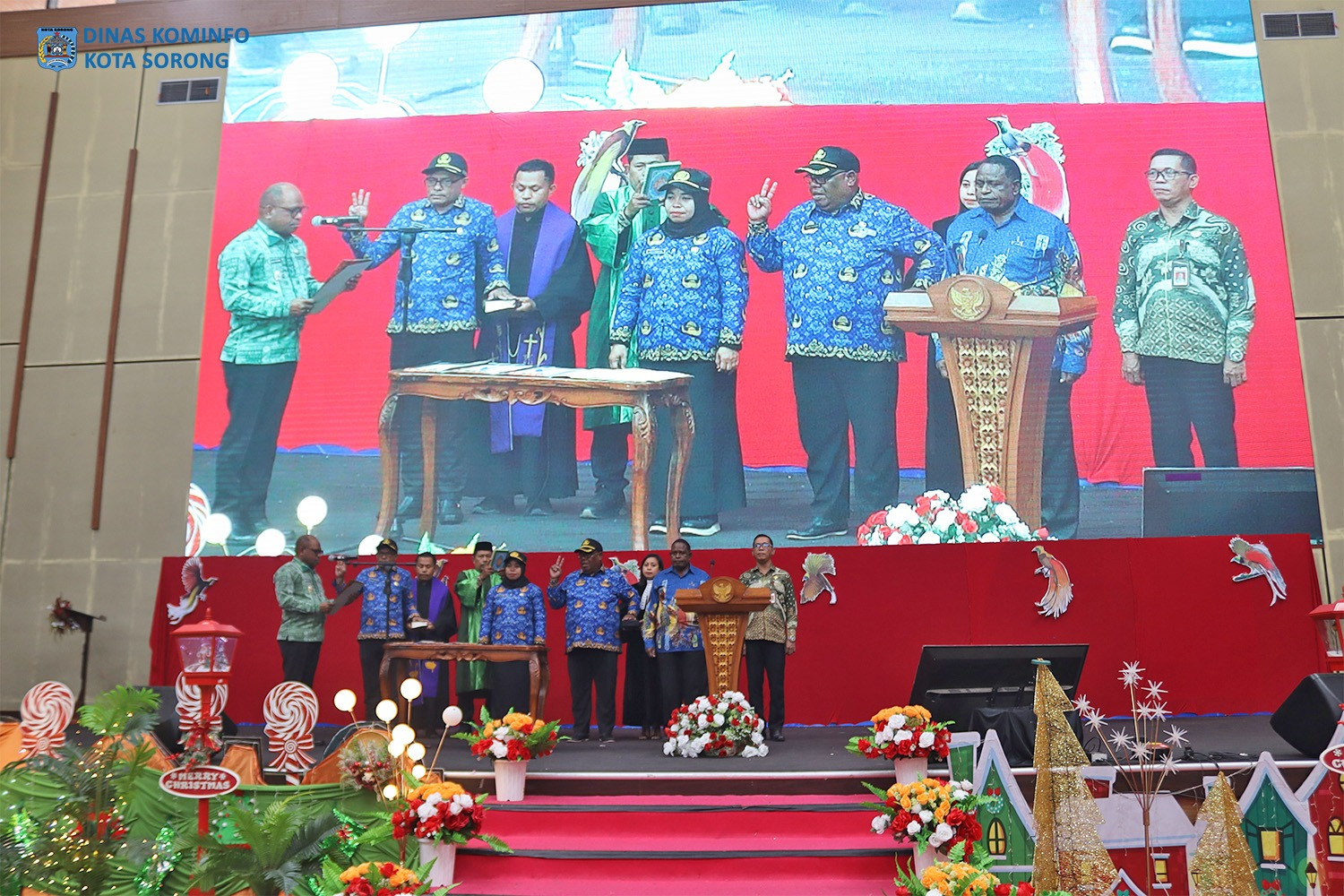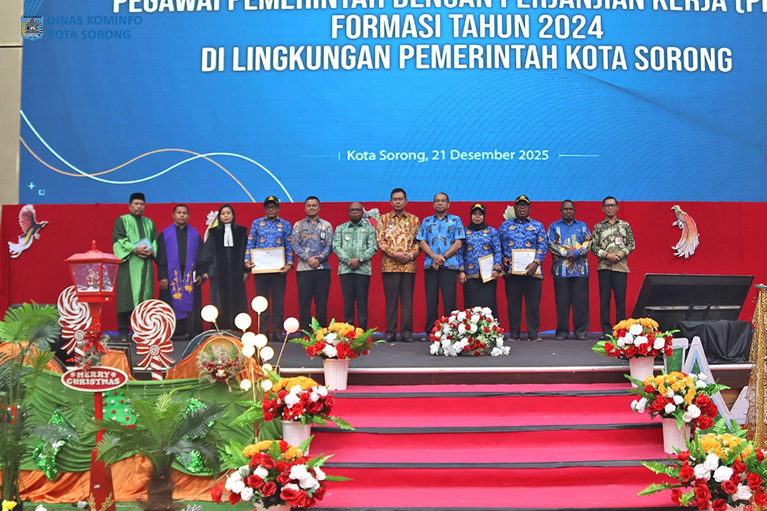 ππ¨ππ ππ¨π«π¨π§π - Wali Kota Sorong, Septinus Lobat, S.H., MPA, menekankan pentingnya disiplin, peningkatan kinerja, dan tanggung jawab sebagai aparatur negara, kepada 711 Pegawai Pemerintah dengan Perjanjian Kerja (PPPK) Formasi Tahun 2024, yang resmi menerima Surat Keputusan (SK) pengangkatan dalam kegiatan Pengambilan Sumpah Janji dan Penyerahan SK, yang digelar Badan Kepegawaian dan Pengembangan Sumber Daya Manusia (BKPSDM) Kota Sorong di Gedung Lambert Jitmau, Minggu (21/12/2025).