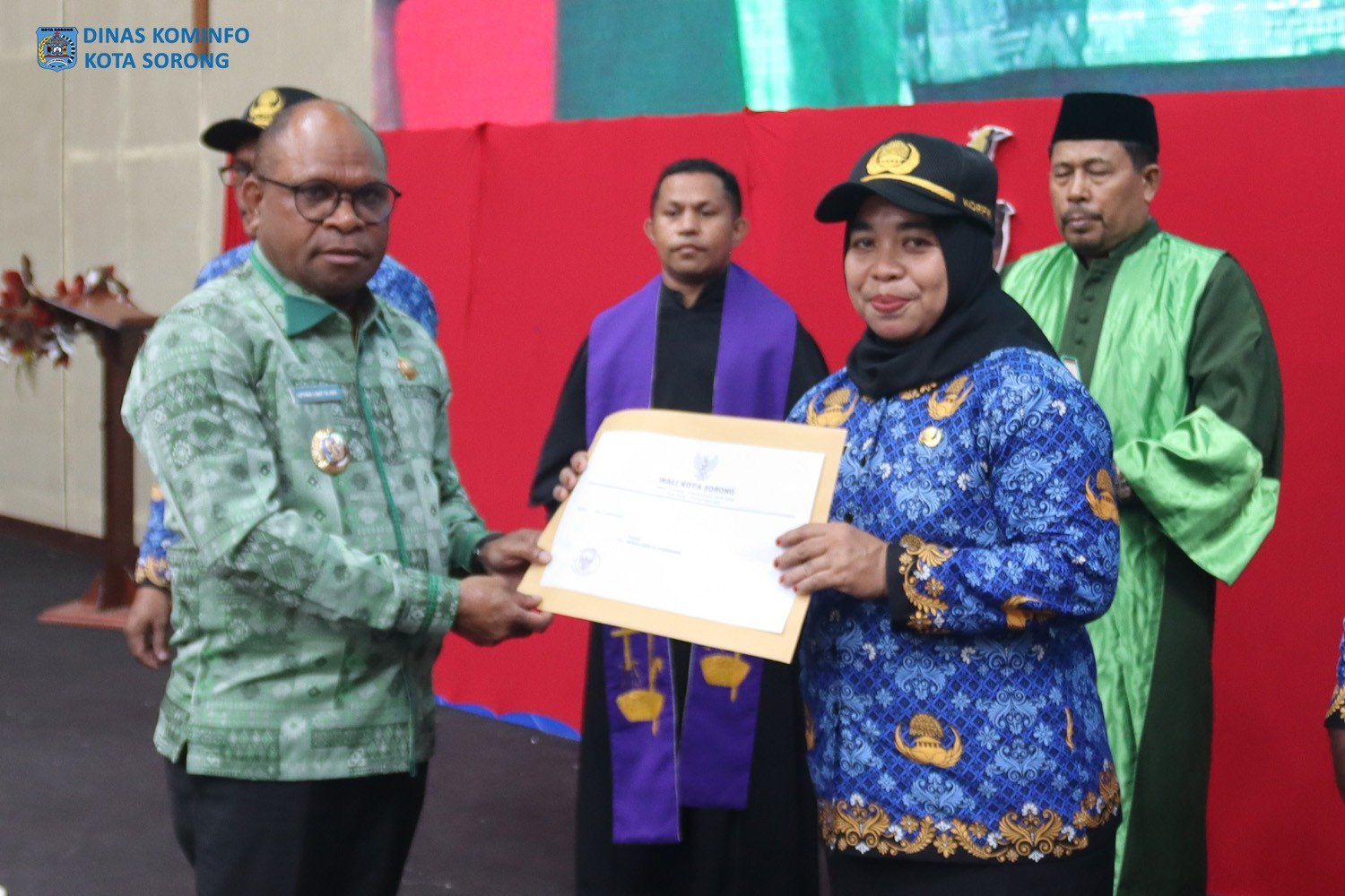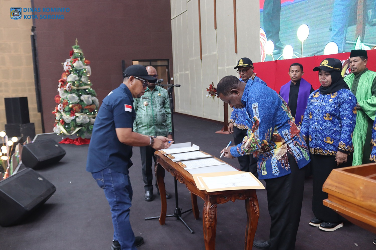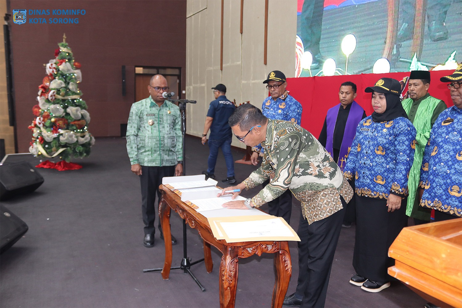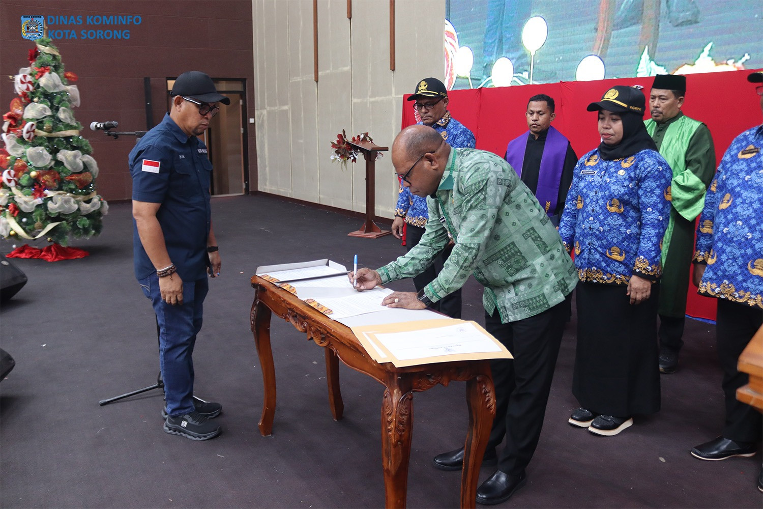 ππ¨ππ ππ¨π«π¨π§π - Wali Kota Sorong, Septinus Lobat, S.H., MPA, menekankan pentingnya disiplin, peningkatan kinerja, dan tanggung jawab sebagai aparatur negara, kepada 711 Pegawai Pemerintah dengan Perjanjian Kerja (PPPK) Formasi Tahun 2024, yang resmi menerima Surat Keputusan (SK) pengangkatan dalam kegiatan Pengambilan Sumpah Janji dan Penyerahan SK, yang digelar Badan Kepegawaian dan Pengembangan Sumber Daya Manusia (BKPSDM) Kota Sorong di Gedung Lambert Jitmau, Minggu (21/12/2025).