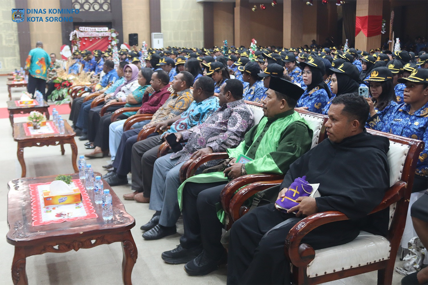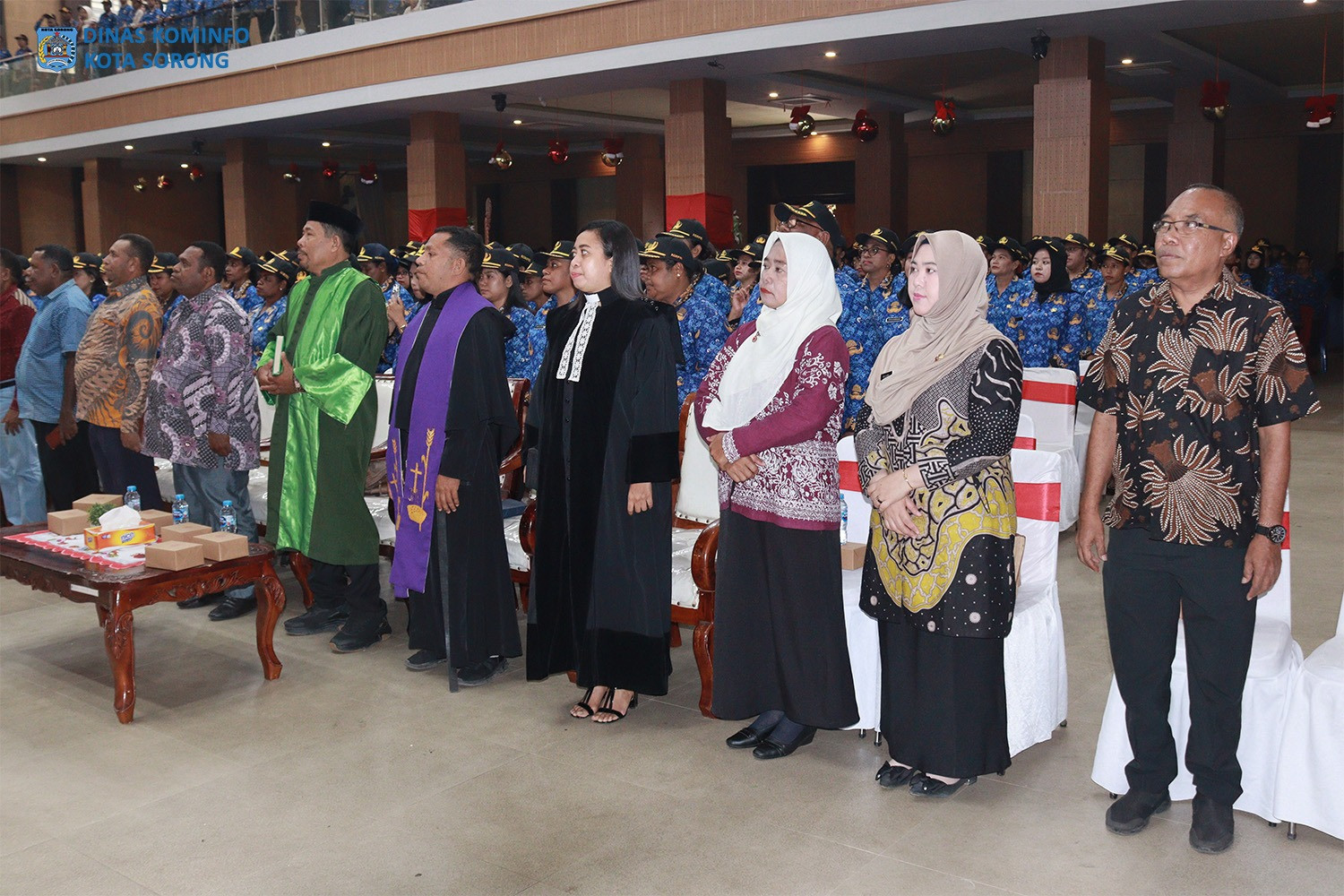 Prosesi pengambilan sumpah janji dan penyerahan SK PPPK Formasi Tahun 2024 dipimpin oleh Wali Kota Sorong dan Wakil Wali Kota Sorong, serta dihadiri Plt. Sekda Kota Sorong, pimpinan Organisasi Perangkat Daerah (OPD), para rohaniawan, dan keluarga PPPK. (π«πππππππππ π²πππ πΊπππππ)
